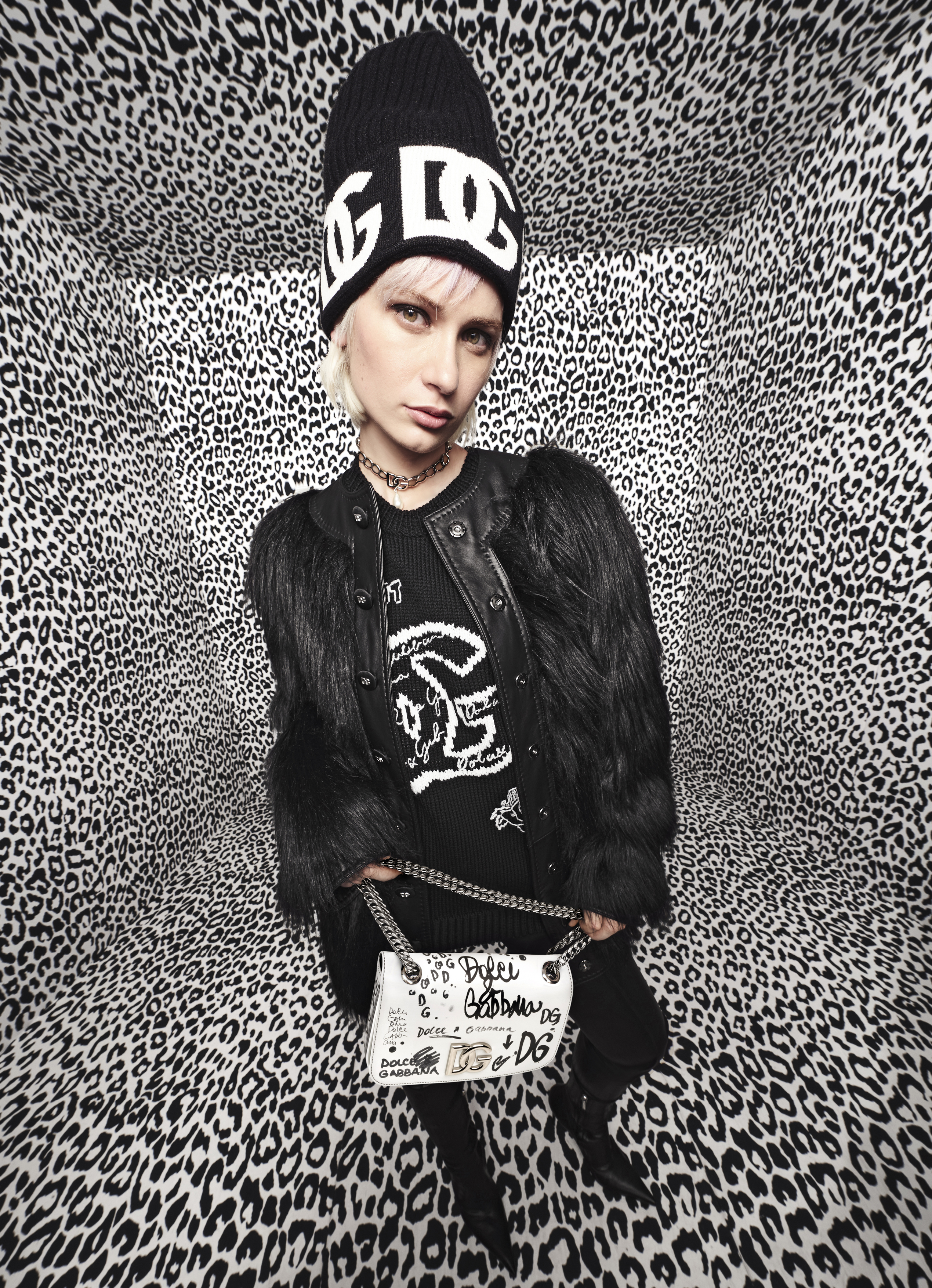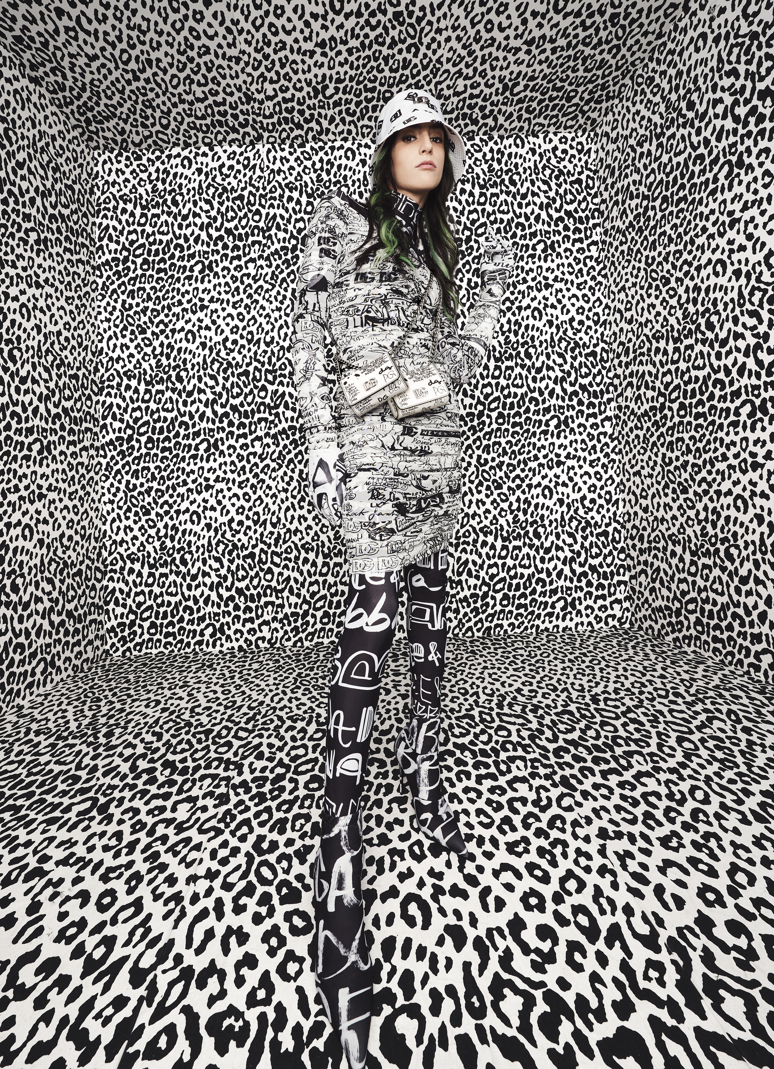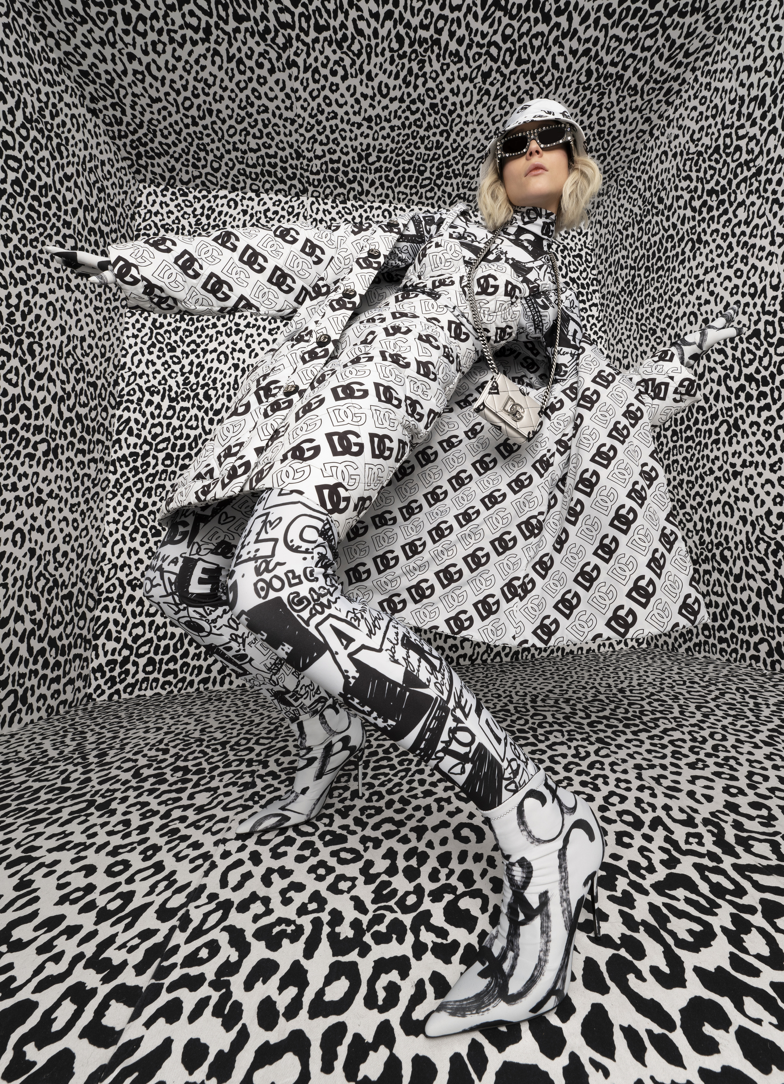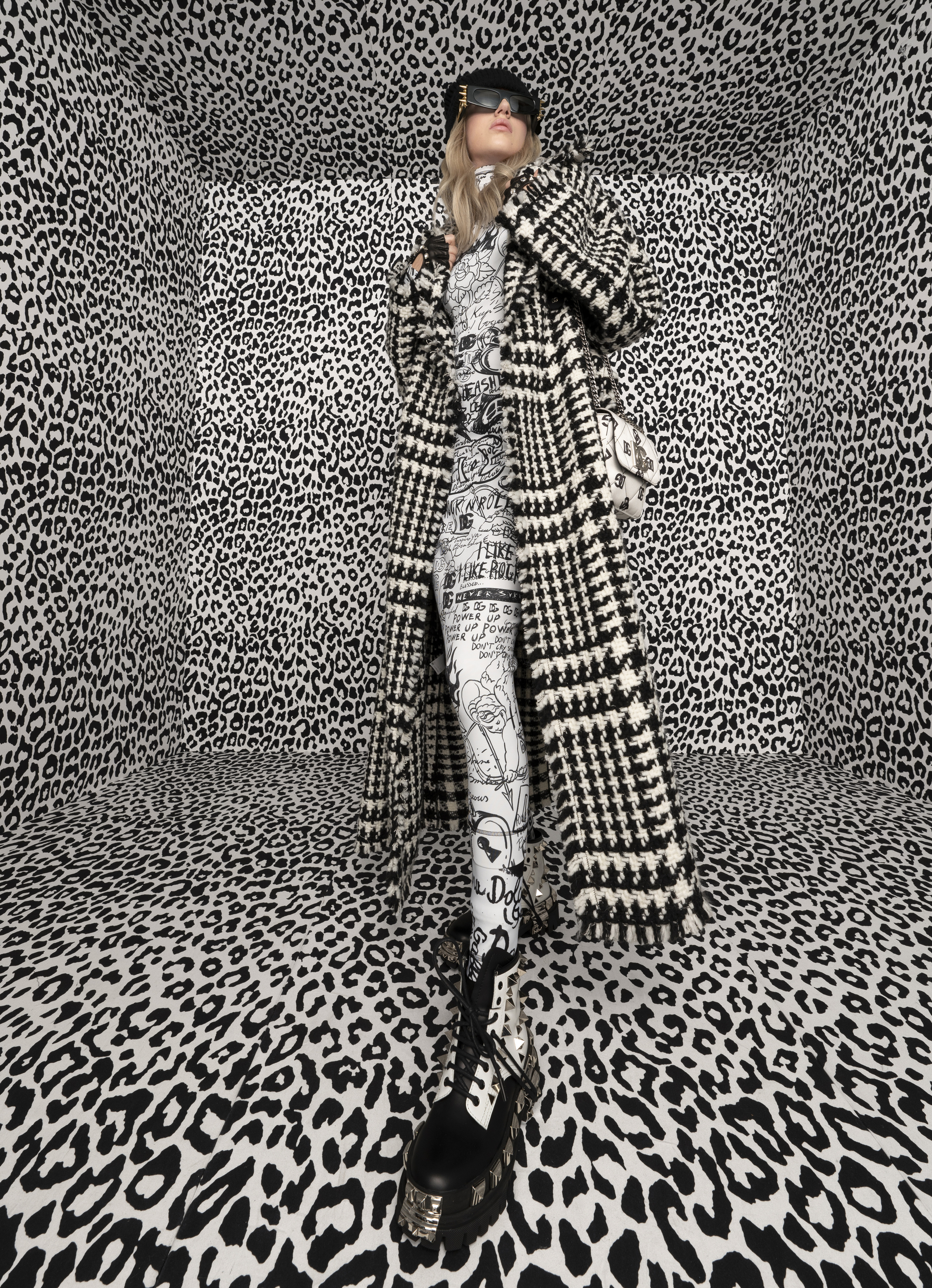 In a game of contrasts of volumes, new silhouettes envelop the women's bodies with important shoulders, zips, shortened dresses and denim cuissards. Bomber jackets and trousers in Sicilian black leather alternate with funny eco-furs. Defined by a unique cheeky and mysterious personality, the looks are composed of a mix of optical patterns and hyper-graphic logos.