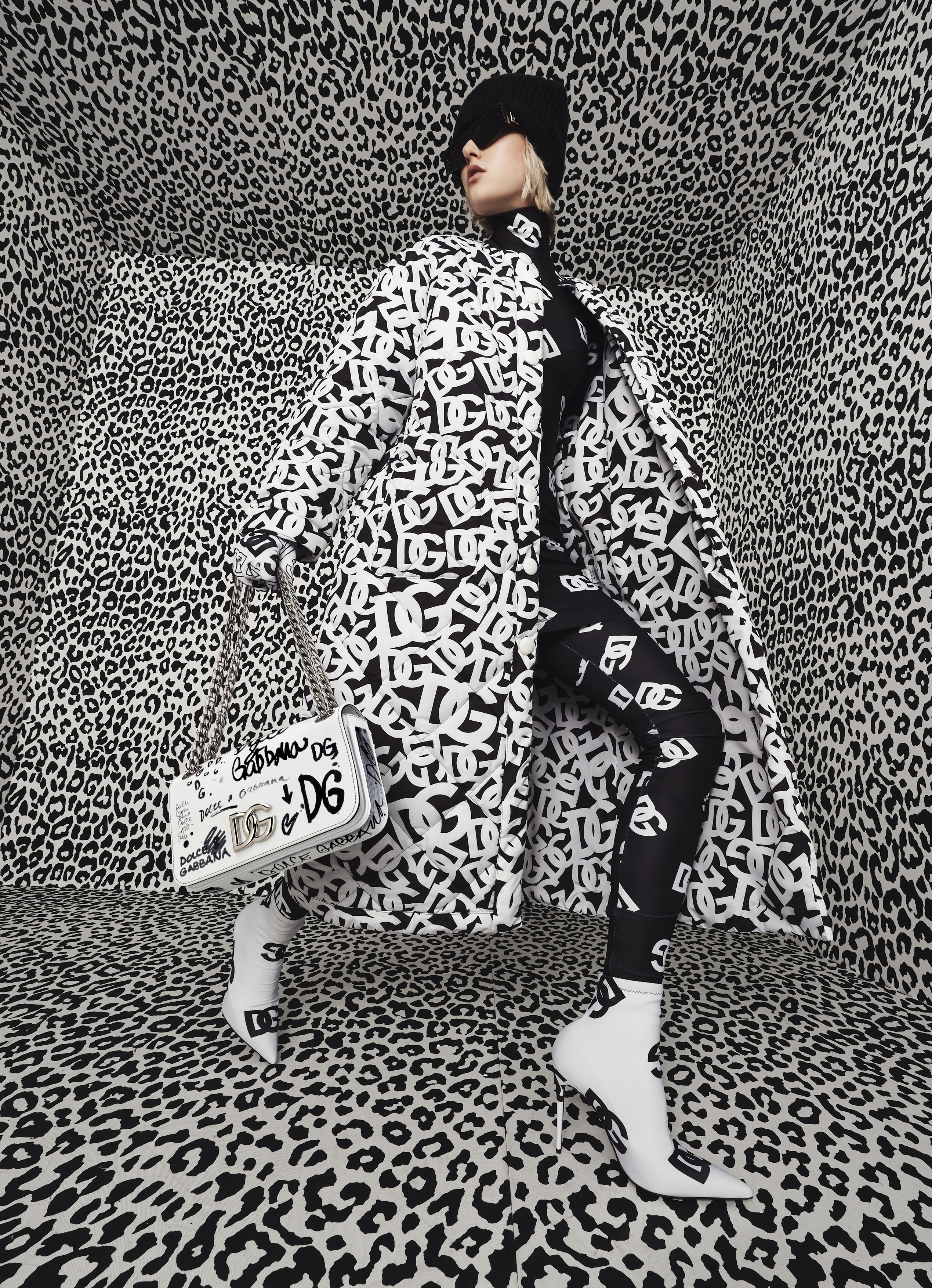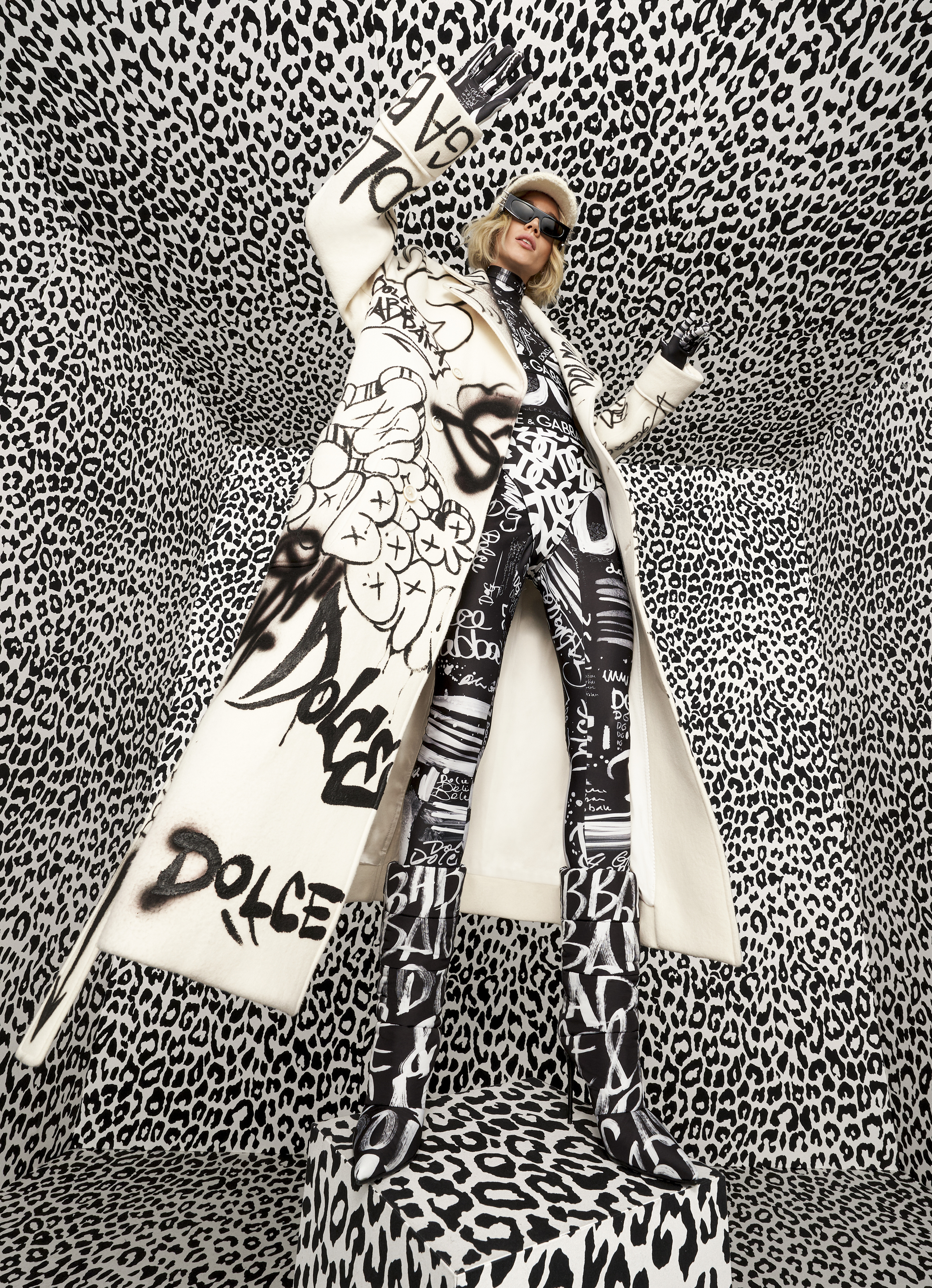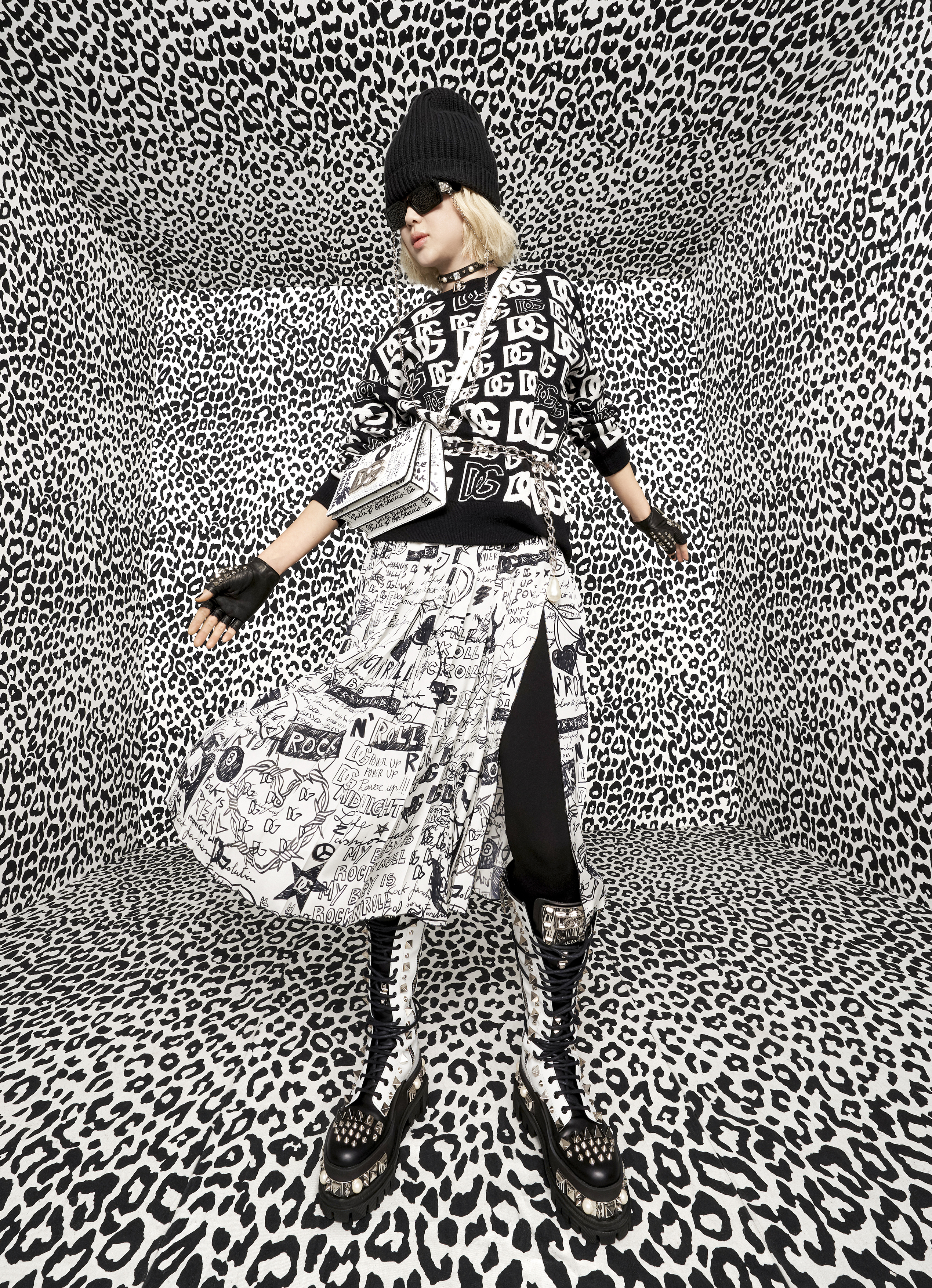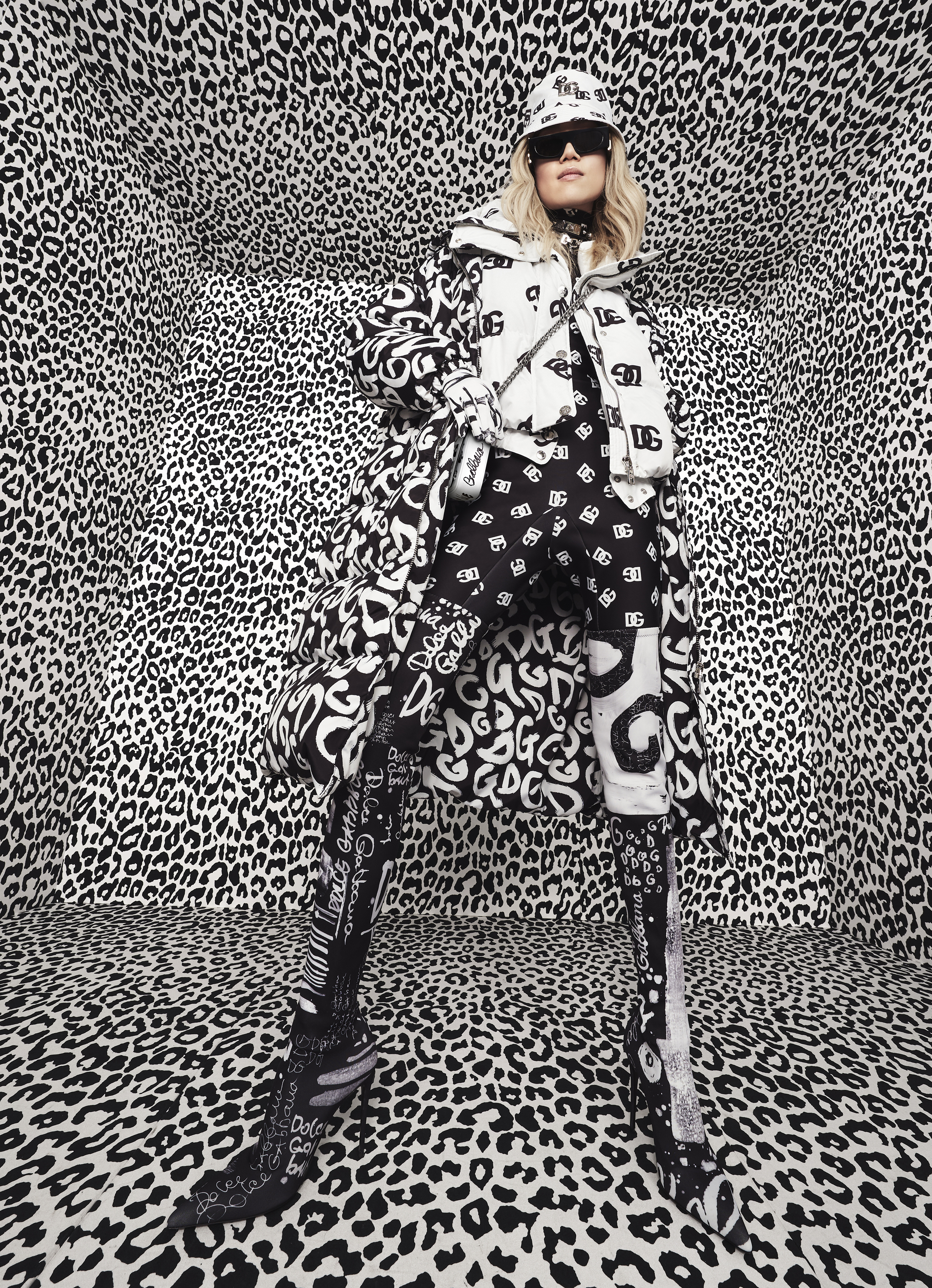 In a game of contrasts of volumes, new silhouettes envelop the women's bodies with important shoulders, zips, shortened dresses and denim cuissards. Bomber jackets and trousers in Sicilian black leather alternate with funny eco-furs. Defined by a unique cheeky and mysterious personality, the looks are composed of a mix of optical patterns and hyper-graphic logos.