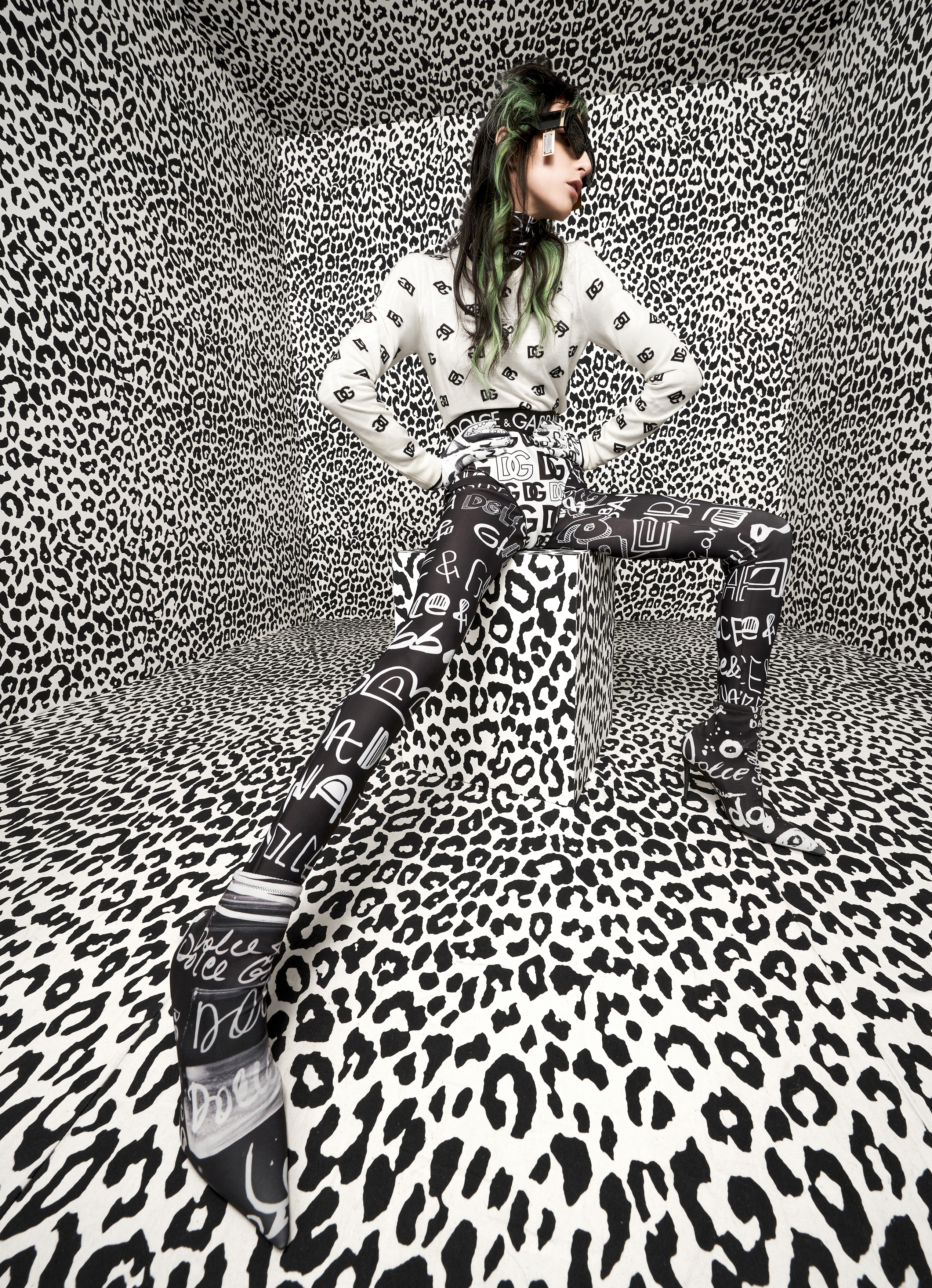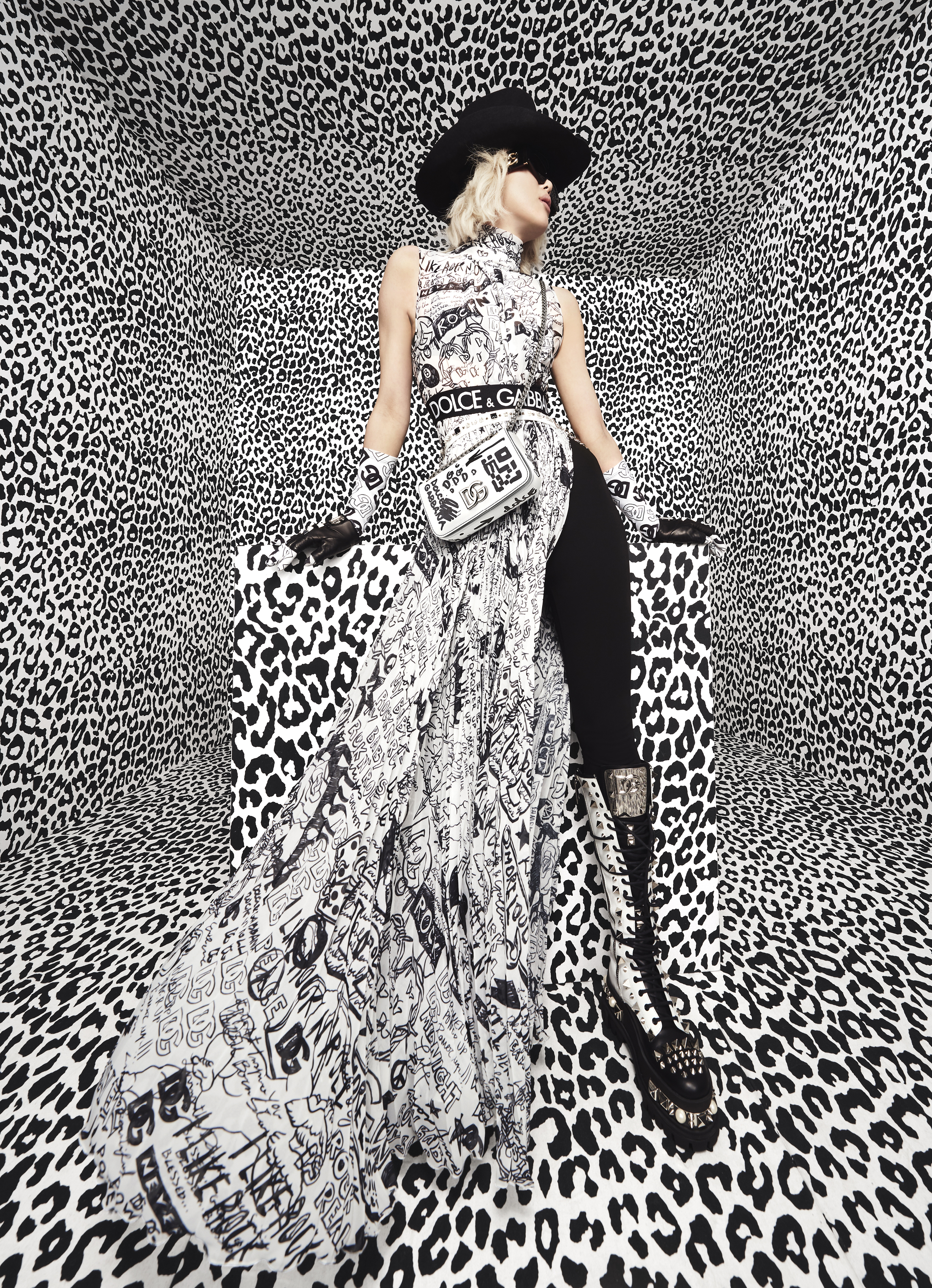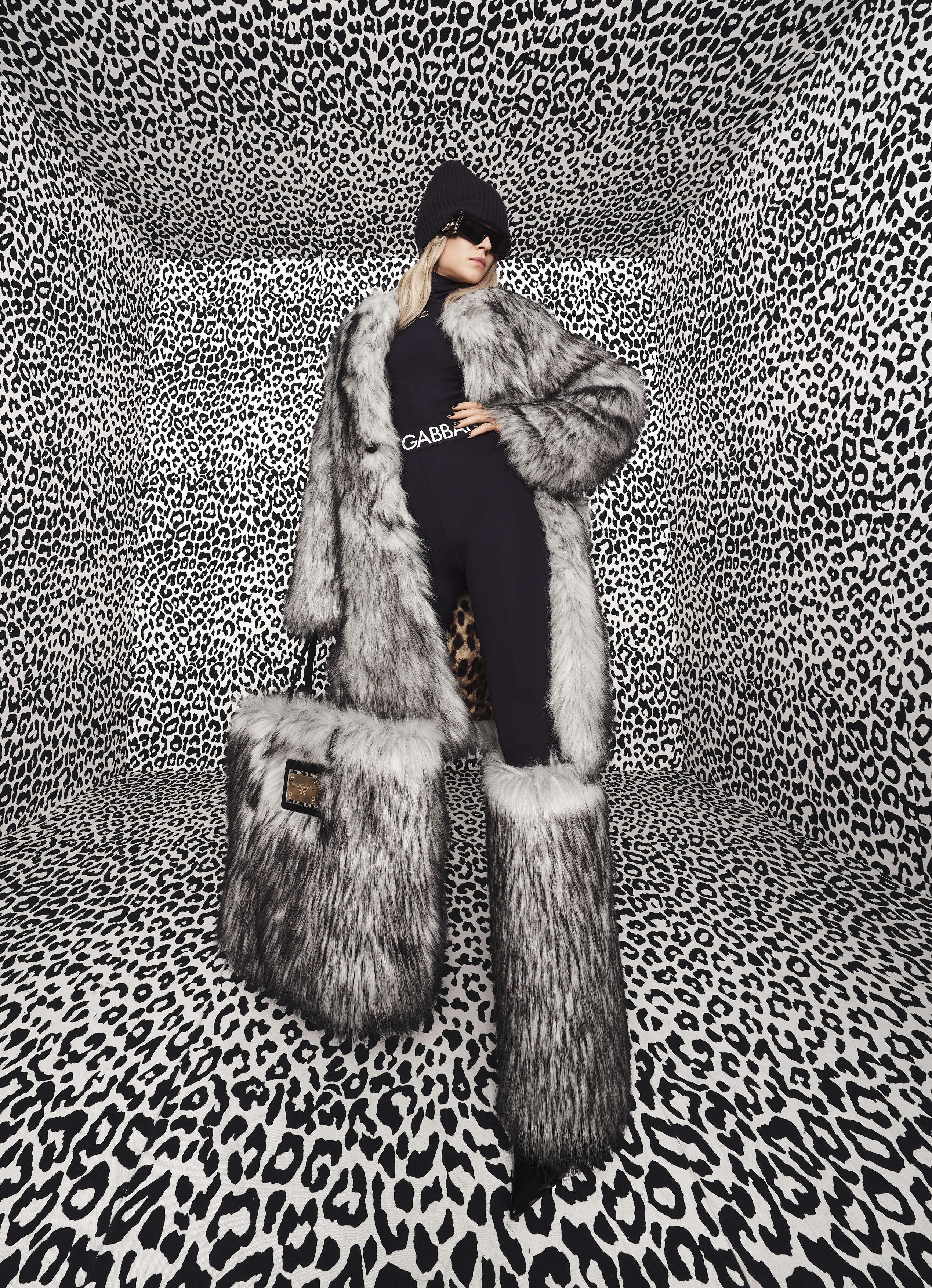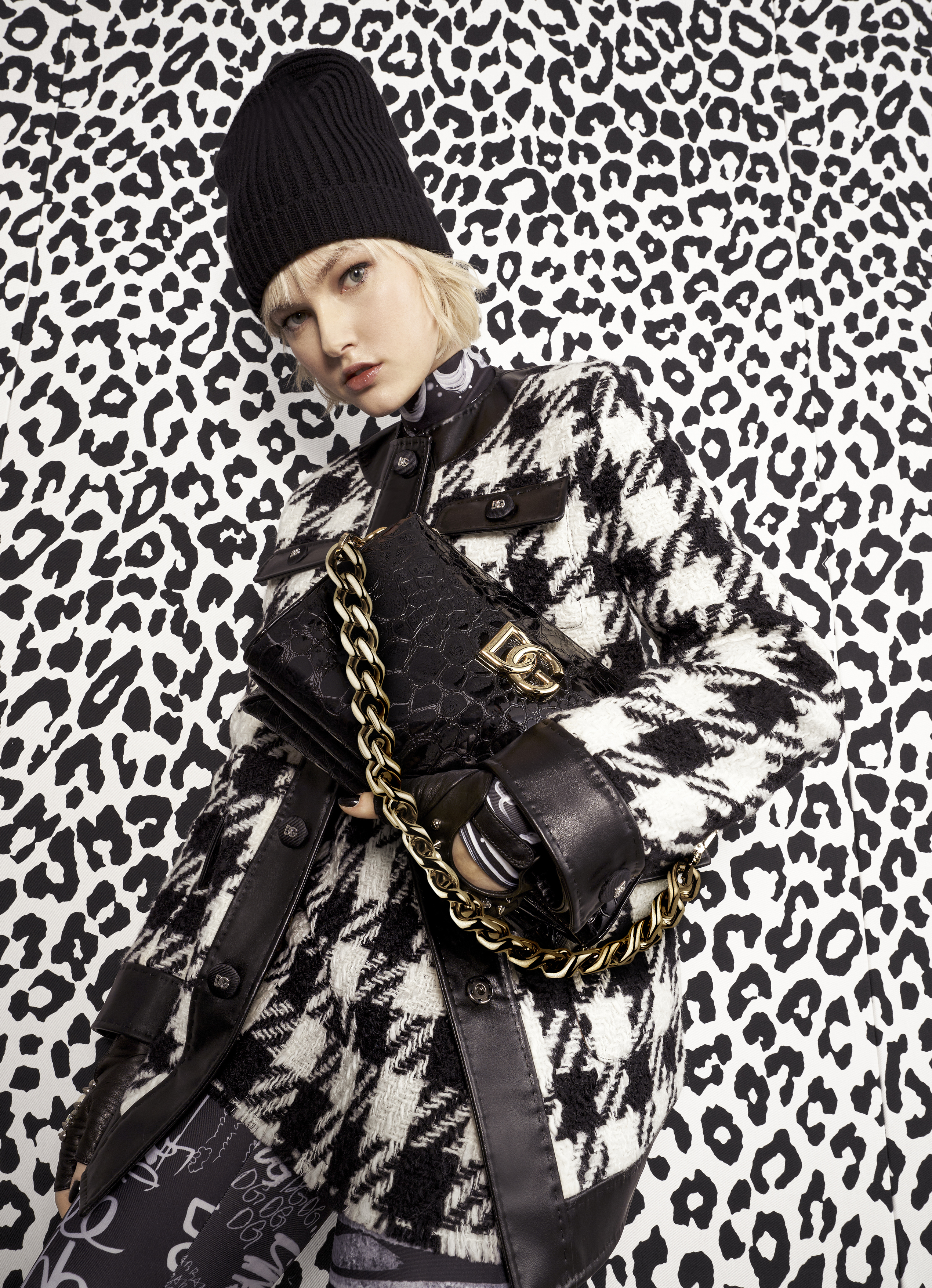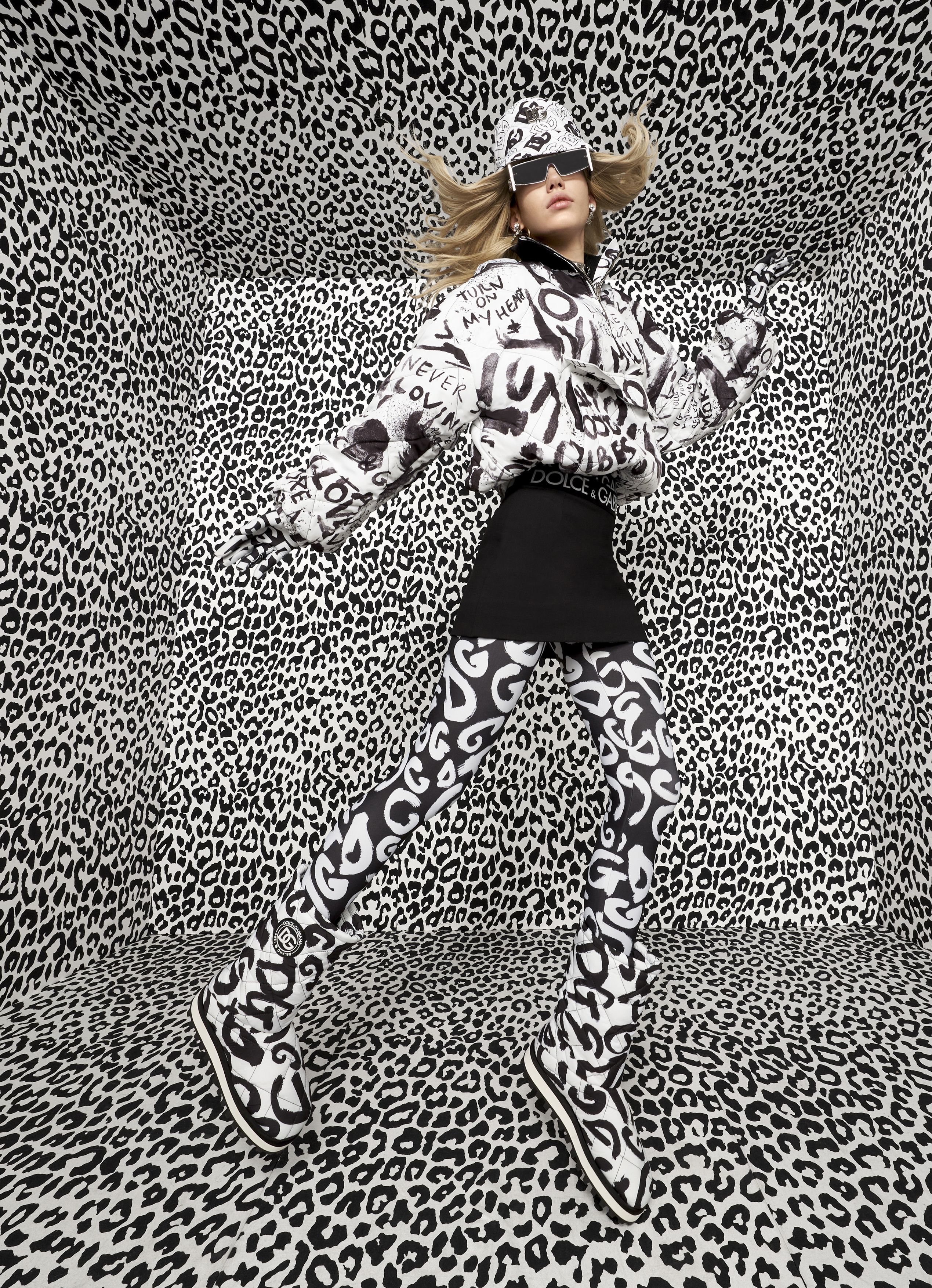 In a game of contrasts of volumes, new silhouettes envelop the women's bodies with important shoulders, zips, shortened dresses and denim cuissards. Bomber jackets and trousers in Sicilian black leather alternate with funny eco-furs. Defined by a unique cheeky and mysterious personality, the looks are composed of a mix of optical patterns and hyper-graphic logos.