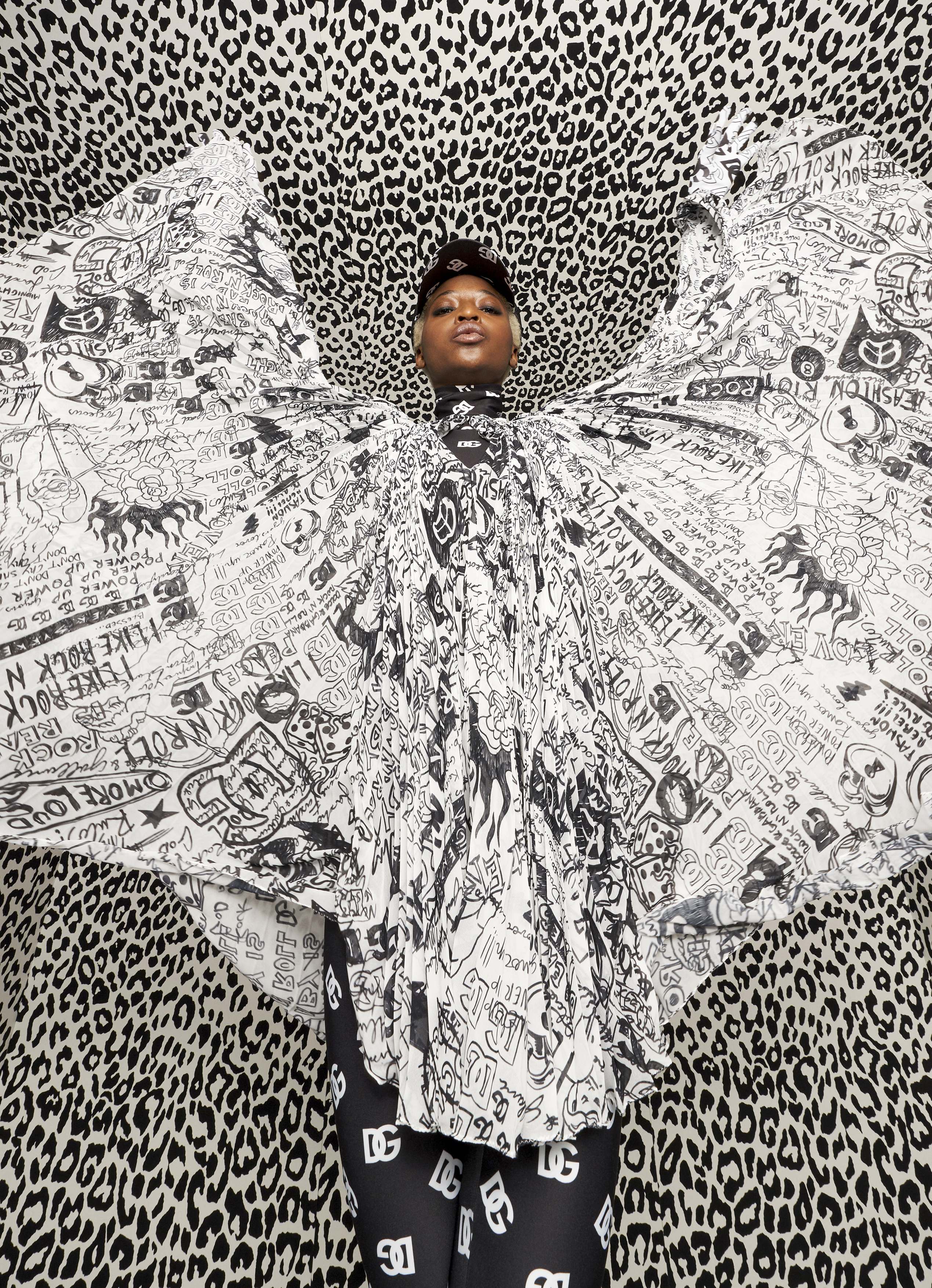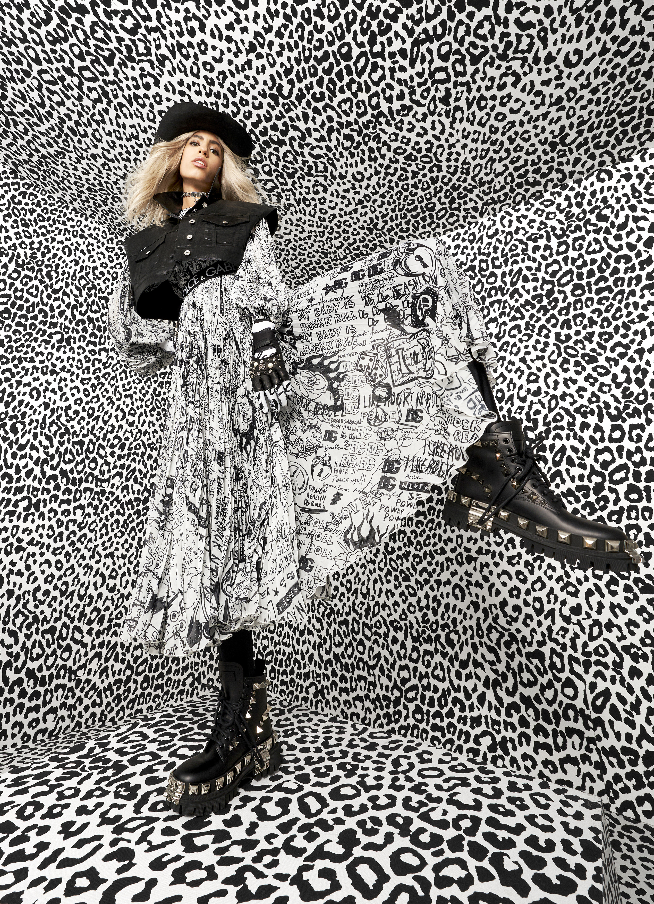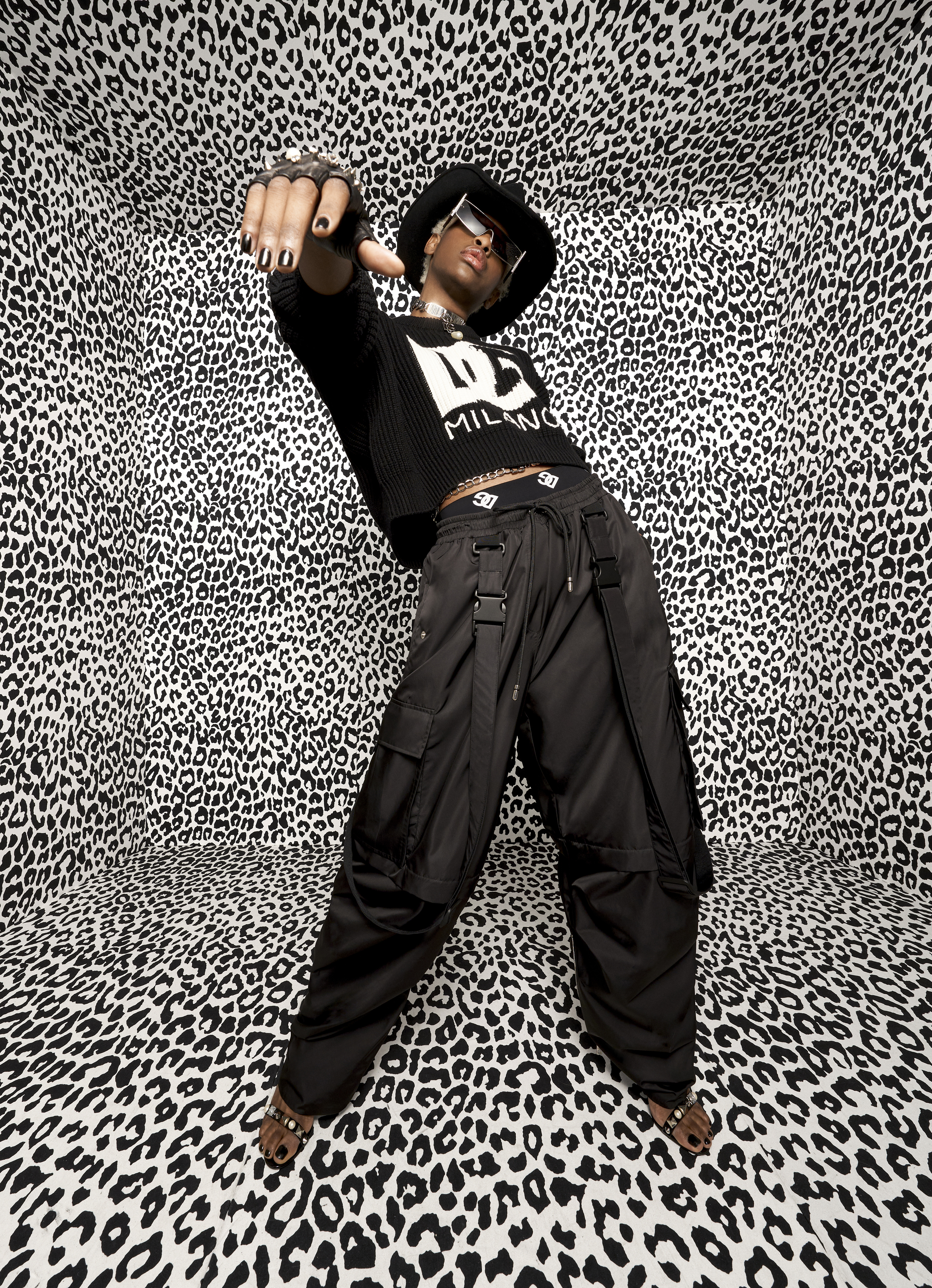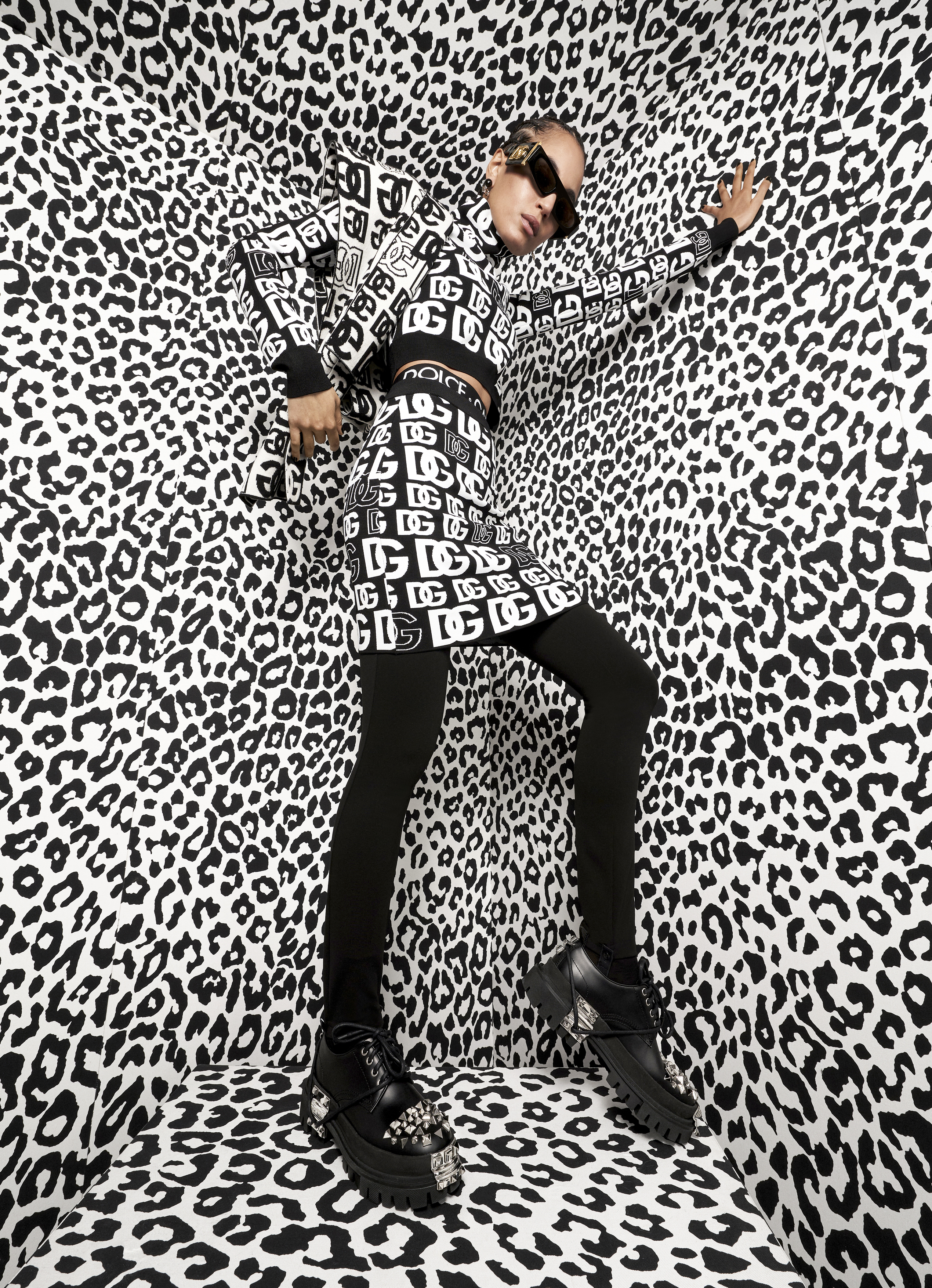 In a game of contrasts of volumes, new silhouettes envelop the women's bodies with important shoulders, zips, shortened dresses and denim cuissards. Bomber jackets and trousers in Sicilian black leather alternate with funny eco-furs. Defined by a unique cheeky and mysterious personality, the looks are composed of a mix of optical patterns and hyper-graphic logos.