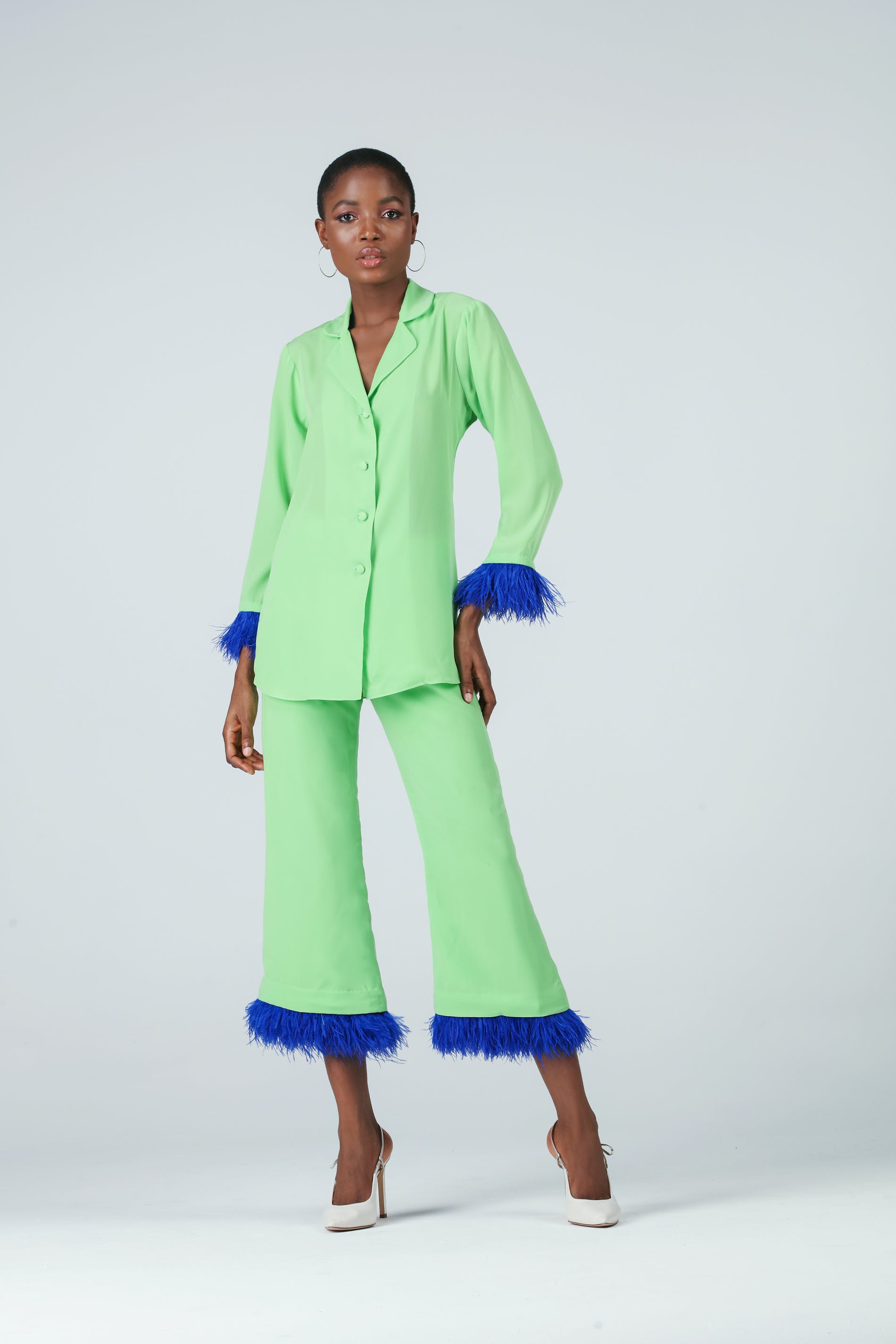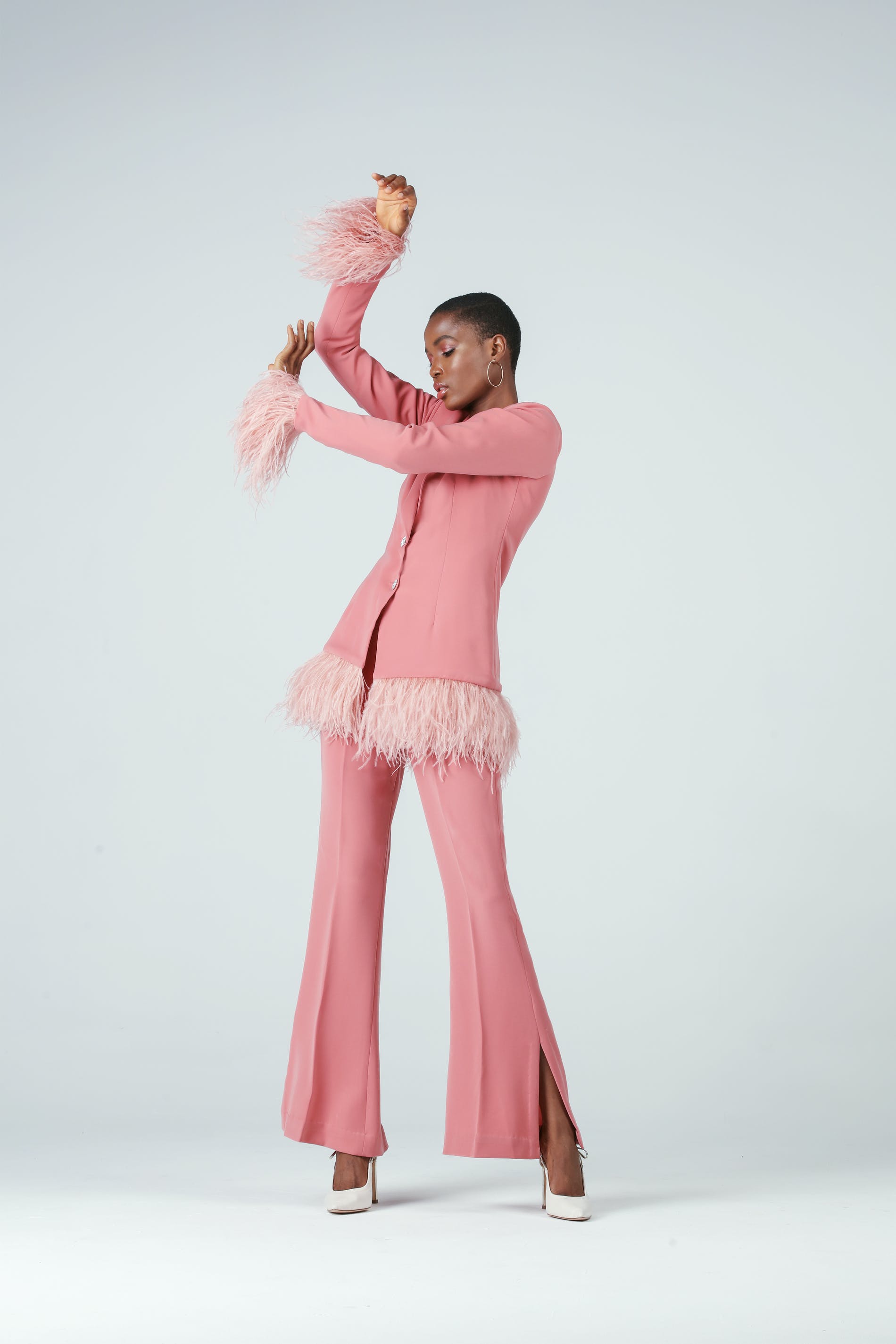 Featuring a vast spectrum of colours, the collection includes structured jackets and trousers, softened with pale colours such as baby pinks and blues. The evening wear includes royal blues, vibrant crimsons and sparkling midnight blacks. Alina Anwar is famous for its use of different textiles including feathers, sequins and glitter, adding unique dimensions to each look.