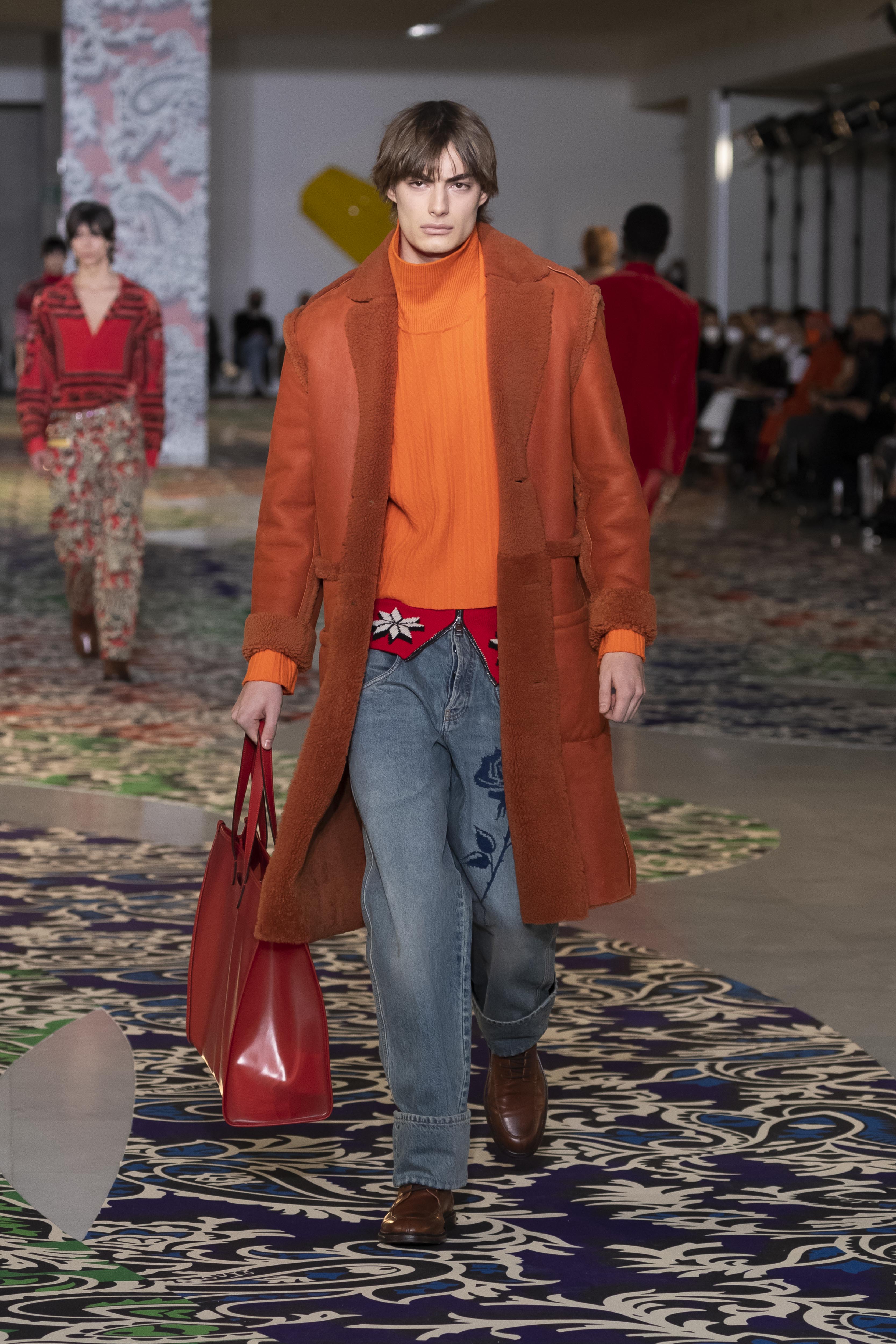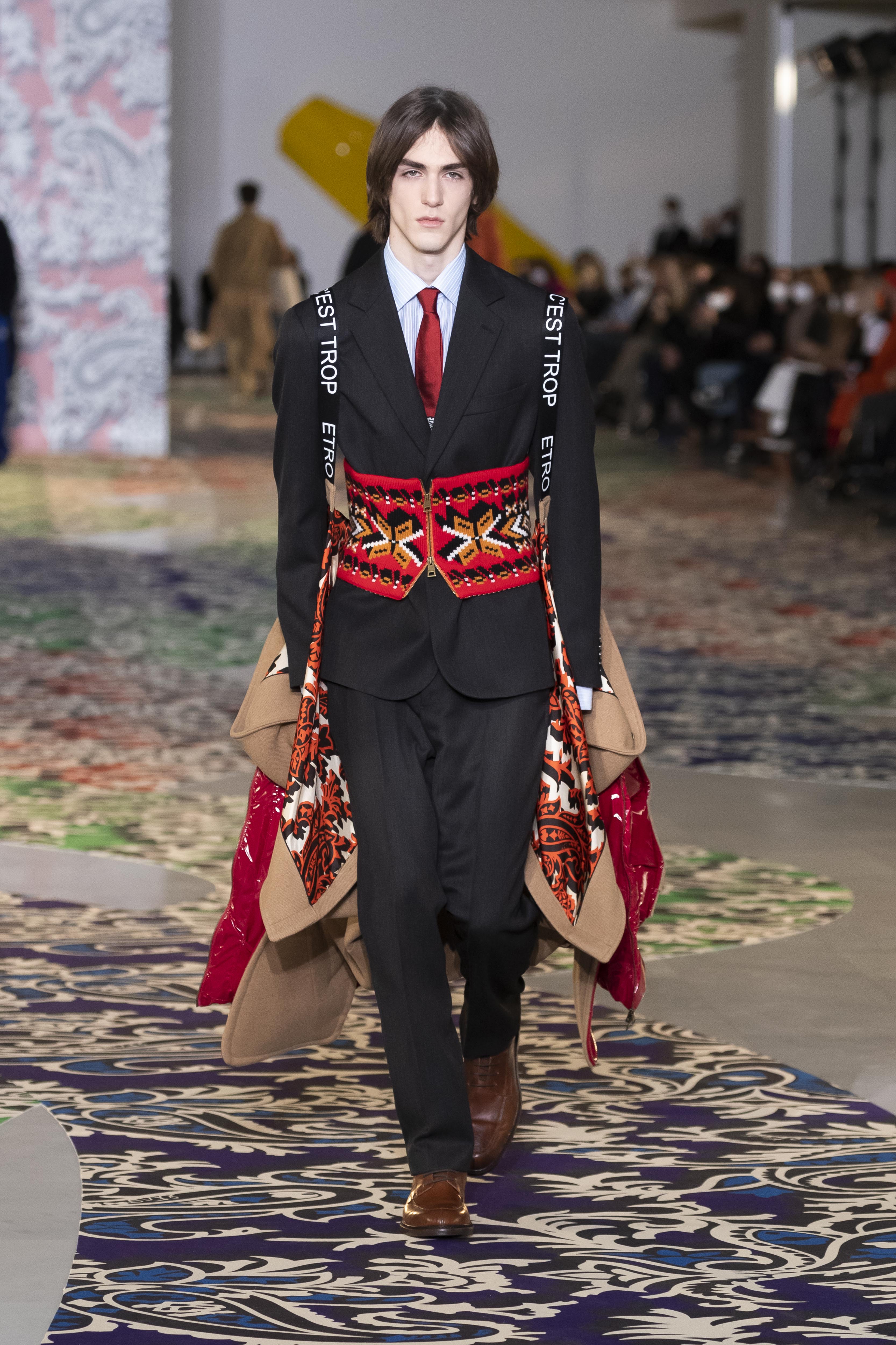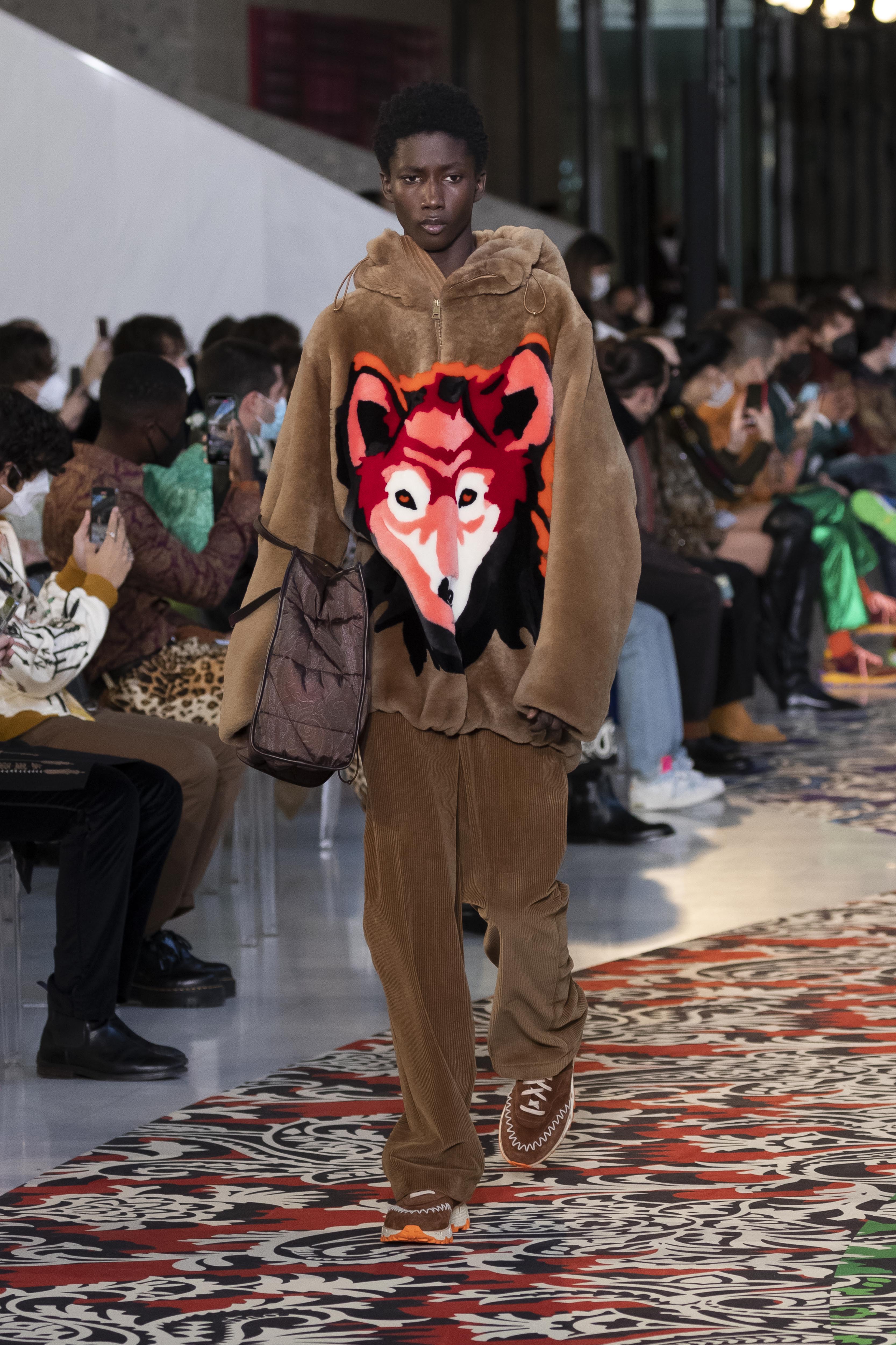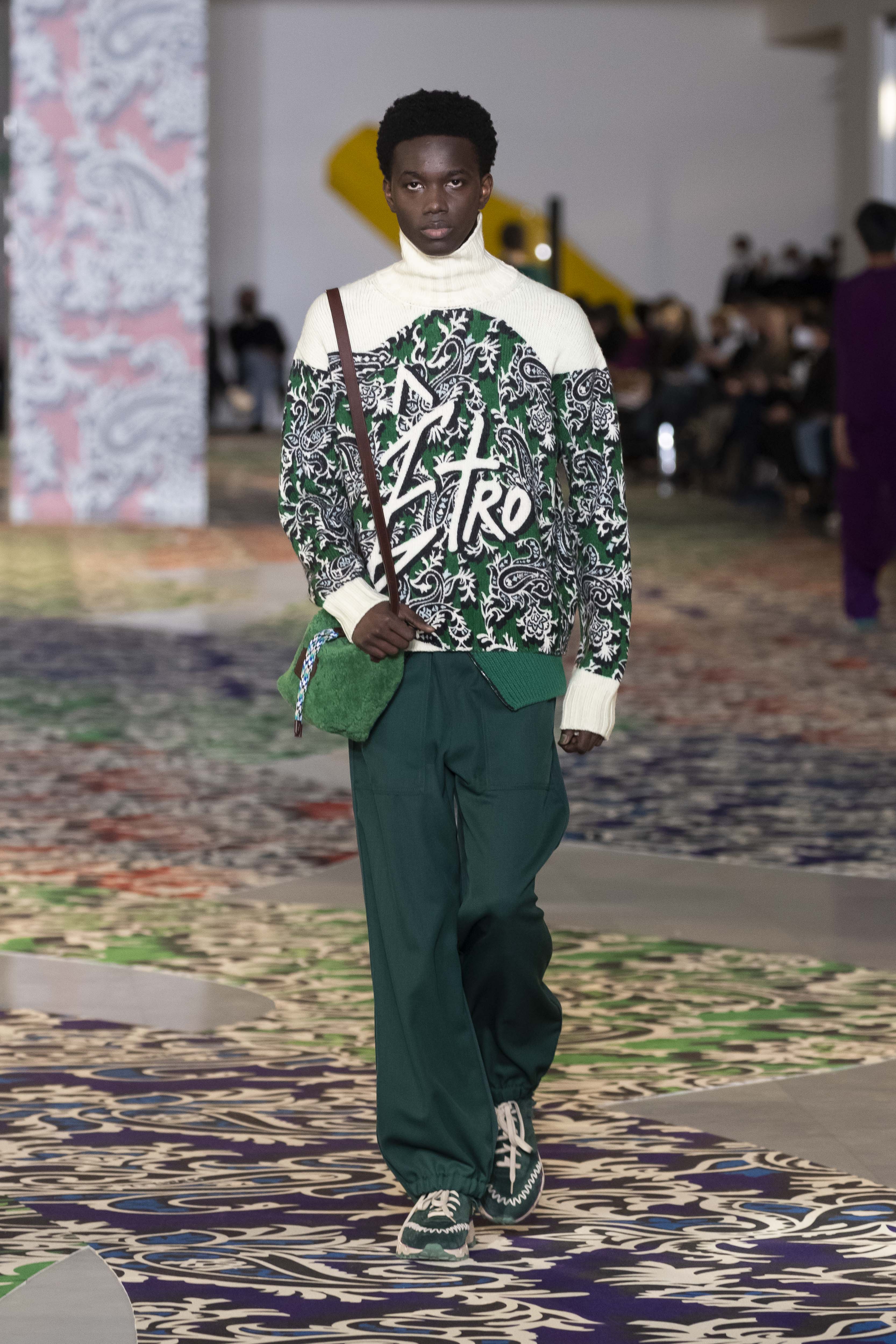 Clarity is in the rhythm of shapes, colors, and themes; in the overall, lively linearity. The soft and neat silhouette is a sum of full colors arranged in monochromatic compositions: icy shades of gray and cobalt blue, intense tones of purple, forest green and orange, bright touches of red, electric blue, hints of mustard. Graphic black and white works as a side note. Materials are dense and tactile: wool, velvet, jacquard silk, rubber. The layered and clean silhouette is a sum of archetypal garments, seen through the Etro lens: the coat, the gardening overcoat, the pullover meant as outerwear, the caftan, the duvet, the jacket, the printed shirt, the sweater with a slogan that’s a calembour. The wit of the Etro language follows this new order and cleanliness, too: the rose is scholastically declined as an Ancient Latin word on shirts and linings, or is presented in a botanical and stylized form; the wolf, a species whose conservation Etro has been committed to since 2020 in cooperation with WWF, is an inlay or jacquard that emphasizes the Nordic and sidereal path. Embossed crystal patterns and white interruptions create surprising effects on the surfaces. Cartoon sneakers and classic lace-ups, at the feet, seal the face-off of youth and adulthood. The journey of knowledge and the adventure of life has just begun.