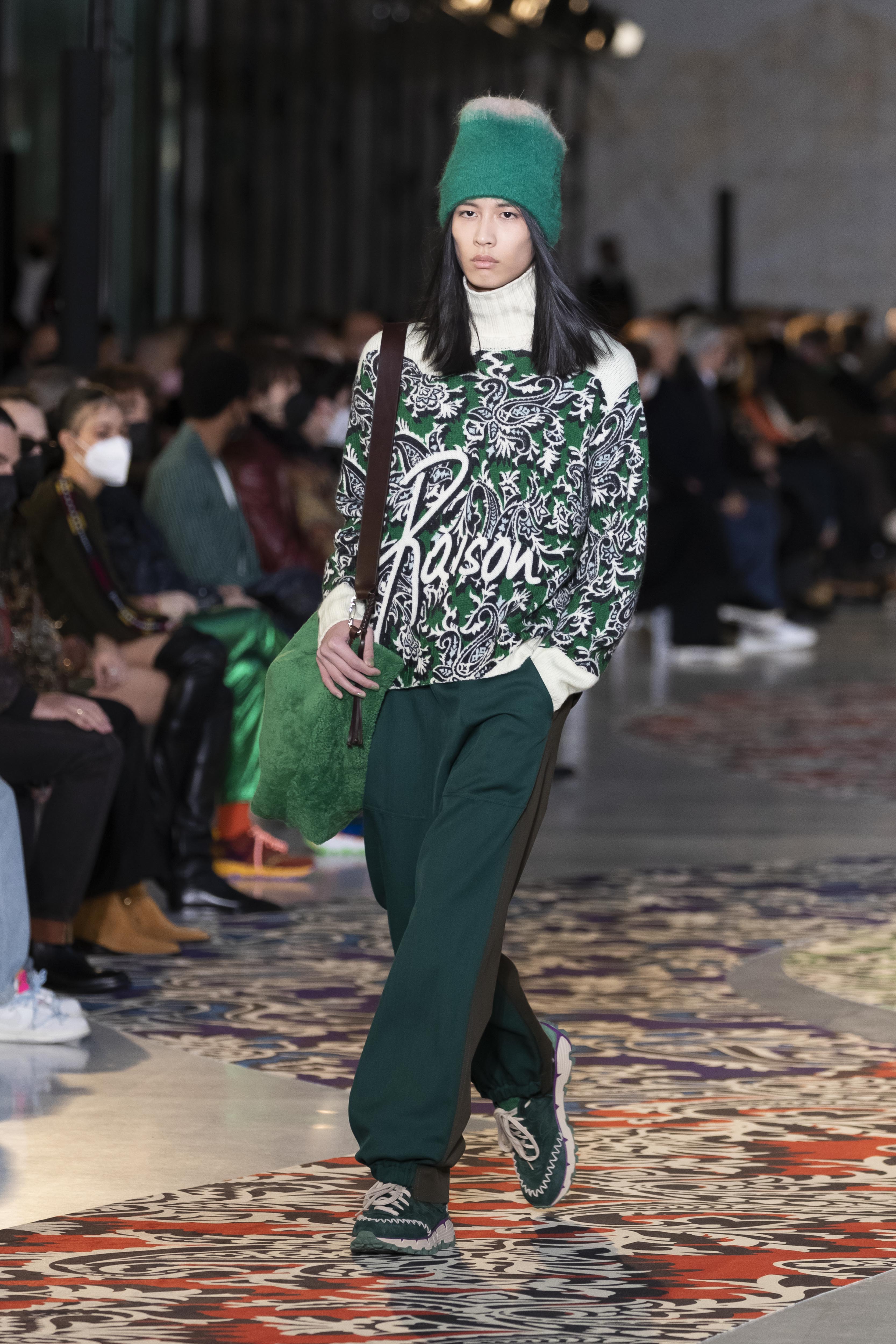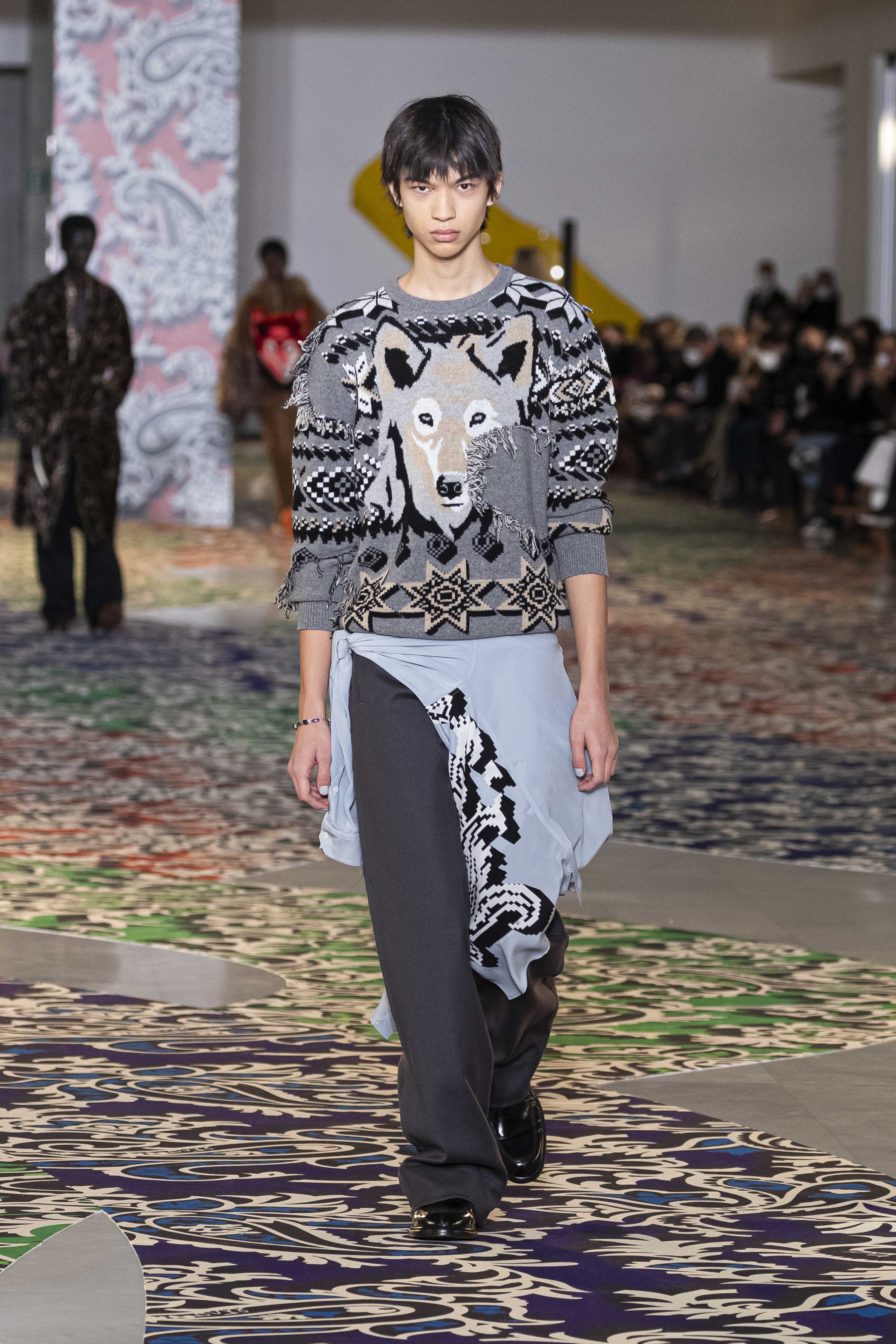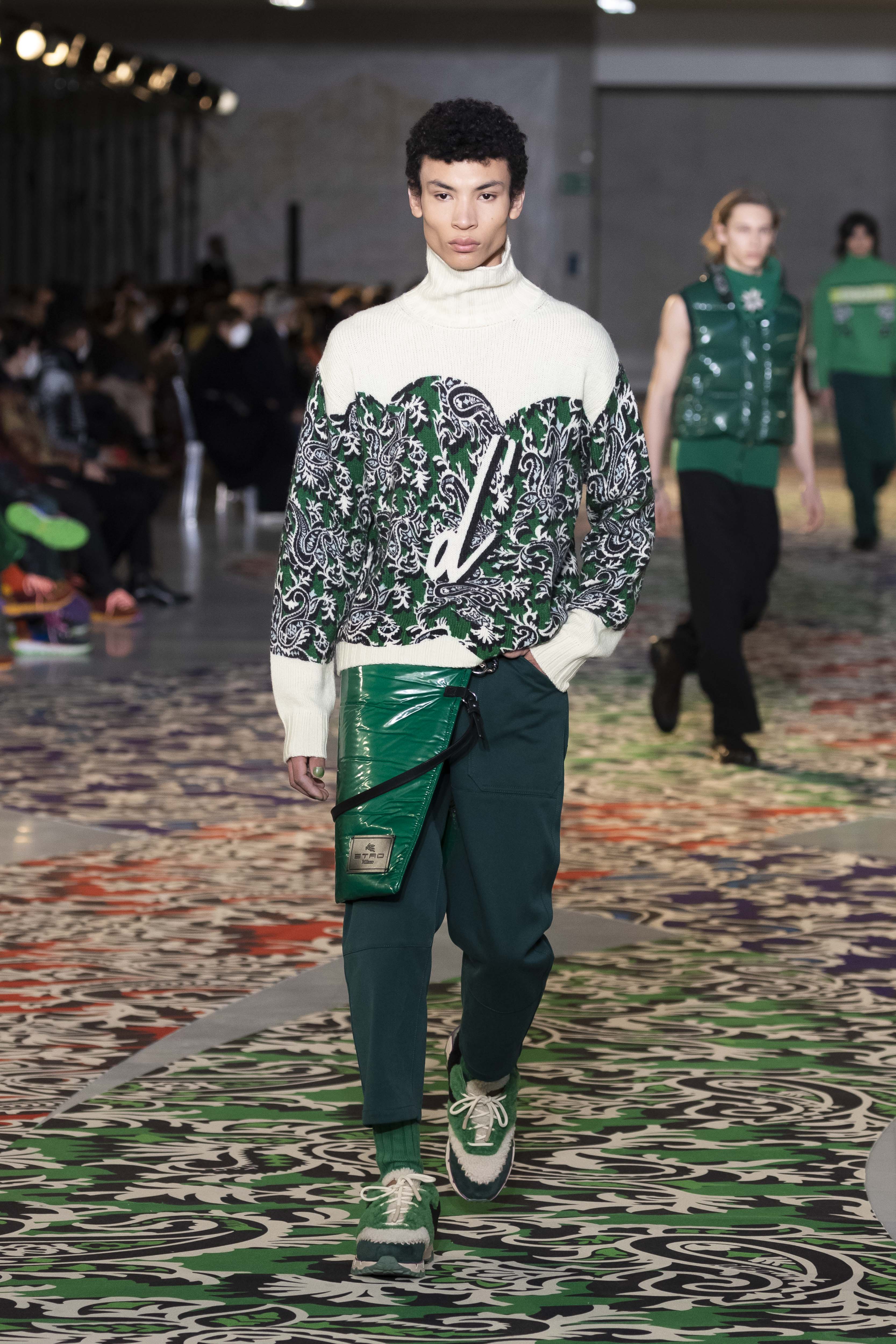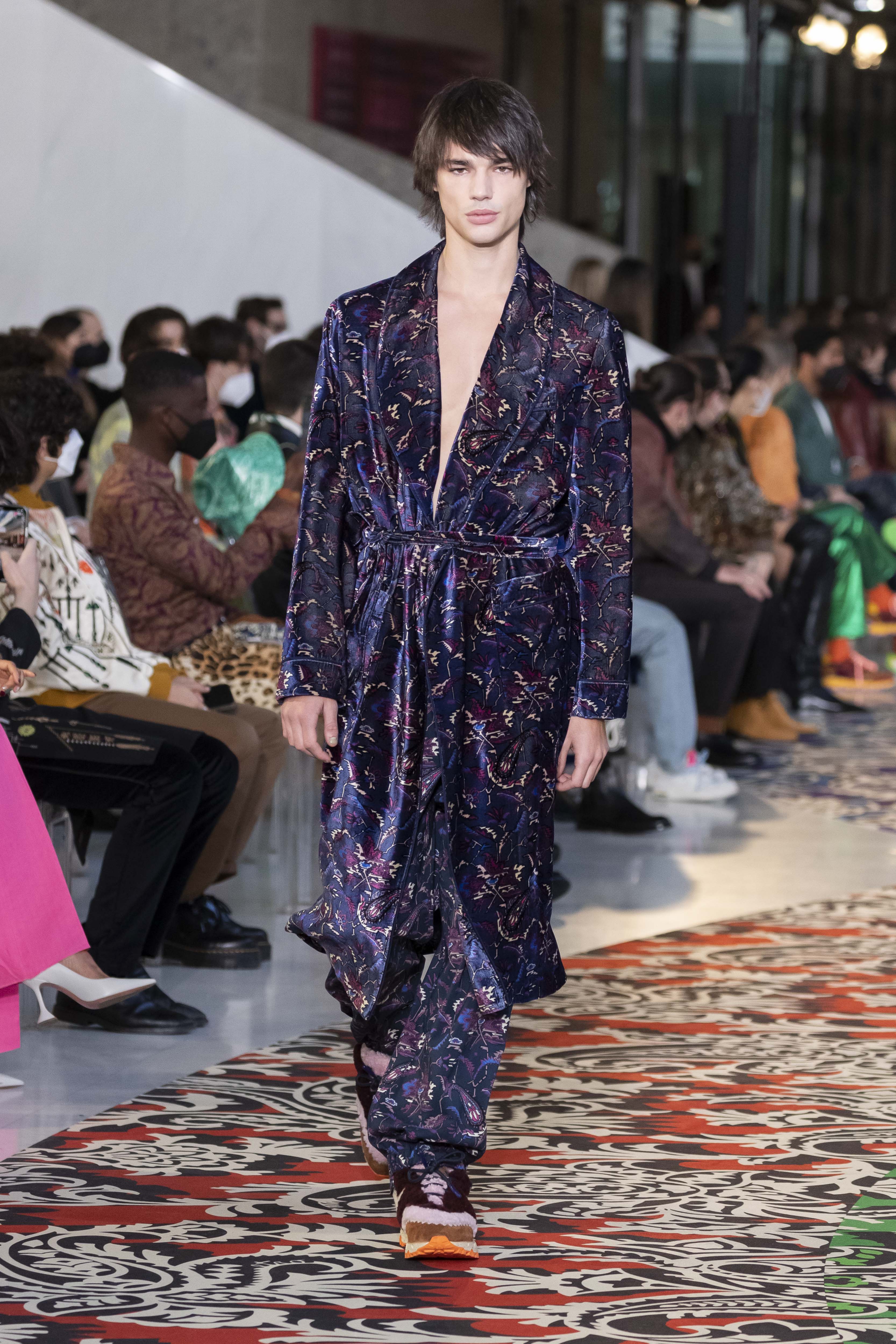 Clarity is in the rhythm of shapes, colors, and themes; in the overall, lively linearity. The soft and neat silhouette is a sum of full colors arranged in monochromatic compositions: icy shades of gray and cobalt blue, intense tones of purple, forest green and orange, bright touches of red, electric blue, hints of mustard. Graphic black and white works as a side note. Materials are dense and tactile: wool, velvet, jacquard silk, rubber. The layered and clean silhouette is a sum of archetypal garments, seen through the Etro lens: the coat, the gardening overcoat, the pullover meant as outerwear, the caftan, the duvet, the jacket, the printed shirt, the sweater with a slogan that’s a calembour. The wit of the Etro language follows this new order and cleanliness, too: the rose is scholastically declined as an Ancient Latin word on shirts and linings, or is presented in a botanical and stylized form; the wolf, a species whose conservation Etro has been committed to since 2020 in cooperation with WWF, is an inlay or jacquard that emphasizes the Nordic and sidereal path. Embossed crystal patterns and white interruptions create surprising effects on the surfaces. Cartoon sneakers and classic lace-ups, at the feet, seal the face-off of youth and adulthood. The journey of knowledge and the adventure of life has just begun.