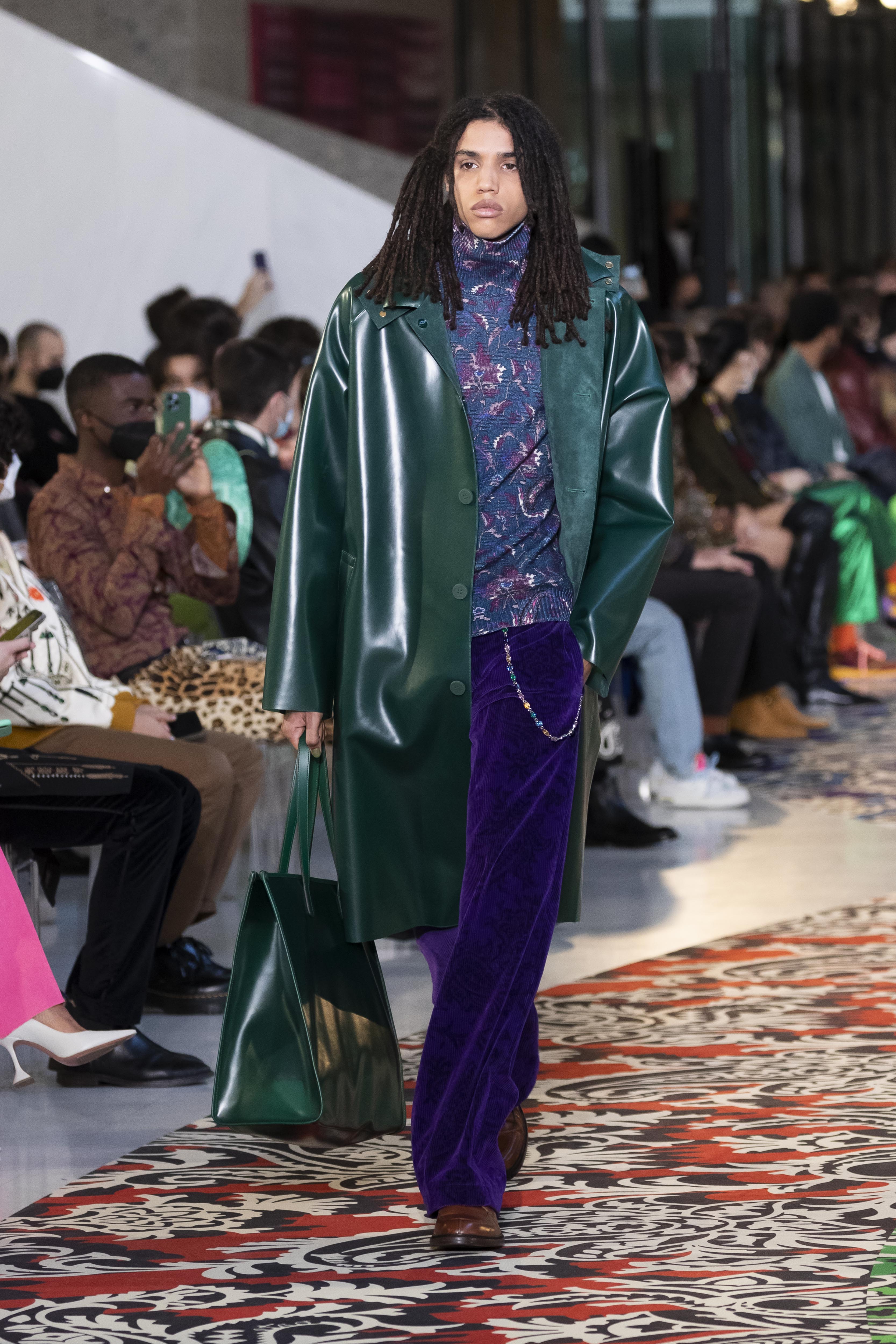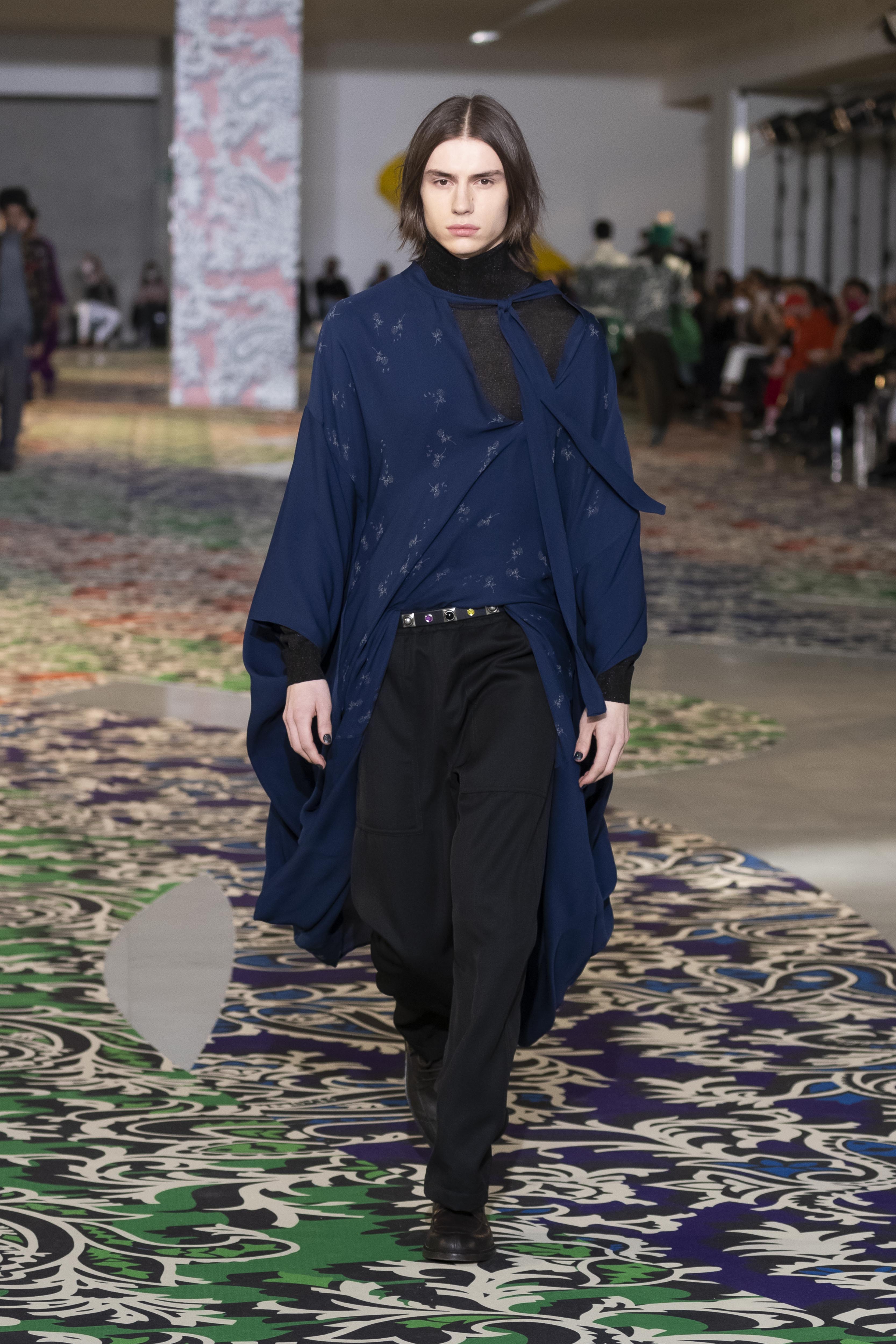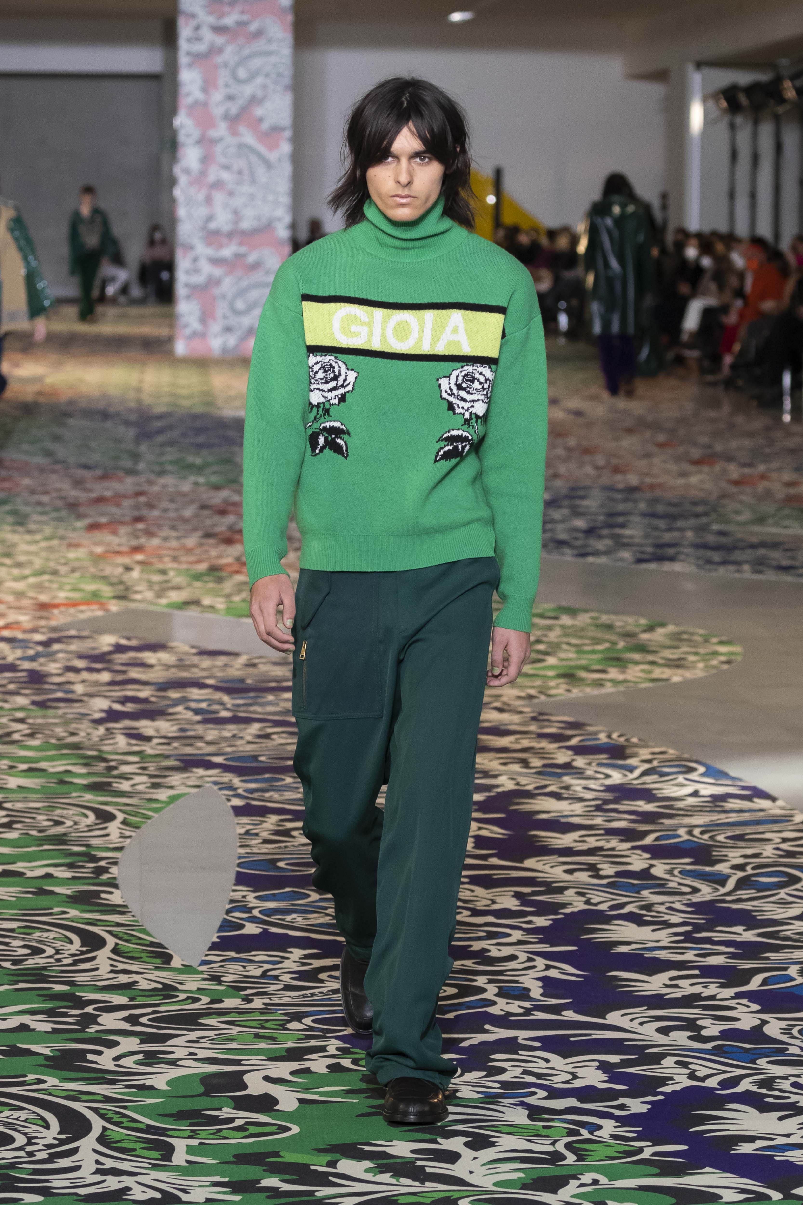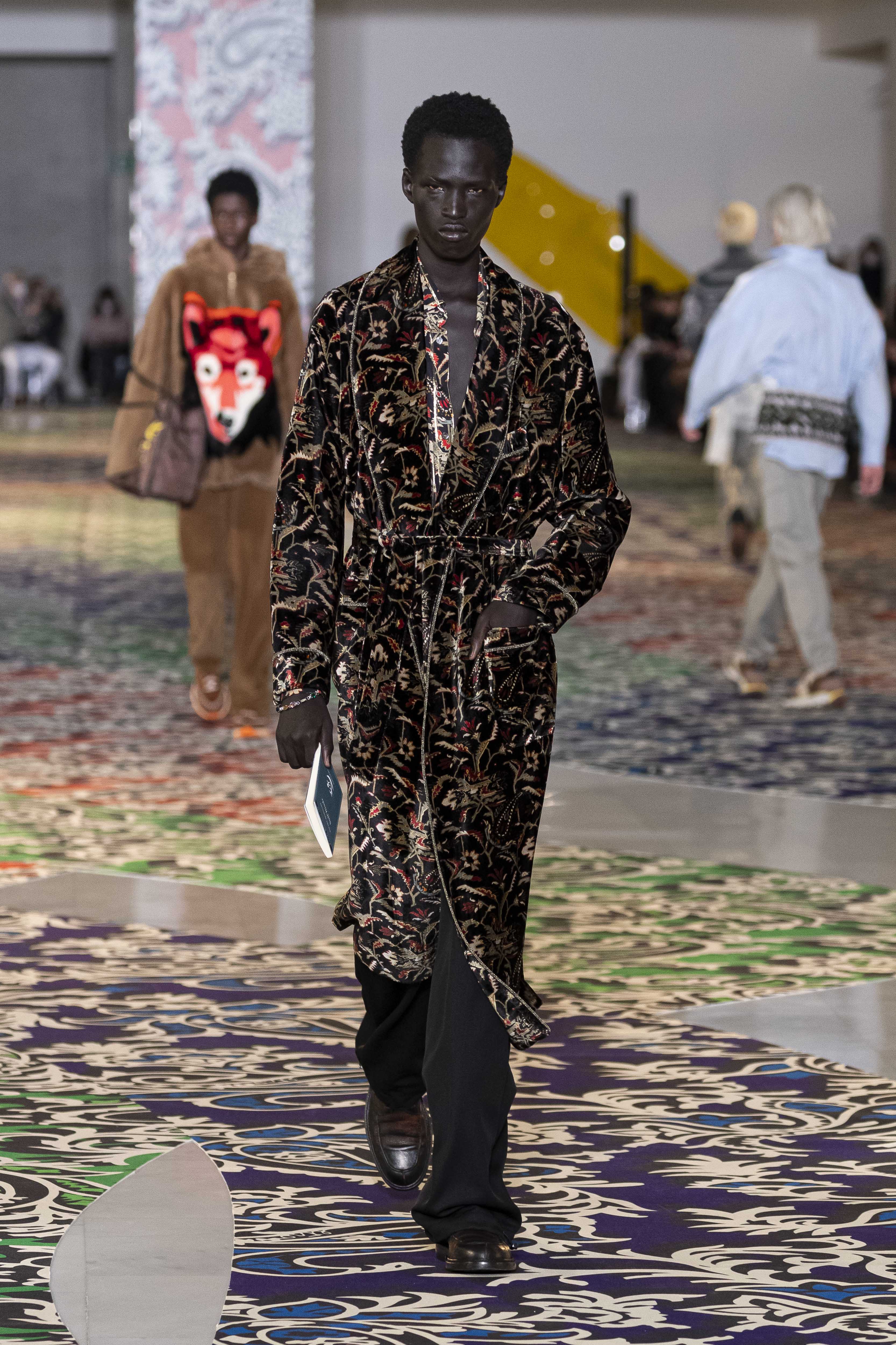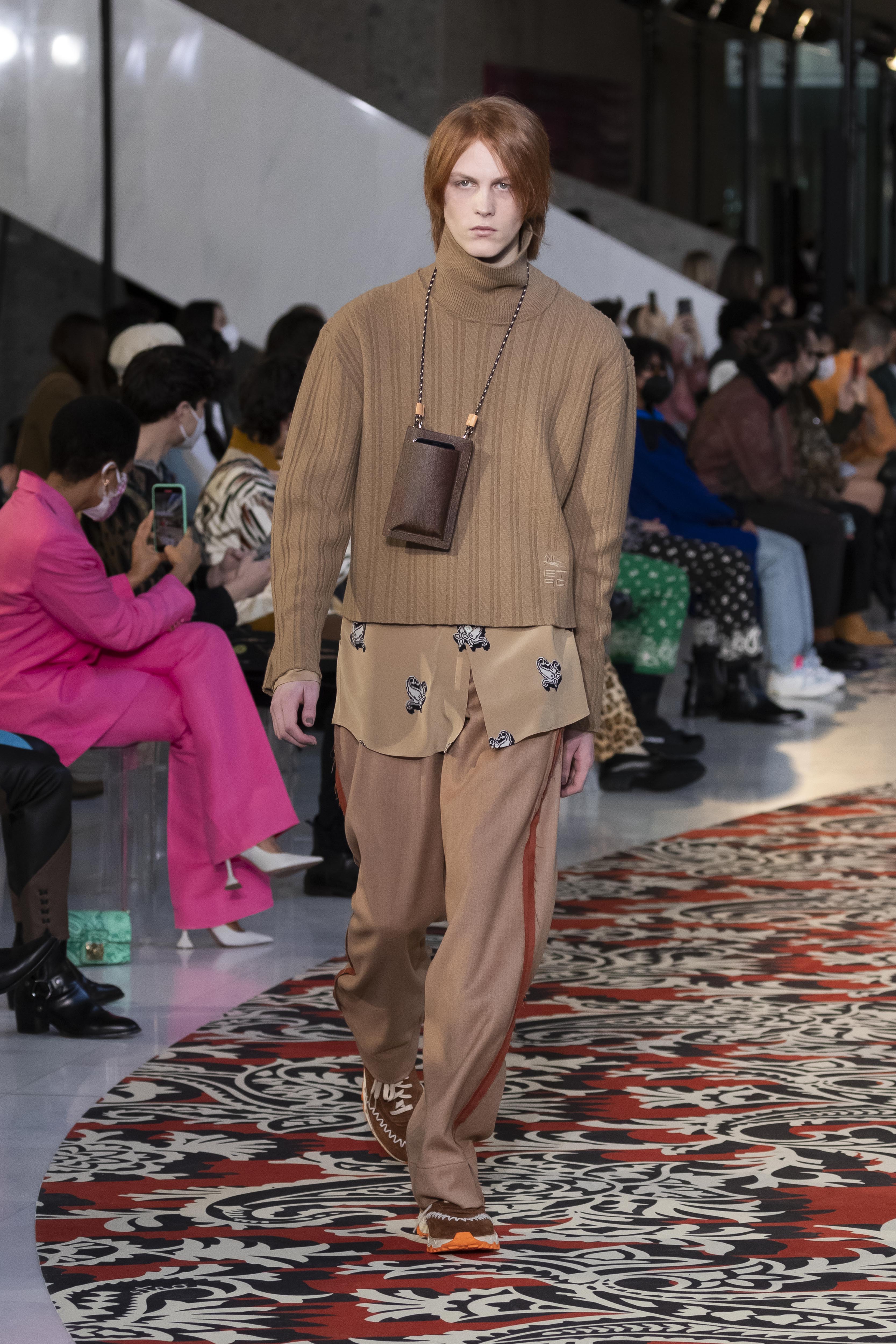 Clarity is in the rhythm of shapes, colors, and themes; in the overall, lively linearity. The soft and neat silhouette is a sum of full colors arranged in monochromatic compositions: icy shades of gray and cobalt blue, intense tones of purple, forest green and orange, bright touches of red, electric blue, hints of mustard. Graphic black and white works as a side note. Materials are dense and tactile: wool, velvet, jacquard silk, rubber. The layered and clean silhouette is a sum of archetypal garments, seen through the Etro lens: the coat, the gardening overcoat, the pullover meant as outerwear, the caftan, the duvet, the jacket, the printed shirt, the sweater with a slogan that’s a calembour. The wit of the Etro language follows this new order and cleanliness, too: the rose is scholastically declined as an Ancient Latin word on shirts and linings, or is presented in a botanical and stylized form; the wolf, a species whose conservation Etro has been committed to since 2020 in cooperation with WWF, is an inlay or jacquard that emphasizes the Nordic and sidereal path. Embossed crystal patterns and white interruptions create surprising effects on the surfaces. Cartoon sneakers and classic lace-ups, at the feet, seal the face-off of youth and adulthood. The journey of knowledge and the adventure of life has just begun.