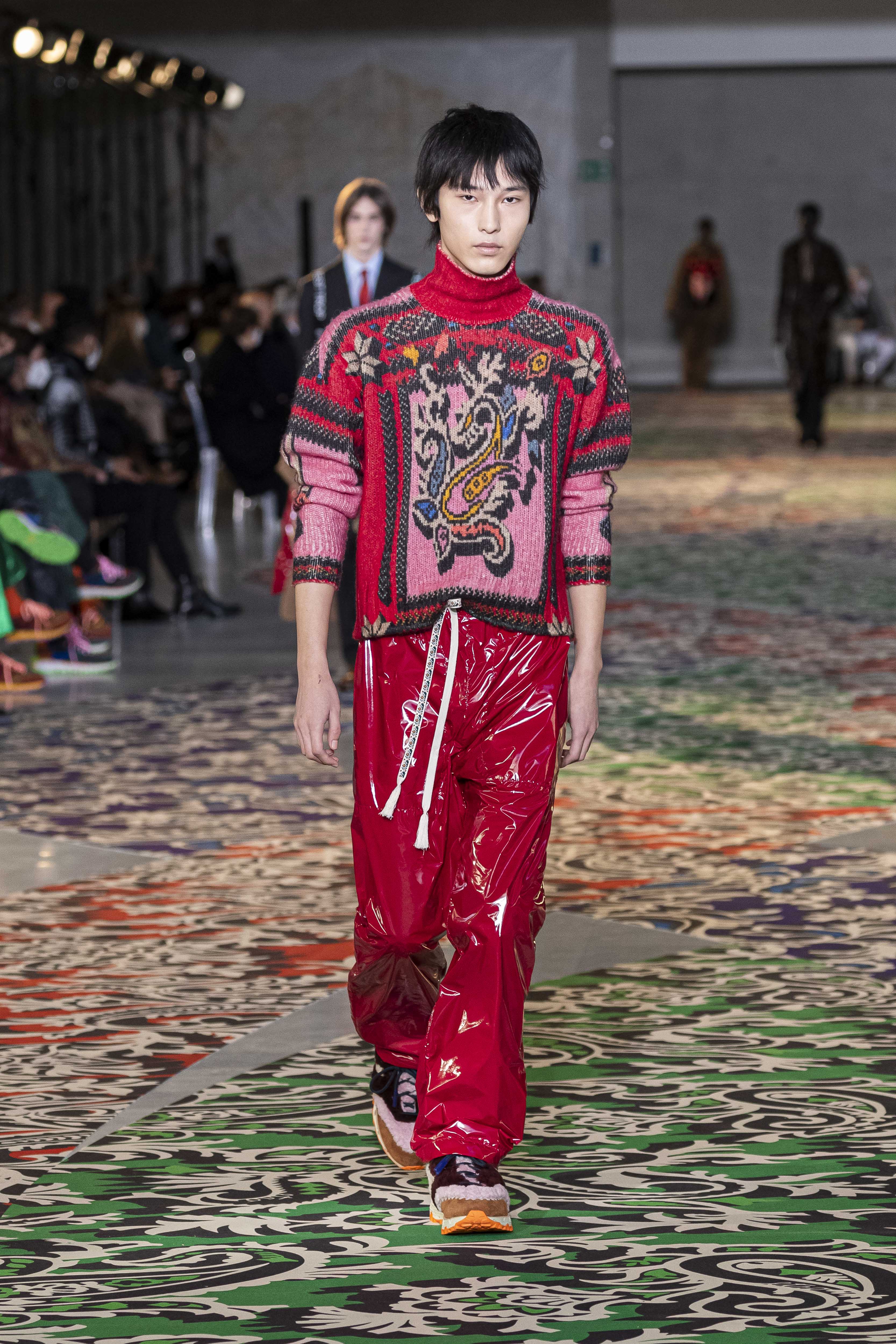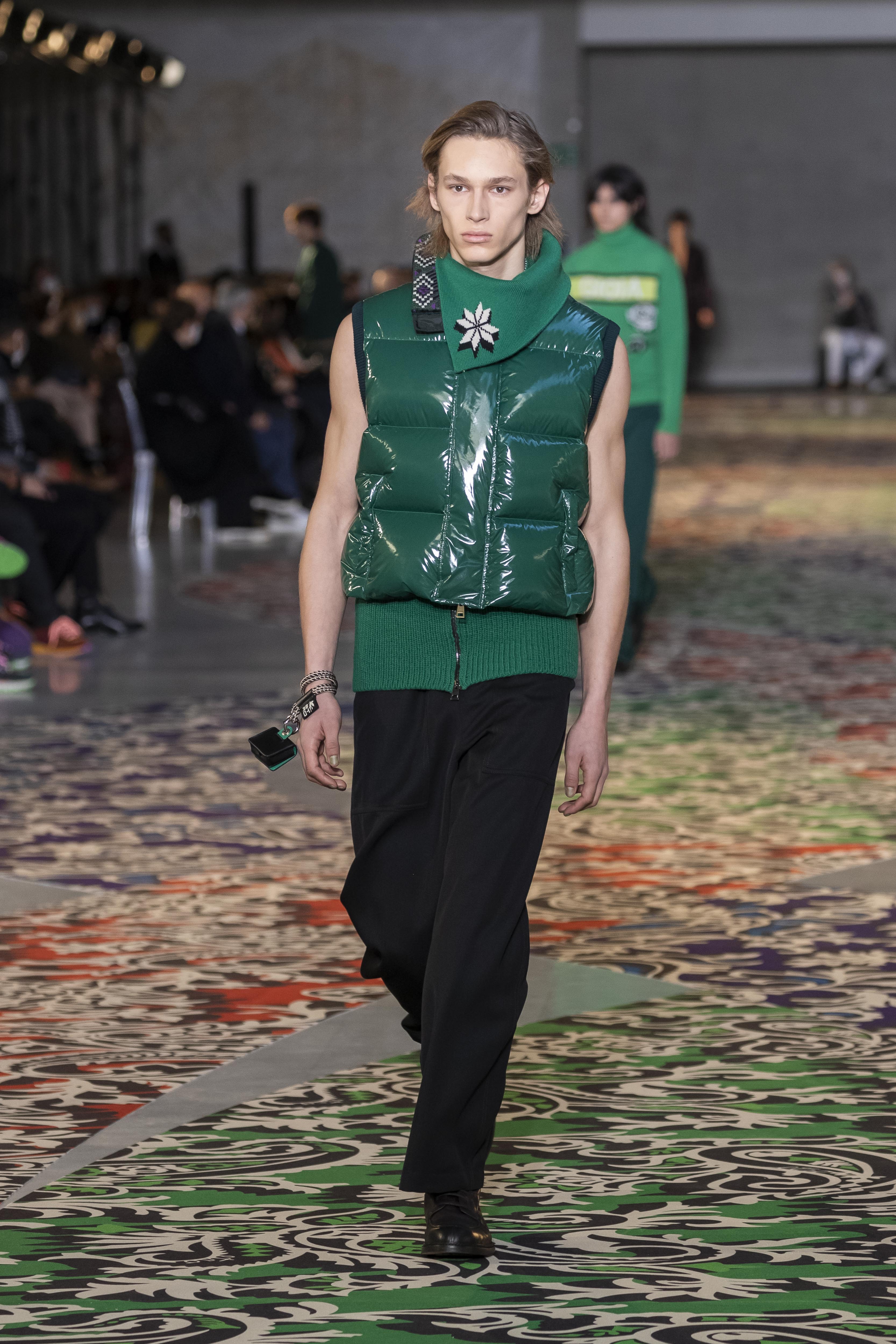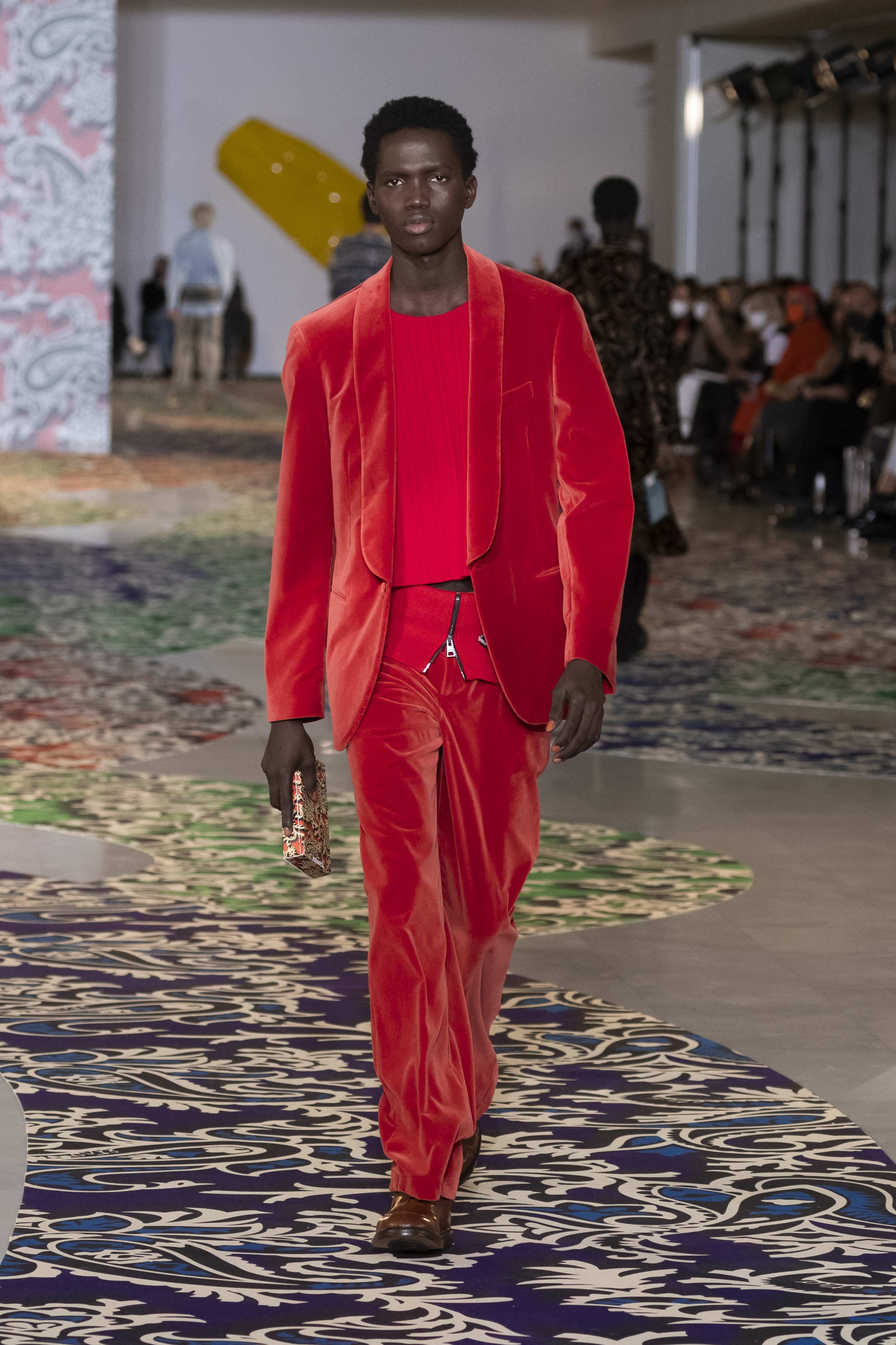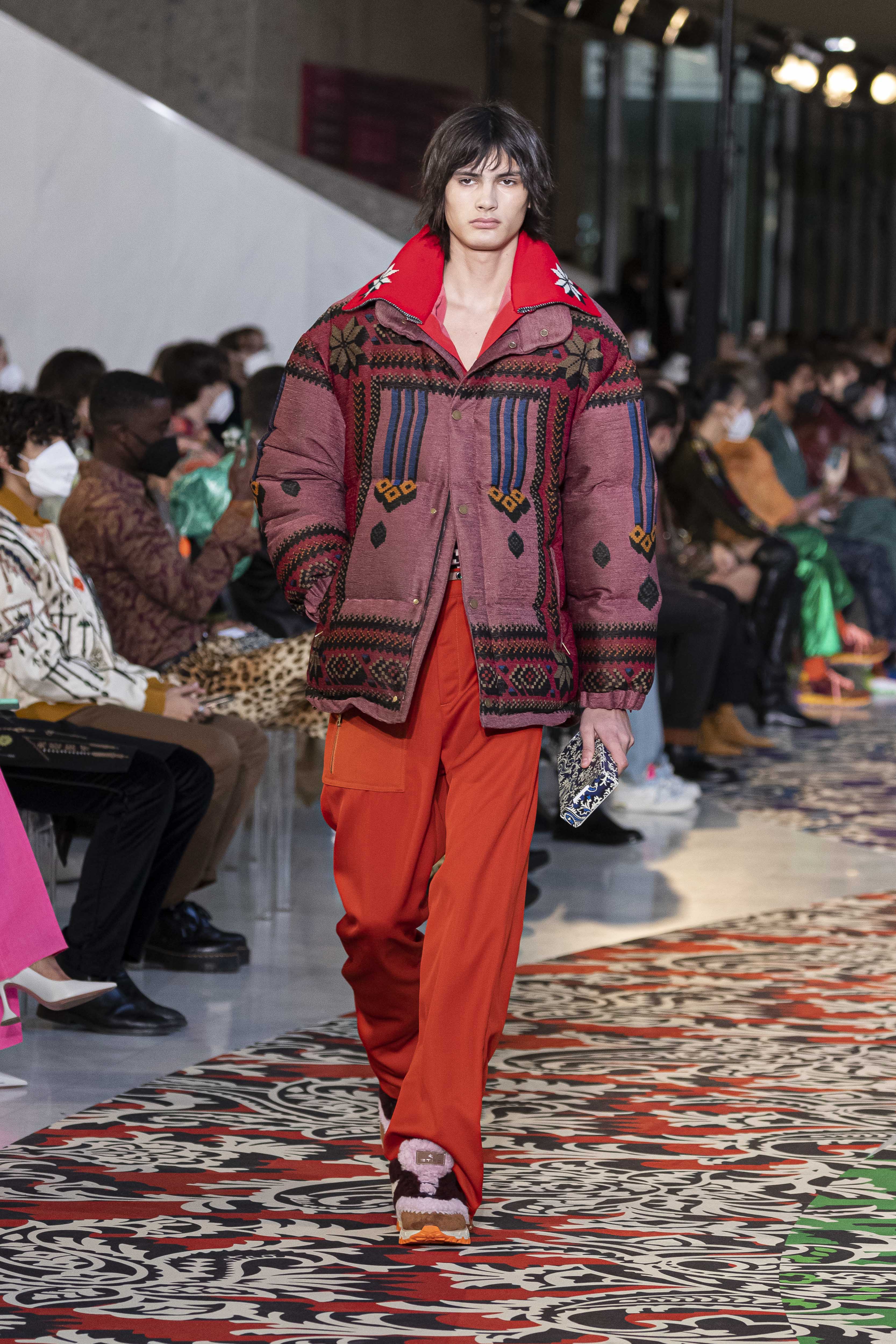 Clarity is in the rhythm of shapes, colors, and themes; in the overall, lively linearity. The soft and neat silhouette is a sum of full colors arranged in monochromatic compositions: icy shades of gray and cobalt blue, intense tones of purple, forest green and orange, bright touches of red, electric blue, hints of mustard. Graphic black and white works as a side note. Materials are dense and tactile: wool, velvet, jacquard silk, rubber. The layered and clean silhouette is a sum of archetypal garments, seen through the Etro lens: the coat, the gardening overcoat, the pullover meant as outerwear, the caftan, the duvet, the jacket, the printed shirt, the sweater with a slogan that’s a calembour. The wit of the Etro language follows this new order and cleanliness, too: the rose is scholastically declined as an Ancient Latin word on shirts and linings, or is presented in a botanical and stylized form; the wolf, a species whose conservation Etro has been committed to since 2020 in cooperation with WWF, is an inlay or jacquard that emphasizes the Nordic and sidereal path. Embossed crystal patterns and white interruptions create surprising effects on the surfaces. Cartoon sneakers and classic lace-ups, at the feet, seal the face-off of youth and adulthood. The journey of knowledge and the adventure of life has just begun.