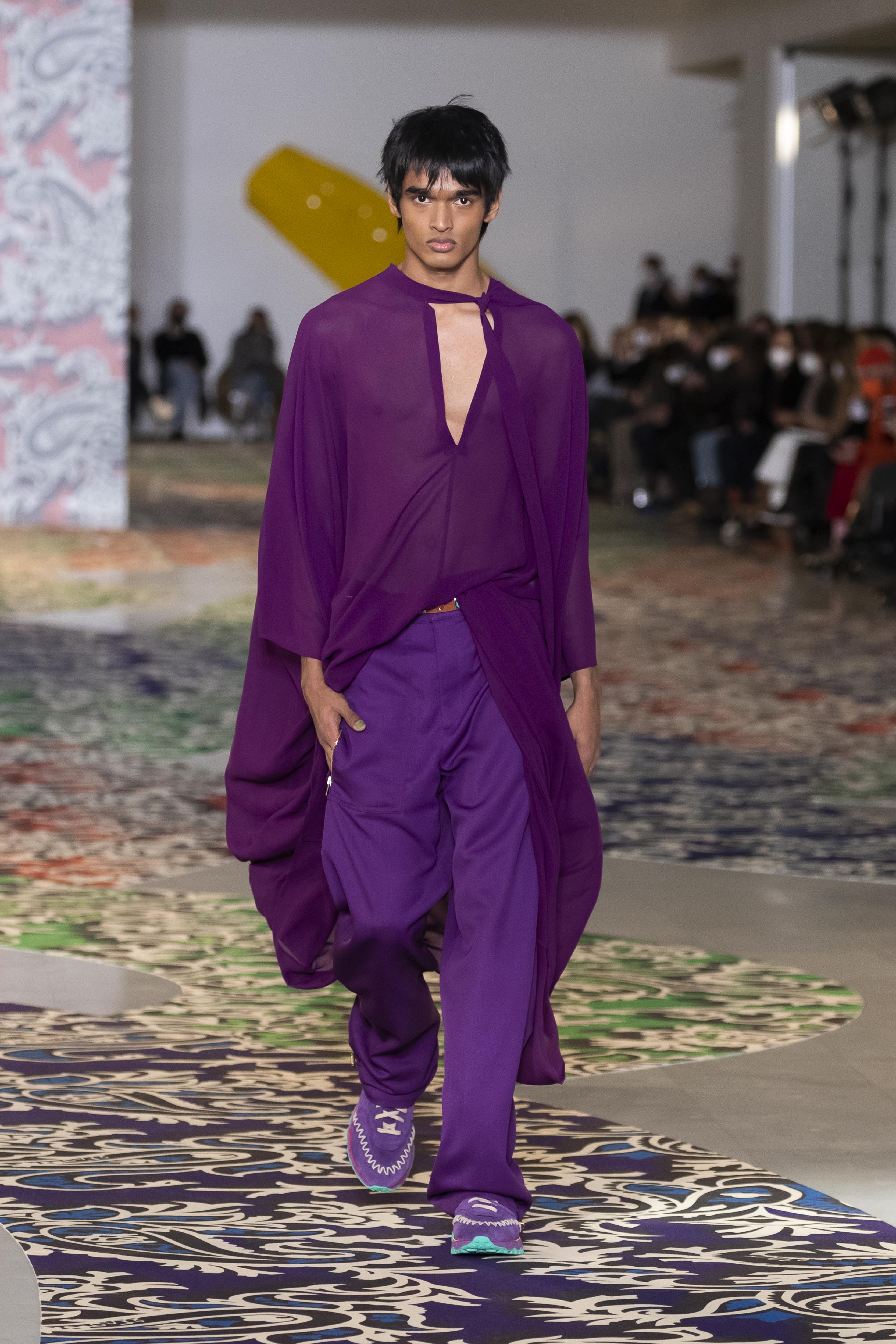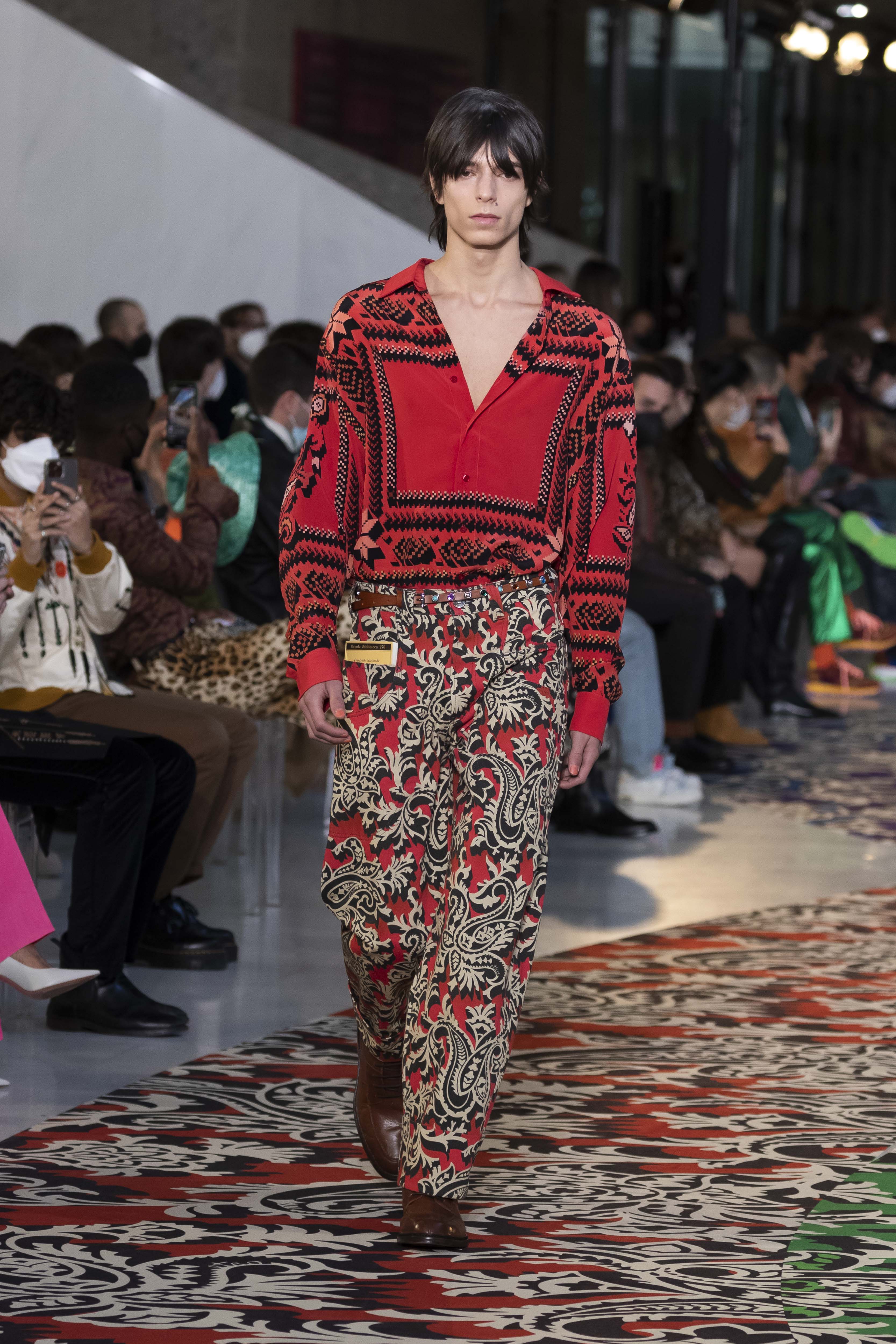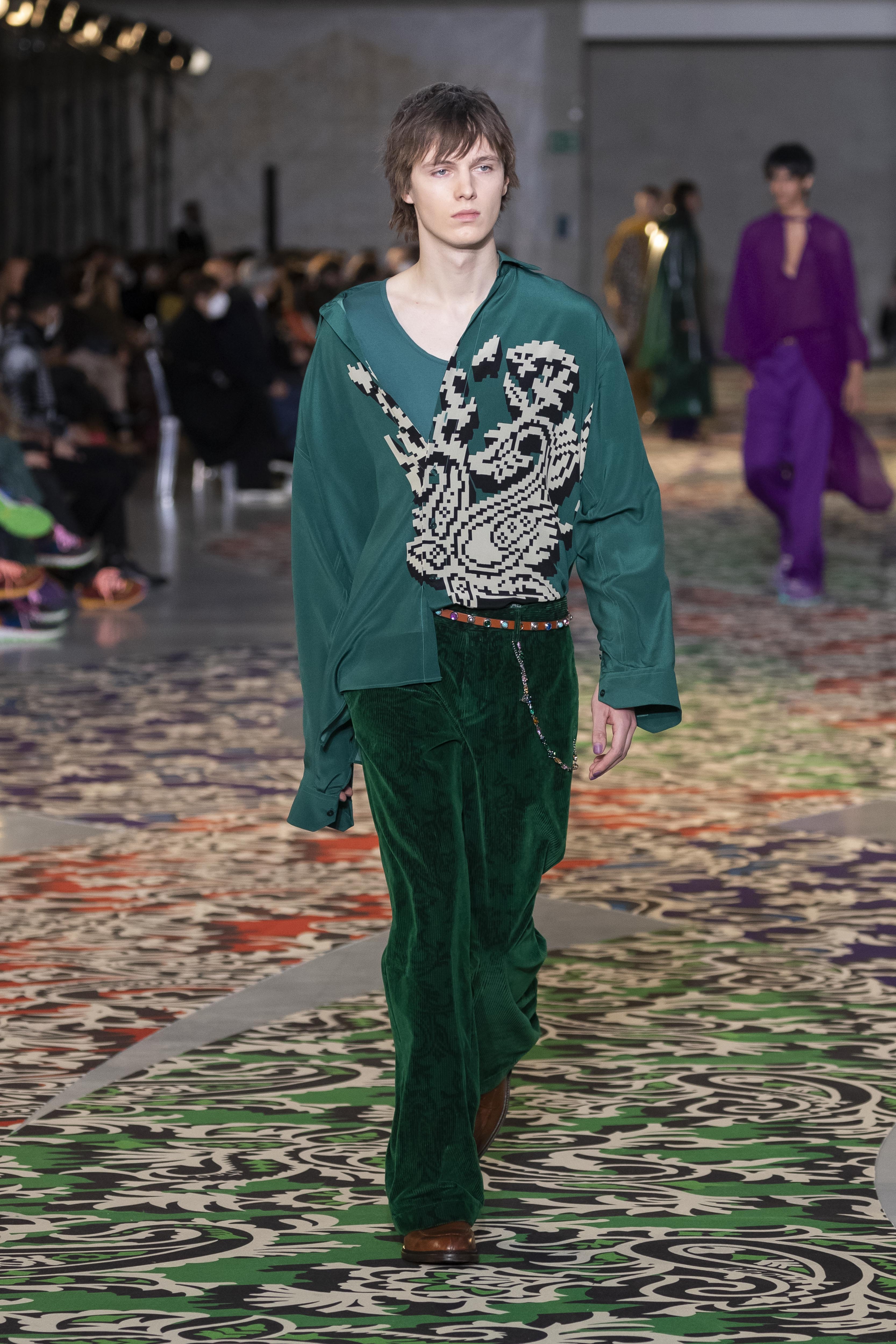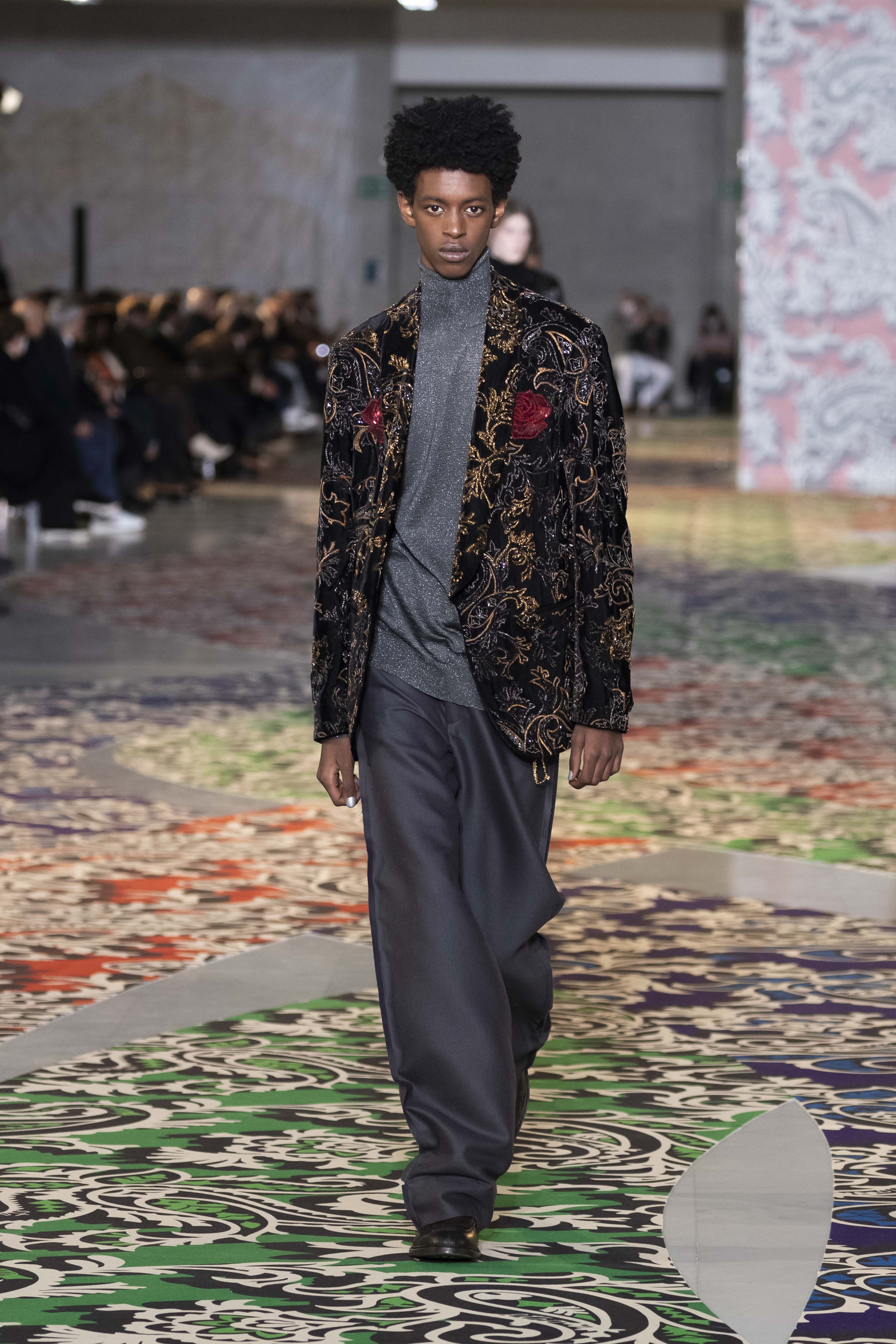 Clarity is in the rhythm of shapes, colors, and themes; in the overall, lively linearity. The soft and neat silhouette is a sum of full colors arranged in monochromatic compositions: icy shades of gray and cobalt blue, intense tones of purple, forest green and orange, bright touches of red, electric blue, hints of mustard. Graphic black and white works as a side note. Materials are dense and tactile: wool, velvet, jacquard silk, rubber. The layered and clean silhouette is a sum of archetypal garments, seen through the Etro lens: the coat, the gardening overcoat, the pullover meant as outerwear, the caftan, the duvet, the jacket, the printed shirt, the sweater with a slogan that’s a calembour. The wit of the Etro language follows this new order and cleanliness, too: the rose is scholastically declined as an Ancient Latin word on shirts and linings, or is presented in a botanical and stylized form; the wolf, a species whose conservation Etro has been committed to since 2020 in cooperation with WWF, is an inlay or jacquard that emphasizes the Nordic and sidereal path. Embossed crystal patterns and white interruptions create surprising effects on the surfaces. Cartoon sneakers and classic lace-ups, at the feet, seal the face-off of youth and adulthood. The journey of knowledge and the adventure of life has just begun.