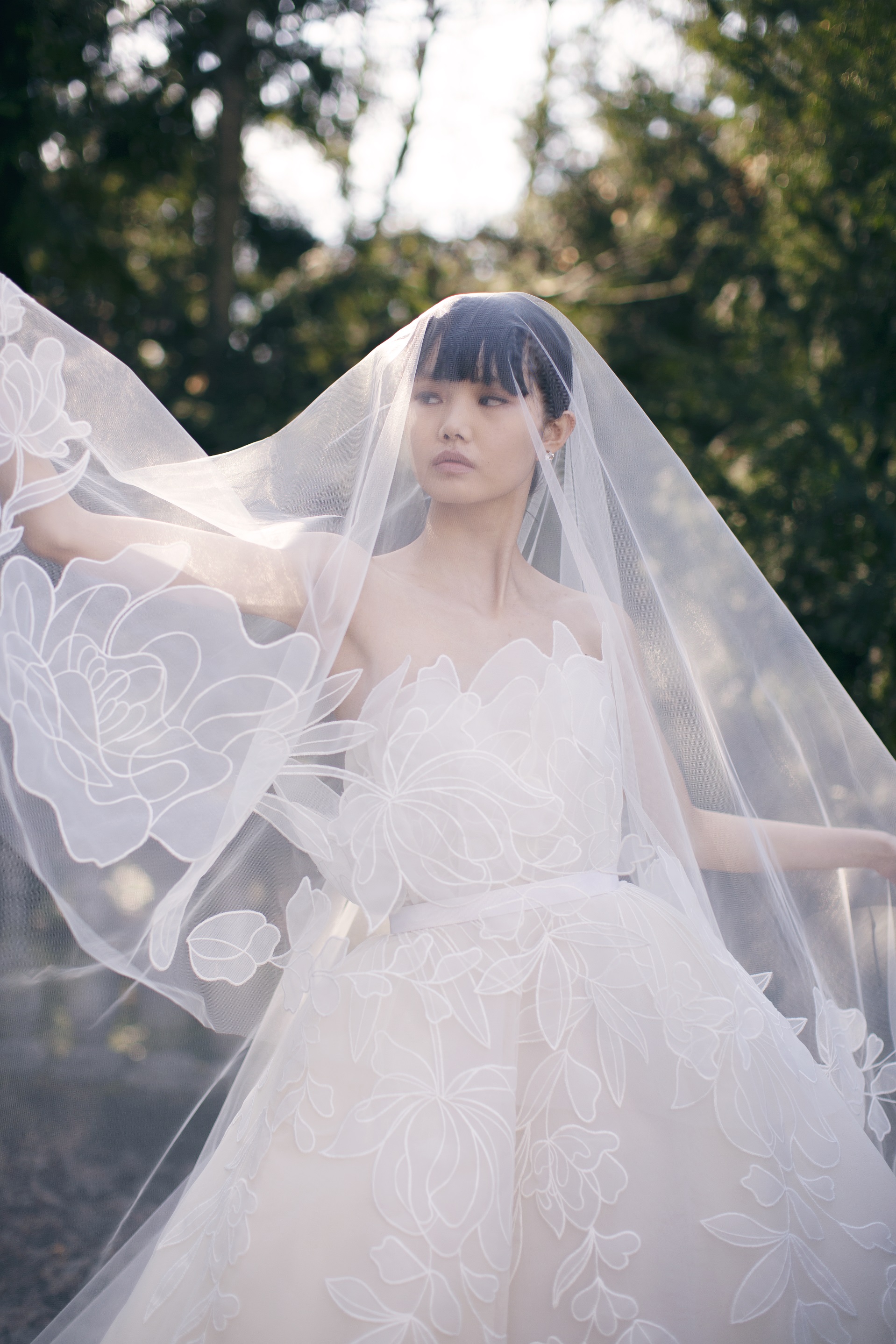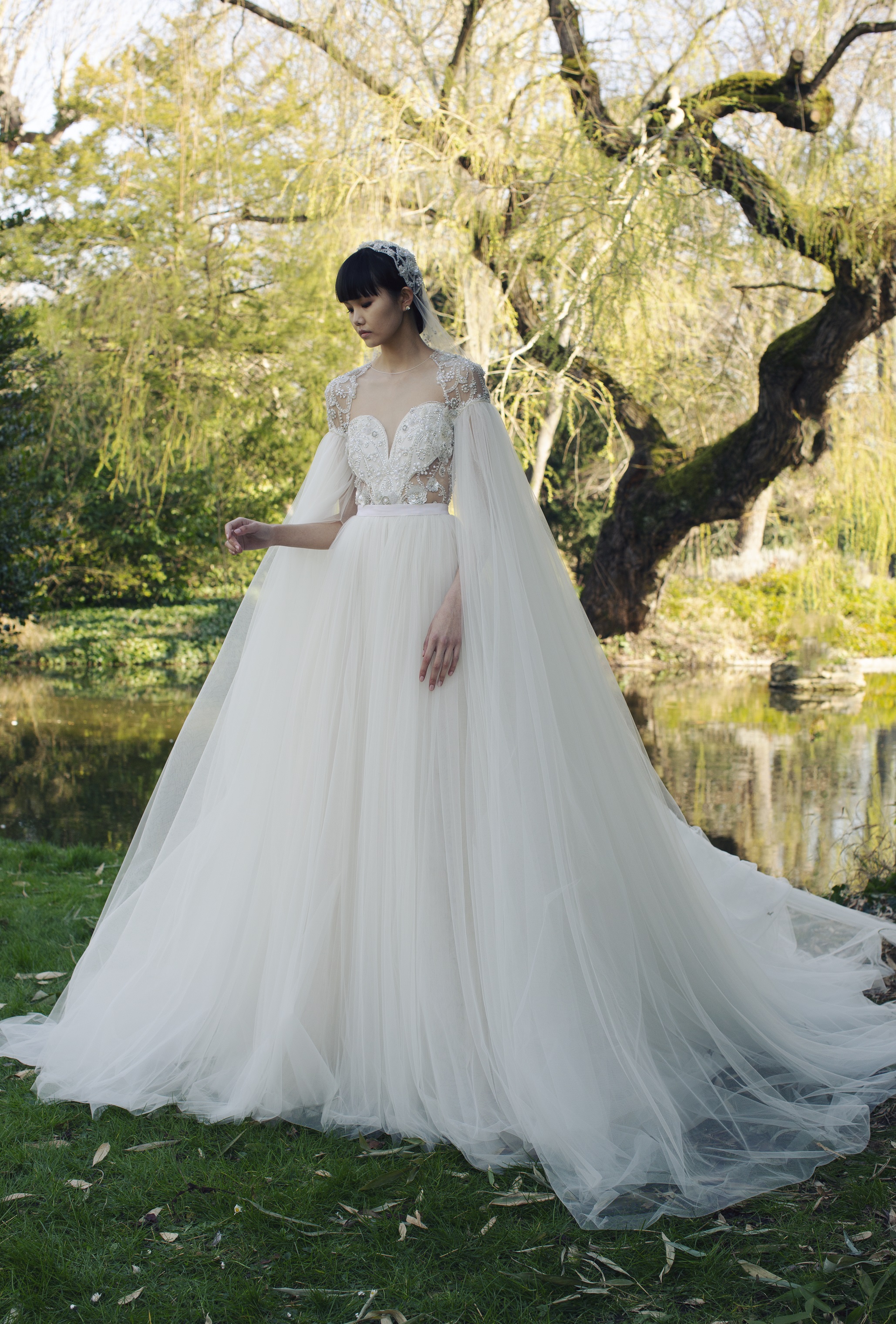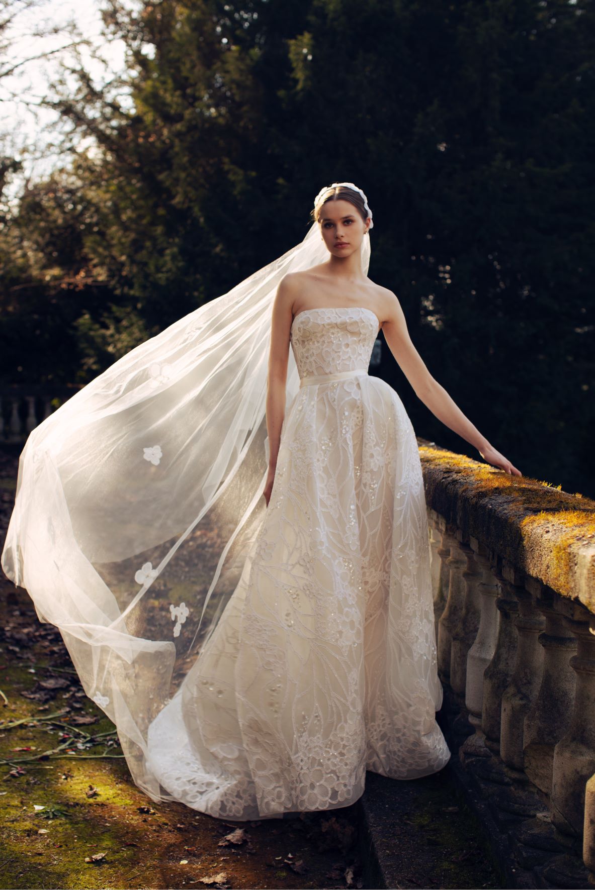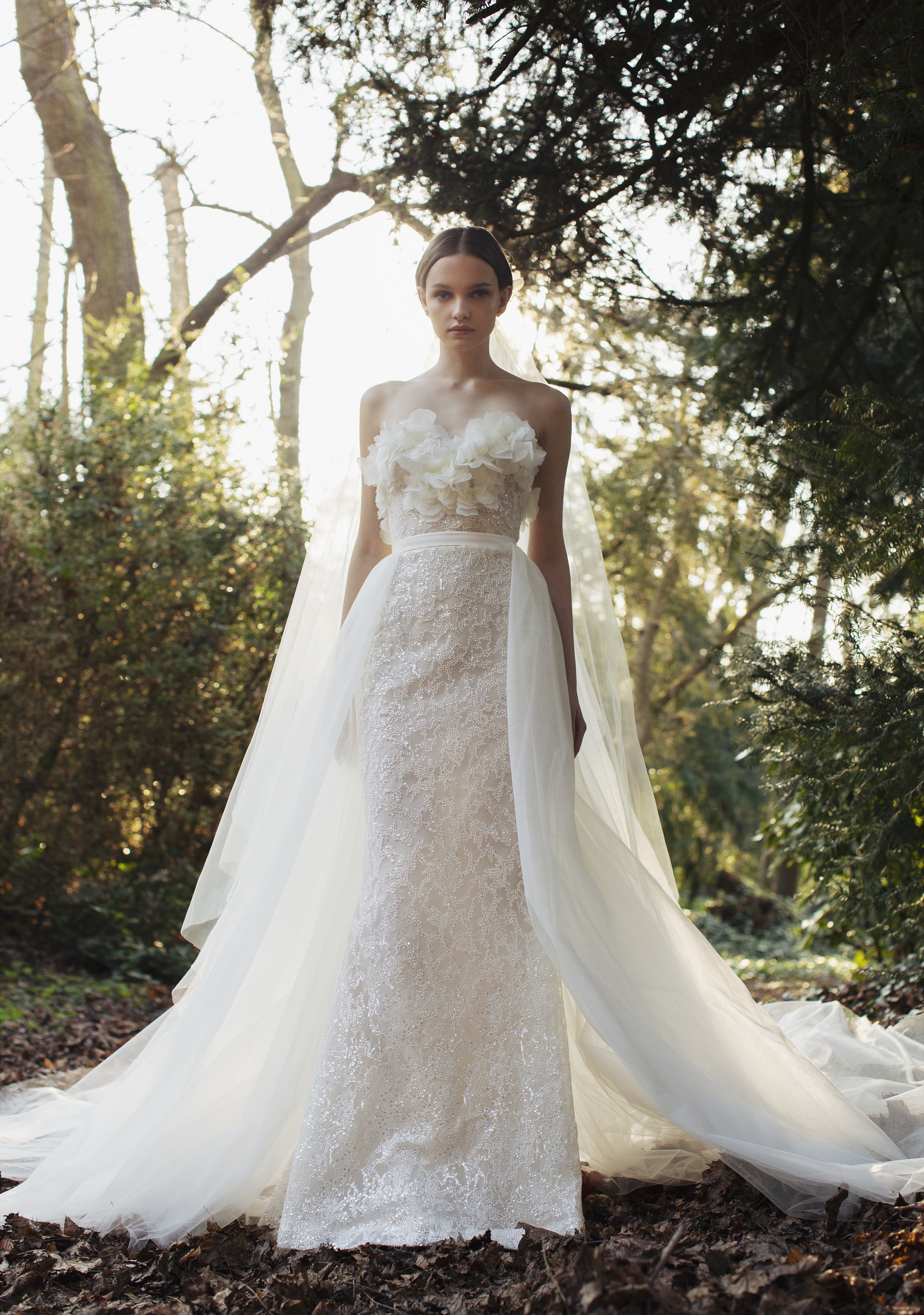 When personified, these individual works of art are transformed into entrancing oeuvres. Magnificent Mikado travels off one shoulder into a draped bodice that expands into a majestic structured ballgown. Glistening sequins and beads move through a strapless mini dress made regal with a trailing cape of three-dimensional organza flowering abundance. Like glistening morning dew drops, crystals, and beads dance across a sheer bodice, becoming more dazzling as they waltz down an A-line silhouette to meet wispy ostrich feathered hems. Complementing veils, detailed headpieces and the symbolic ELIE SAAB slim belt at waist add a final breath of radiance.