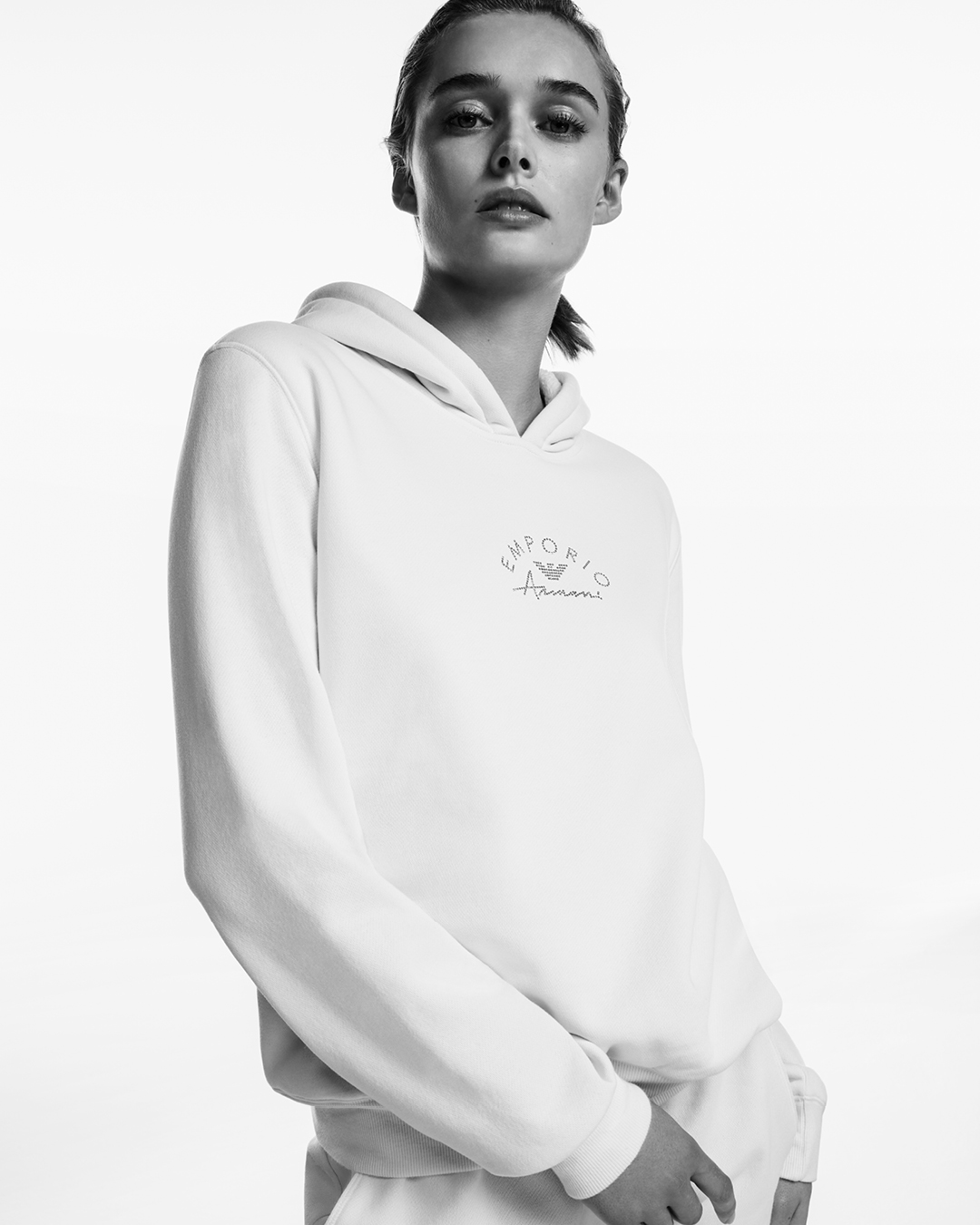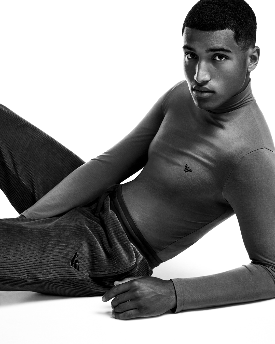 The Essentials section encapsulates the brand’s style code, featuring the collection’s most iconic items. Spending more time at home has redesigned our habits, helping us focus on how important it is to take care of ourselves in all settings: Emporio Armani therefore offers underwear and loungewear to create a perfect balance of style and comfort. A selection that tells a story of snow-covered atmospheres and landscapes, of evenings in front of a blazing fire in the hearth, of relaxing moments spent in a spa. The athleisure garments are made from various terry fabrics, customised with logos that reinforce the brand identity, and by casual items made from organic cotton and printed microfibre. The line is completed by an enveloping dressing gown and coordinated socks.