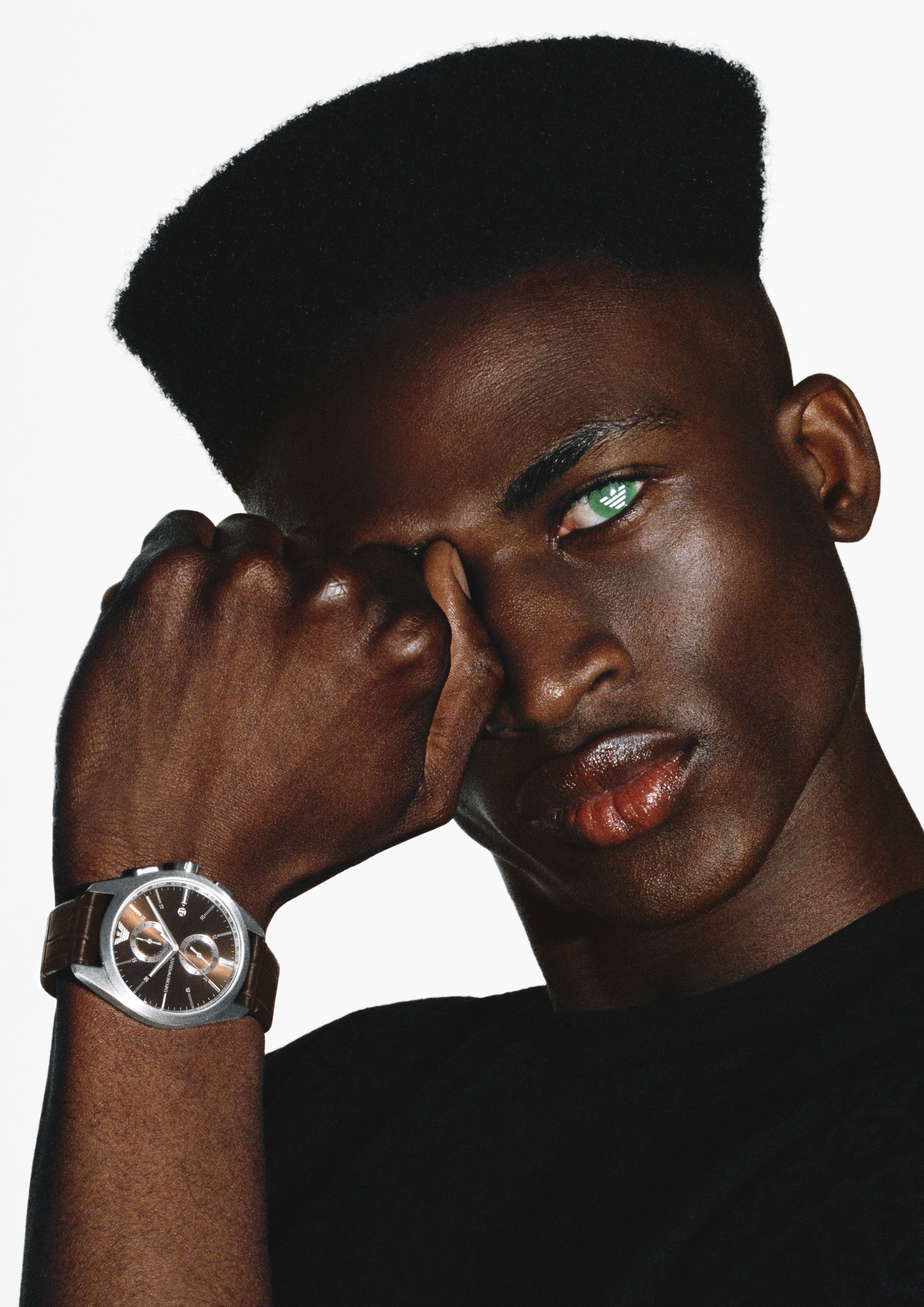 43mm watch featuring a brown sunray dial with silver contrast counter rings, applied indexes and hands with white LumiNova, at least 50% recycled stainless steel case, quartz movement with chronograph and brown leather strap.