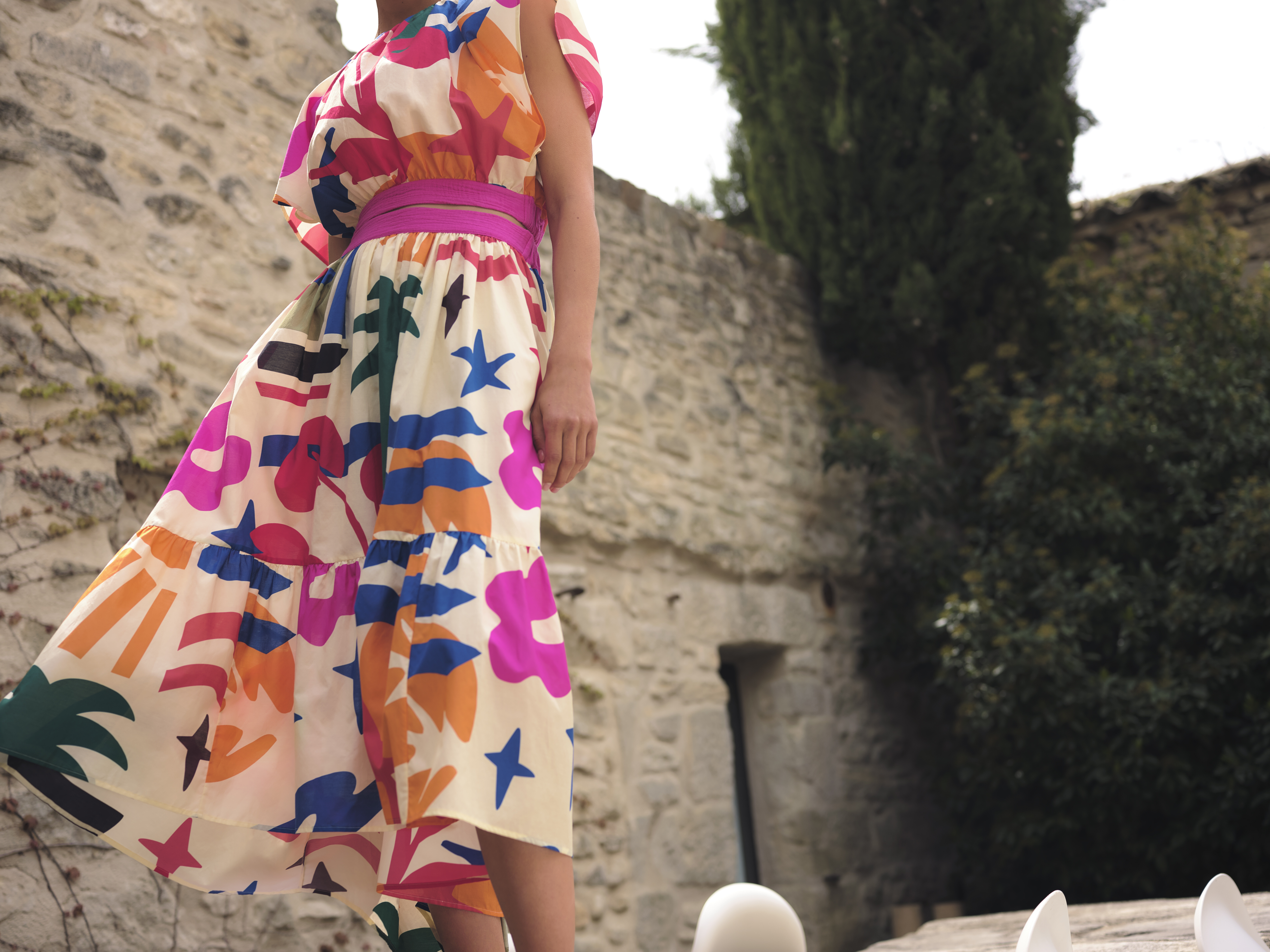 With its colourful Effigie print, this crop top is perfect for the summer season. Made of a printed cotton and silk voile, it features short butterfly sleeves and a waist panel in cotton gauze. Its elasticated neckline exposes the shoulders for a feminine touch.