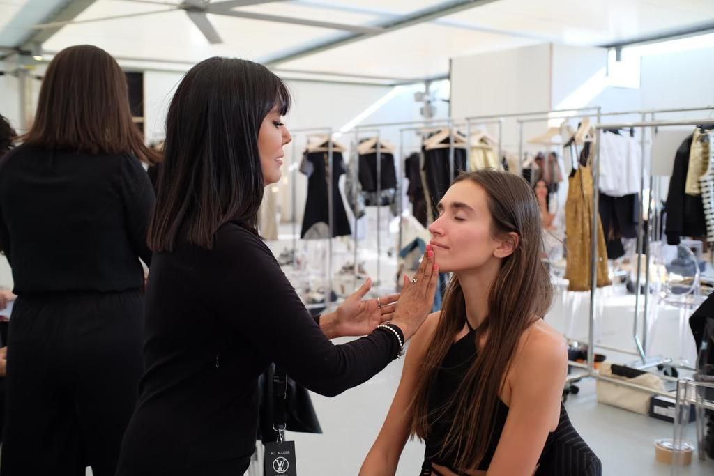 * We were beyond honored to have Augustinus Bader and it truly is the most luxurious skincare brand in the world, to provide us with its incredible products backstage to create the most dewy luxurious skin. Skin prep is crucial for an influential show like Louis Vuitton. We started with The Cream Cleansing Gel to clean the skin. The serum to boost the skin's hydration and the famous The Rich Cream to add moisture and to create the perfect base for the foundation.