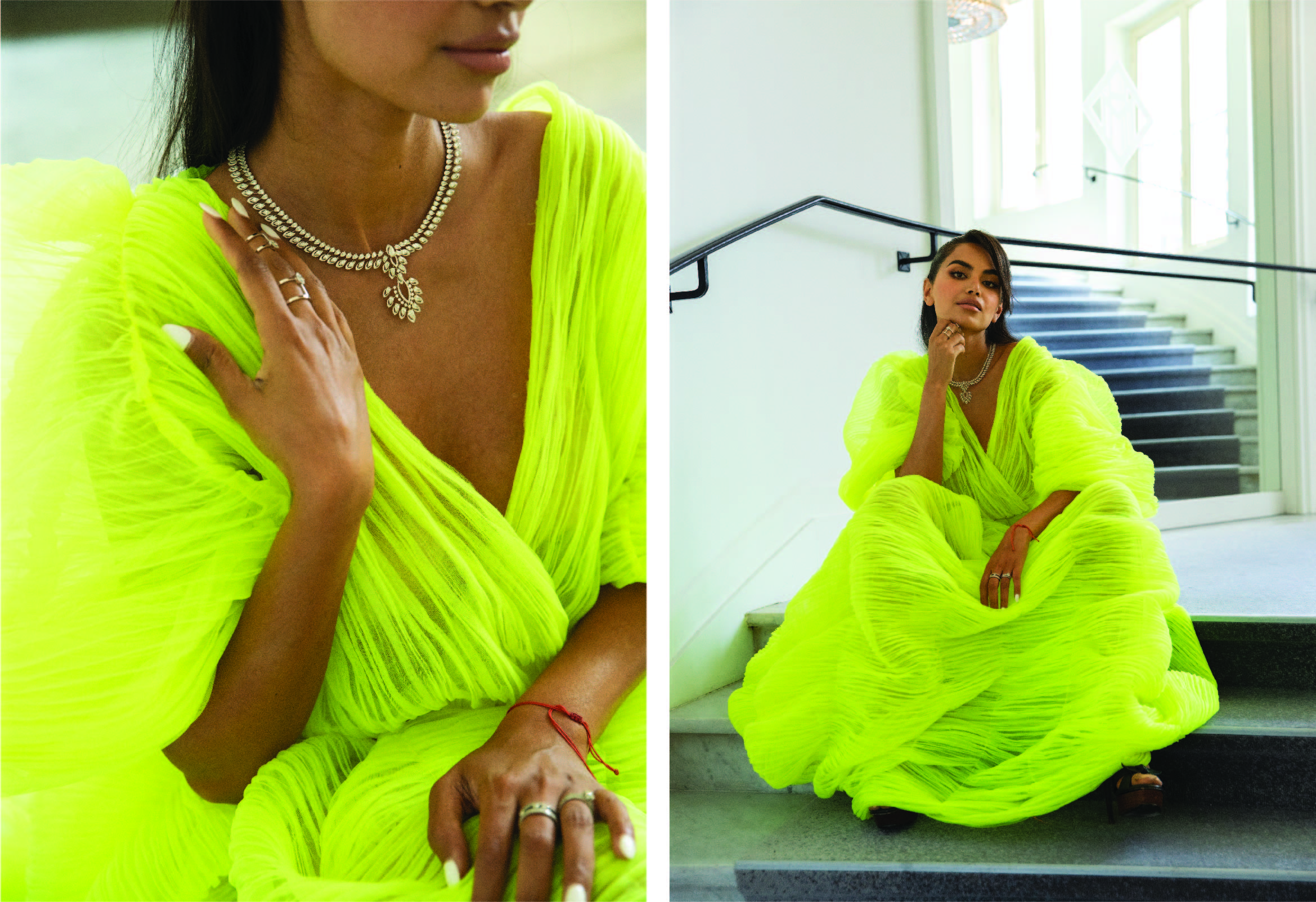 When conceptualizing the shoot, It was important for me to keep the essence of timless elegance and modern touch of colours. For the cover look I wore this beautifully pleated constructed gown by Jamemme and paired it with one of the most gorgeous yellow diamond rings by Messika. The other looks feature a petal inspired gown by Saiid Kobeisy and another airy look by Jamemme.