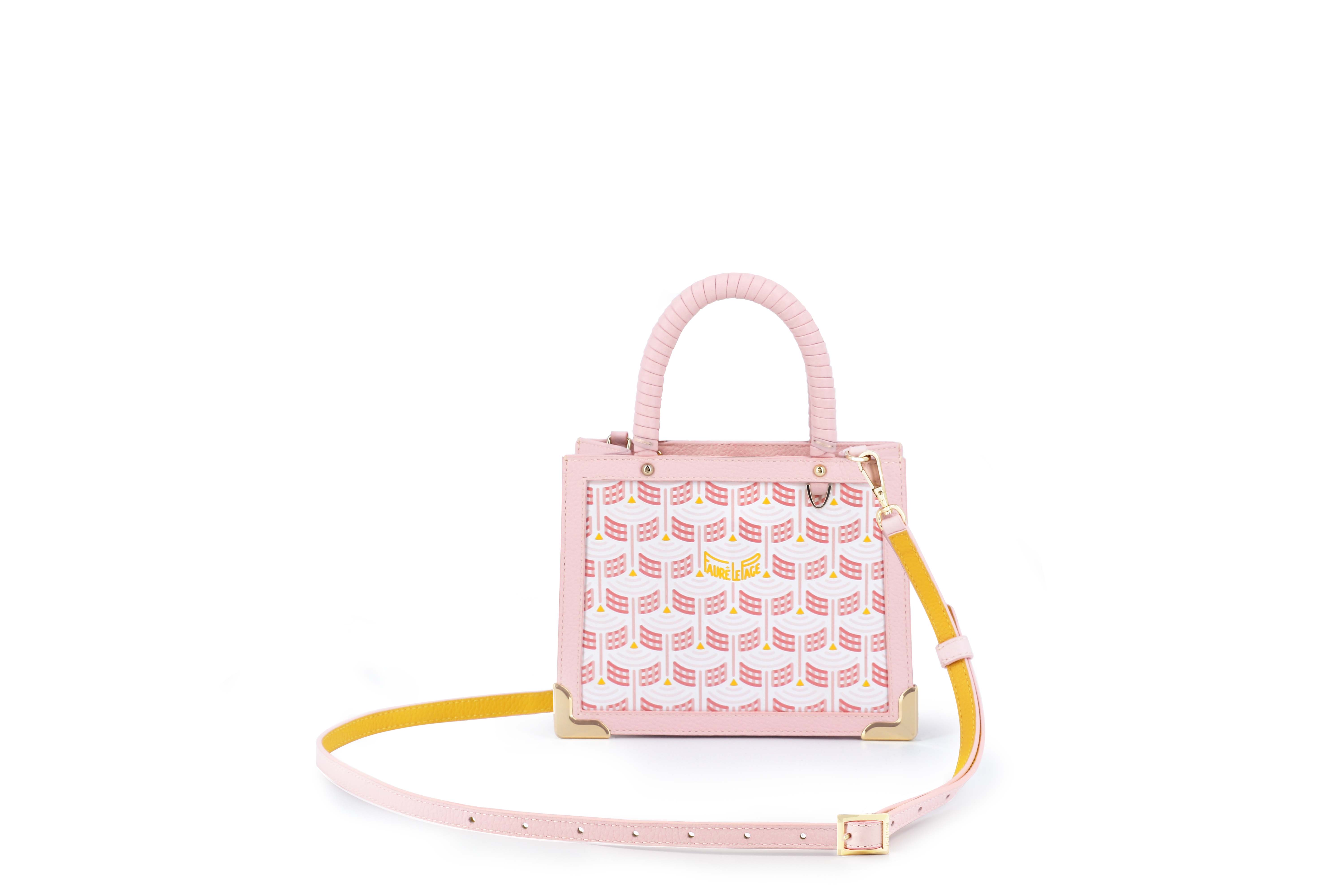 With its pink and yellow colour combination, the Saga City 18 promises a high-on-neon style. It can be worn in two different ways. A more relaxed style over the shoulder, with a long strap, or held by its handles woven in leather, for a more classic look. Four pale gold notches at the bottom of the bag make it easy to set down on any kind of terrain.