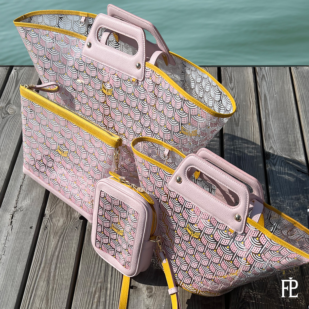 This summer, French luxury brand Fauré Le Page has introduced the Coral Collection to its portfolio of signature leather goods. The retro-inspired pink version of the iconic scale motif is a nod to the vichy scales, a classic summer pattern. Made from calfskin and transparent vinyl the elegant set of arms is the ideal companion for long sunny, summer days.