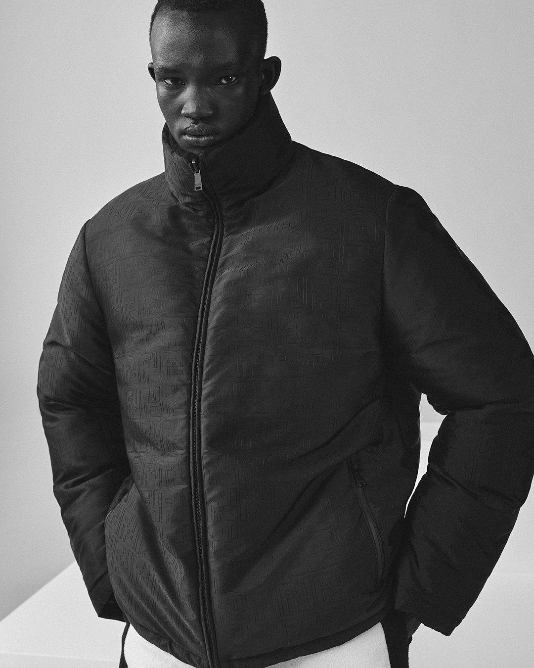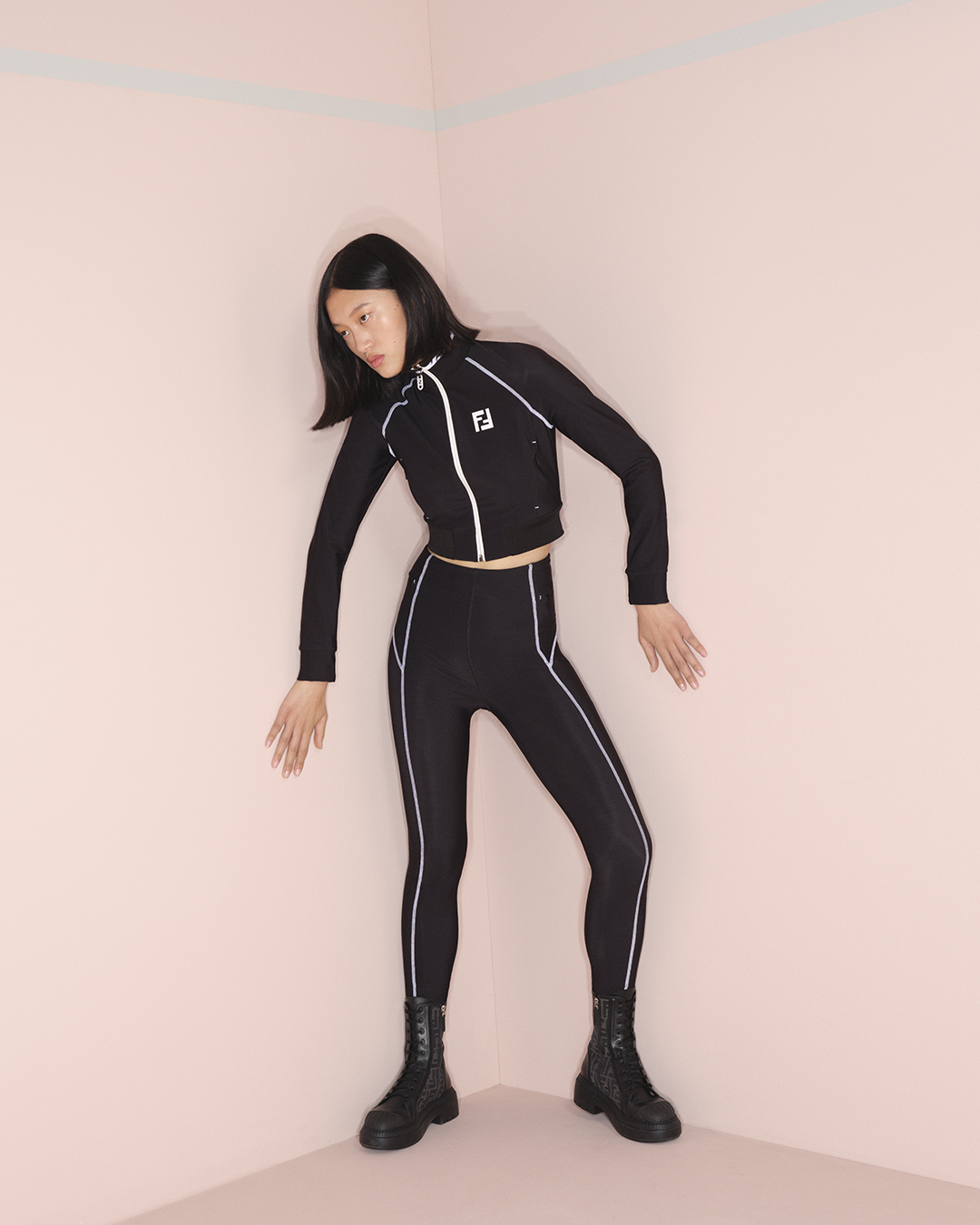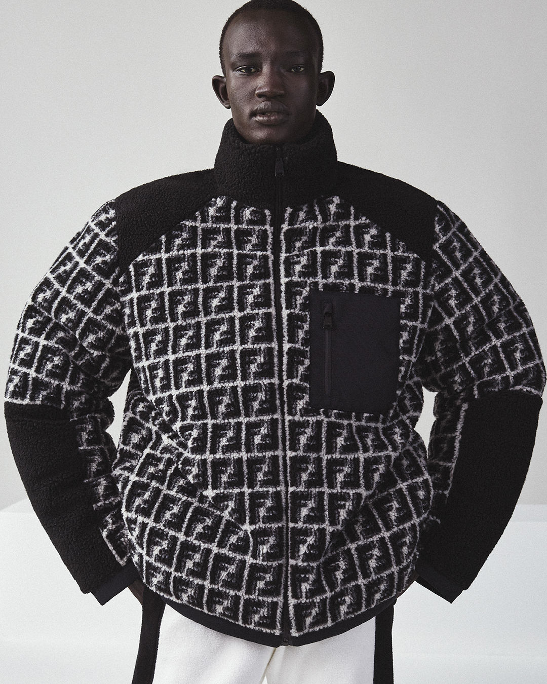 Characterised by a palette made of light grey, navy blue and black tones, with touches of red stitching and white details and zippers, the women’s outerwear is enlivened by the FF logo in the whispered version, understated yet present in its ton sur ton shades. The jackets – padded with regenerated duck feathers – are reversible and created with a windproof and waterproof fabric crafted from Aquafil’s ECONYL® yarn, a particular and innovative nylon fibre 100% regenerated from waste that would otherwise pollute the Earth. The FF logo dresses underpinning garments as well, in seamless shapes that effortlessly adhere to the body. New, fitted jackets are made in Softshell, a three-layered fabric in which Lycra is paired with membrane and pile. The lightness of the material allows more feminine and form-fitting silhouettes, yet maintaining the high performance. Matching underpinnings are crafted from recycled Lycra, featuring contrasting stitching and FF patch on the front. Also proposed with the FENDI O’Lock chain motif, technical underpinnings are designed to be mixed and matched with outerwear pieces.