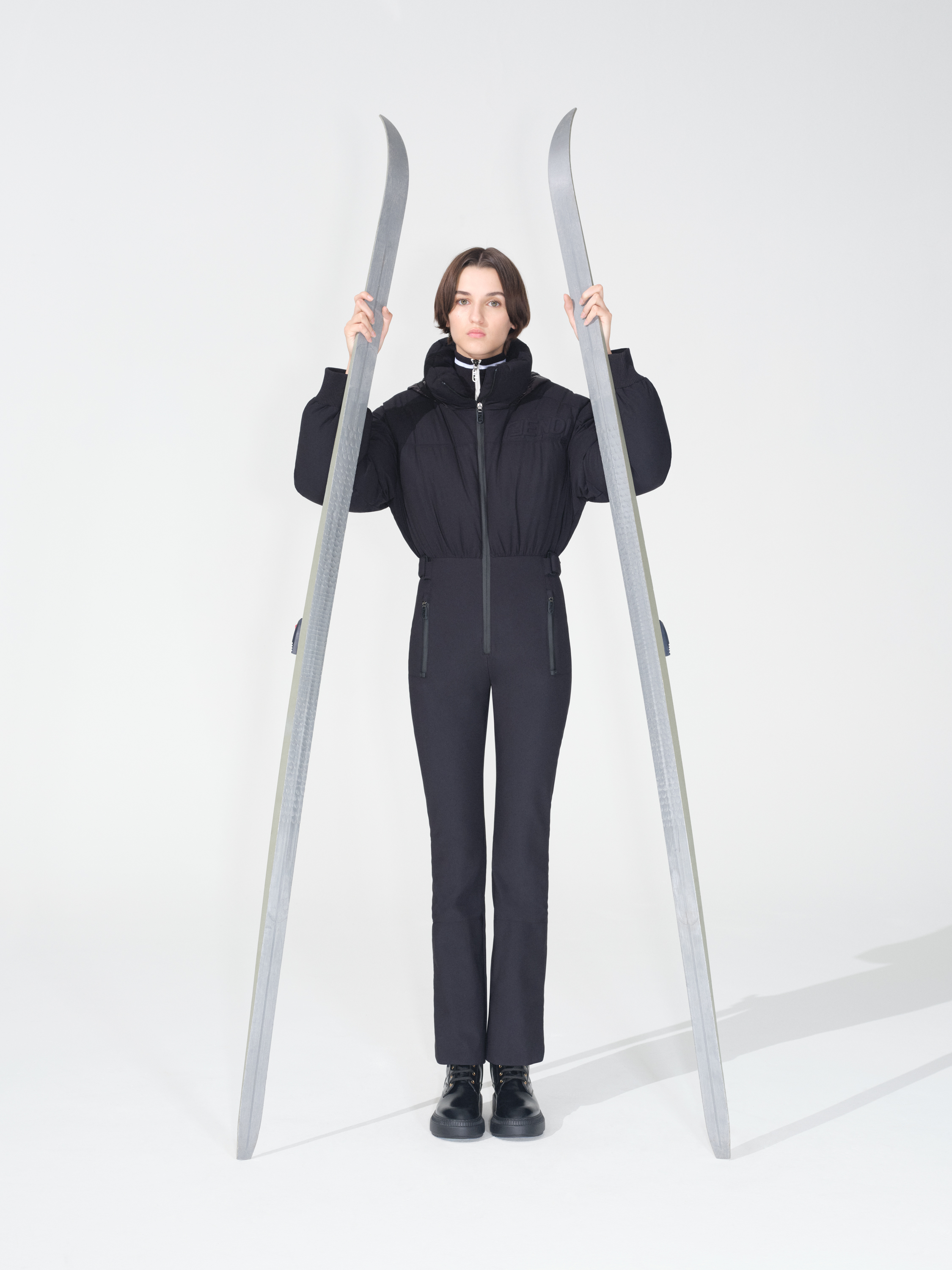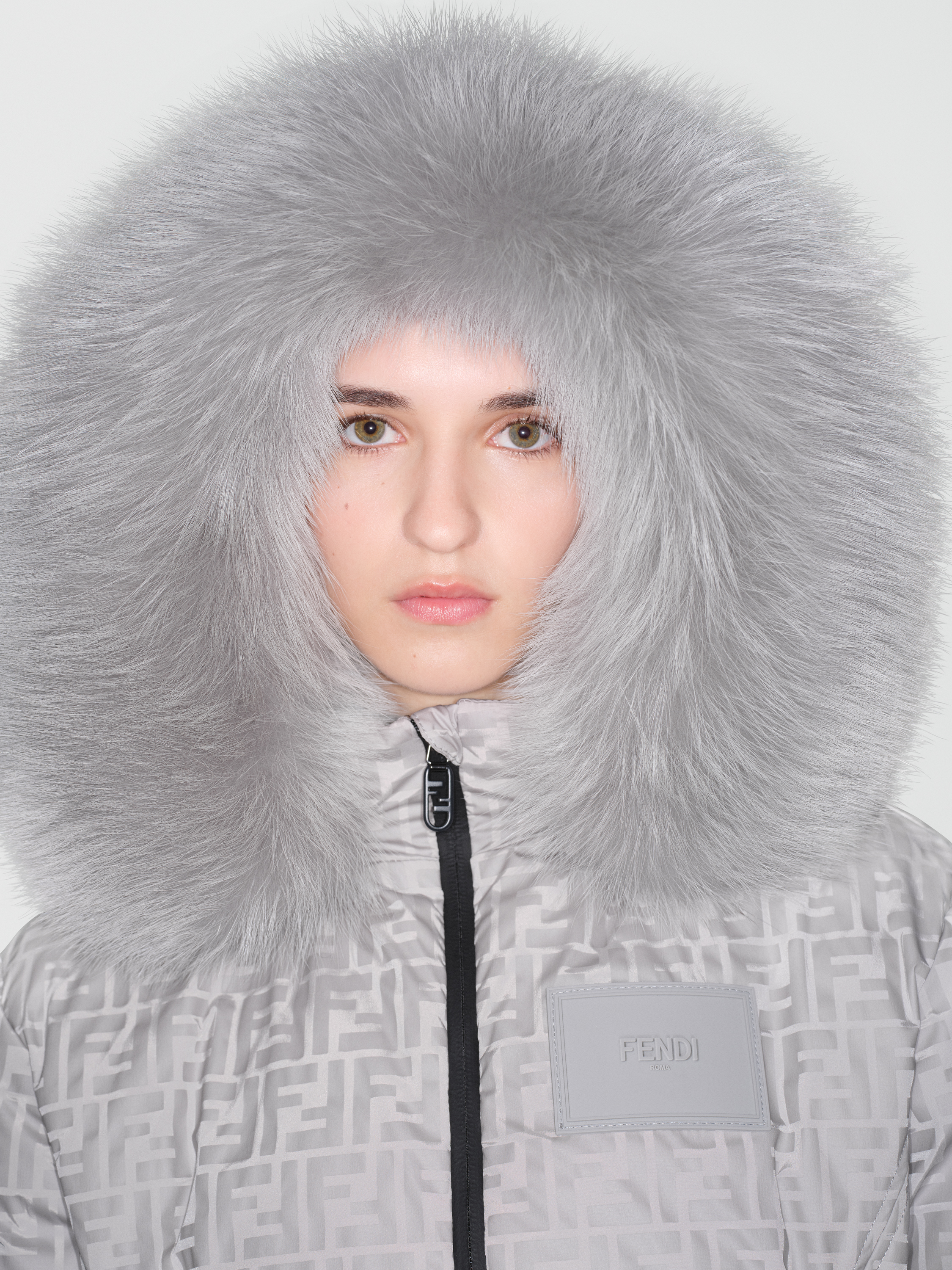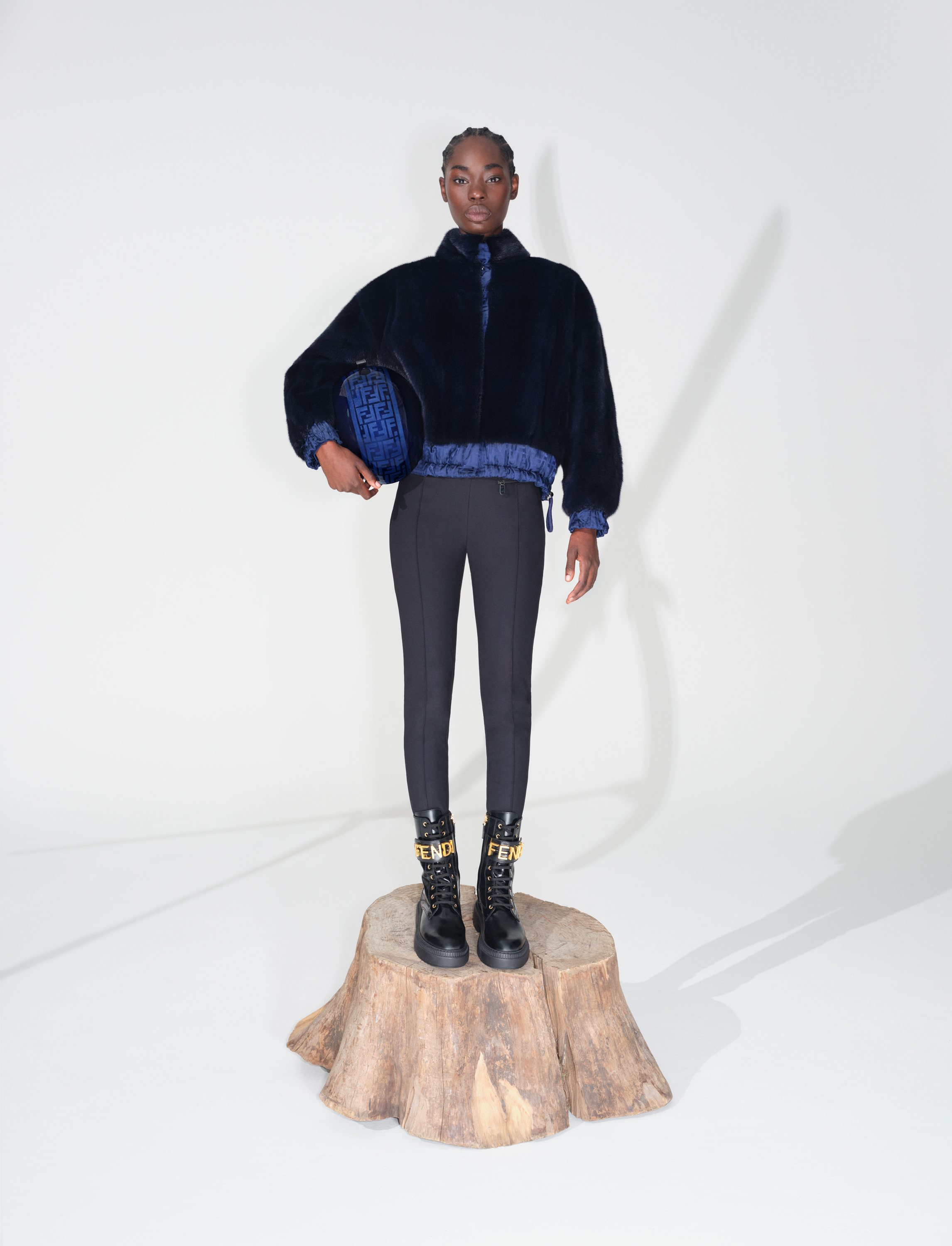 Characterised by a palette made of light grey, navy blue and black tones, with touches of red stitching and white details and zippers, the women’s outerwear is enlivened by the FF logo in the whispered version, understated yet present in its ton sur ton shades. The jackets – padded with regenerated duck feathers – are reversible and created with a windproof and waterproof fabric crafted from Aquafil’s ECONYL® yarn, a particular and innovative nylon fibre 100% regenerated from waste that would otherwise pollute the Earth. The FF logo dresses underpinning garments as well, in seamless shapes that effortlessly adhere to the body. New, fitted jackets are made in Softshell, a three-layered fabric in which Lycra is paired with membrane and pile. The lightness of the material allows more feminine and form-fitting silhouettes, yet maintaining the high performance. Matching underpinnings are crafted from recycled Lycra, featuring contrasting stitching and FF patch on the front. Also proposed with the FENDI O’Lock chain motif, technical underpinnings are designed to be mixed and matched with outerwear pieces.