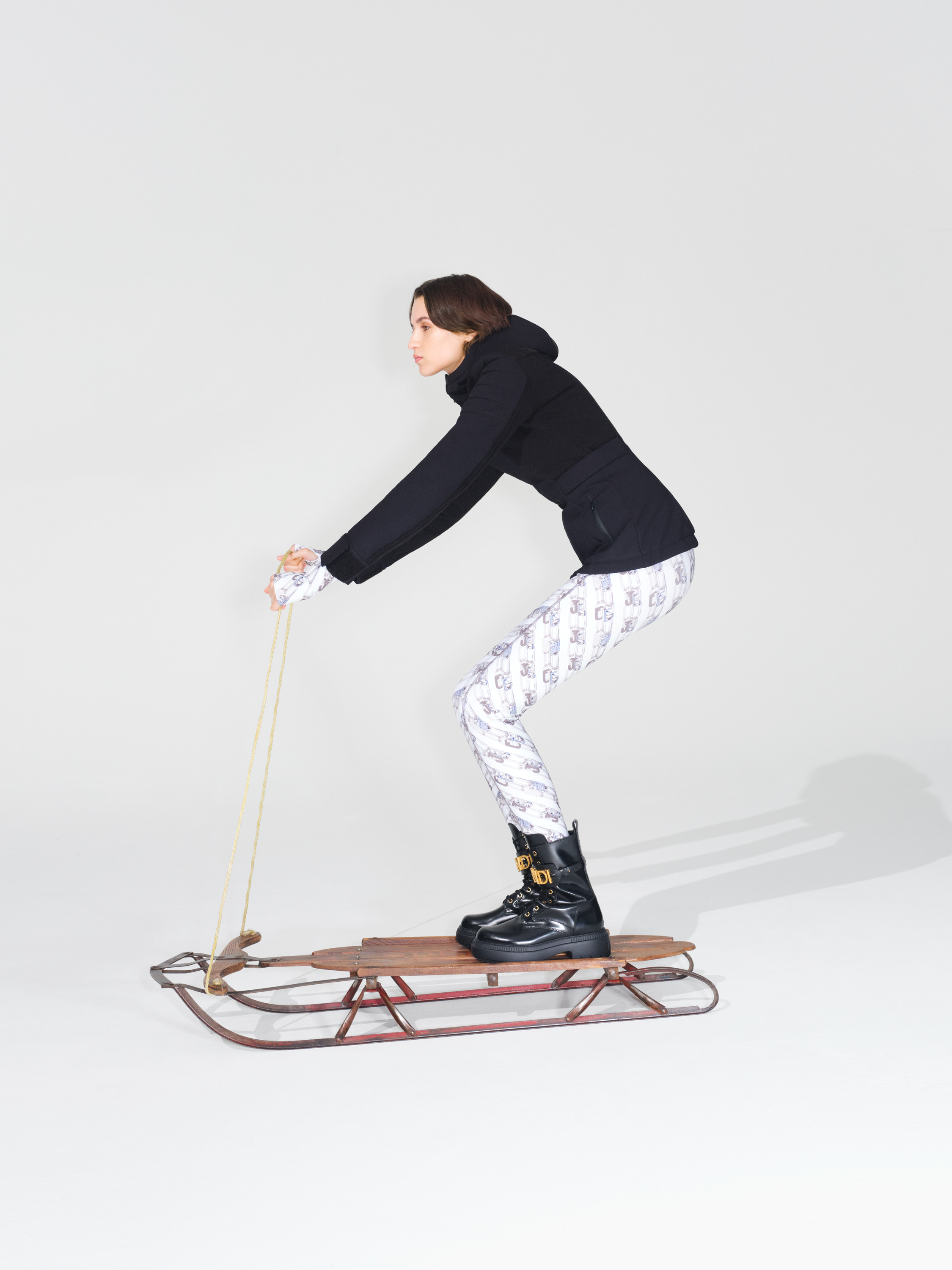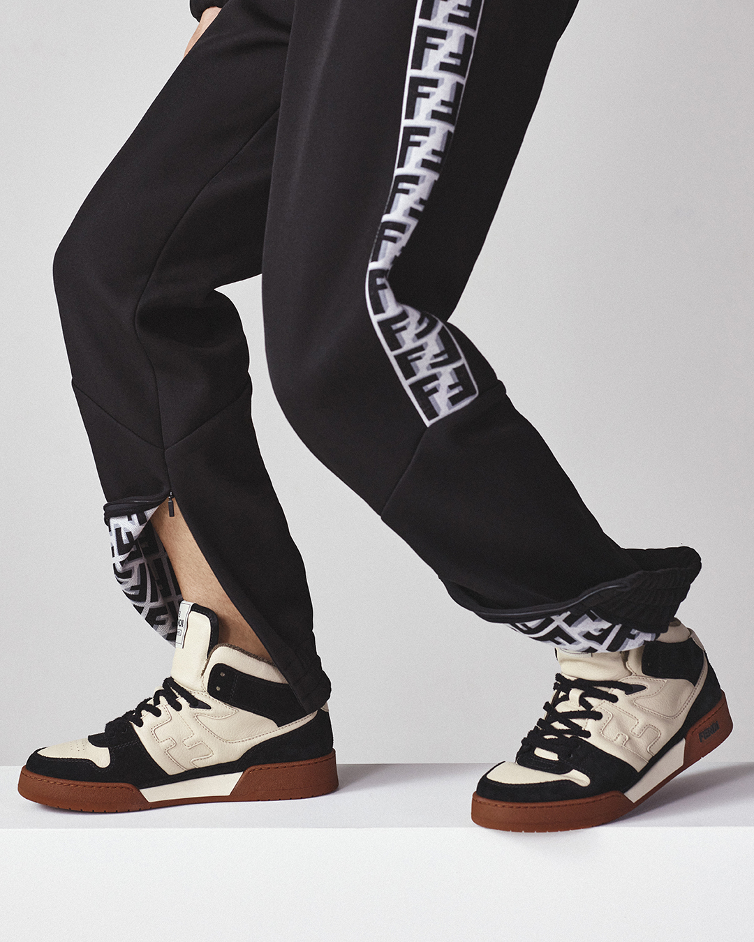 The menswear palette follows the shades of black and white with touches of burgundy. The Vichy motif, introduced on the Men’s Fall/Winter 2022-23 runway, stands out on ski suits, puffer jackets and matching pants. In black and white tones, it is combined with the FENDI Roma logo and sporty details. The three-dimensional FF logo dresses a jogger and sweatshirt set in black and white. Among the after-ski proposals, pile hoodies and matching pants in colour blocks feature the FENDI Roma logo.