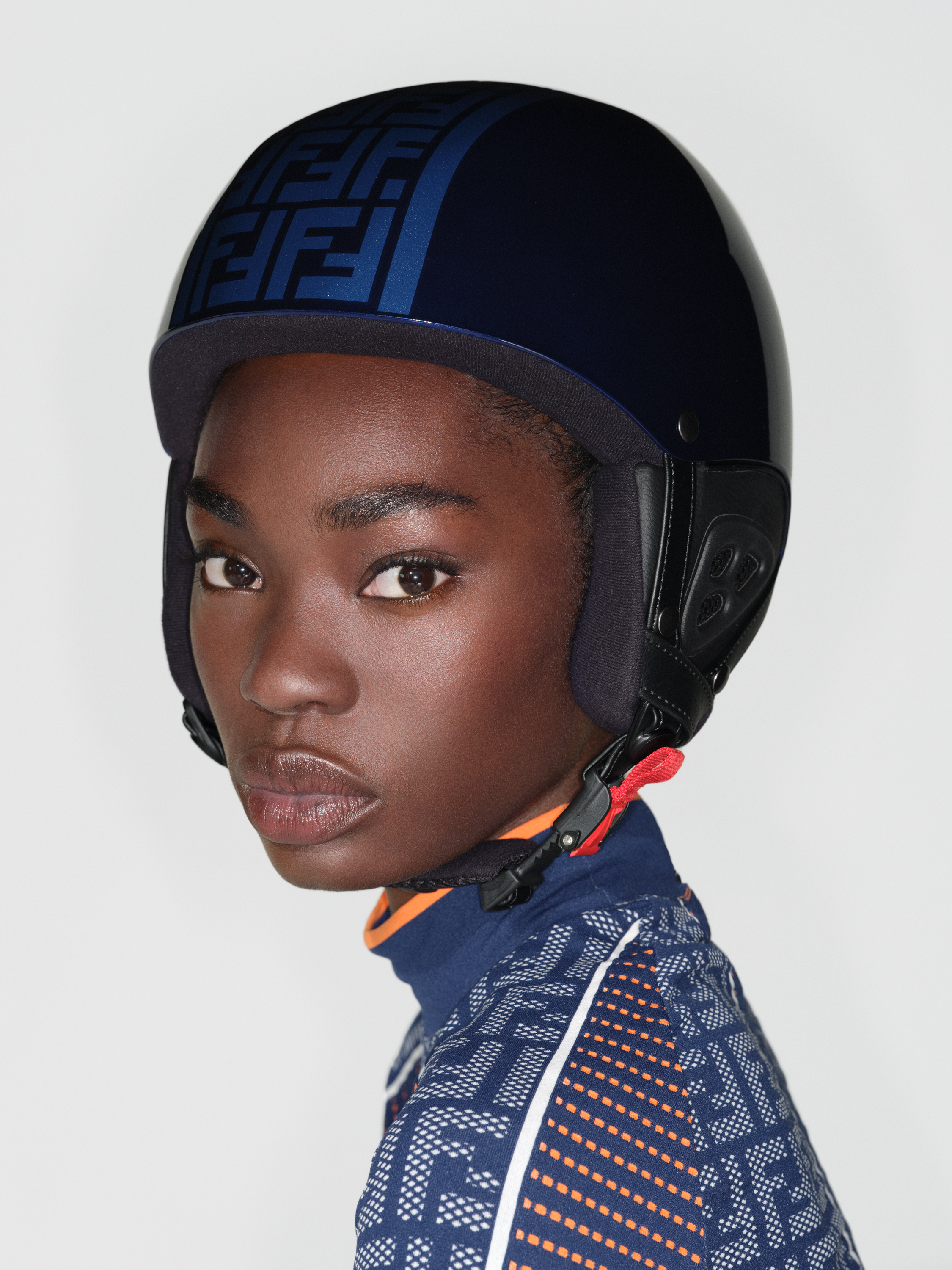 Ski accessories complete the story: ski helmet, gloves and mask all feature the iconic FF logo, tonal or in the classic brown and tobacco shades, following the toned-down palette of ski garments.