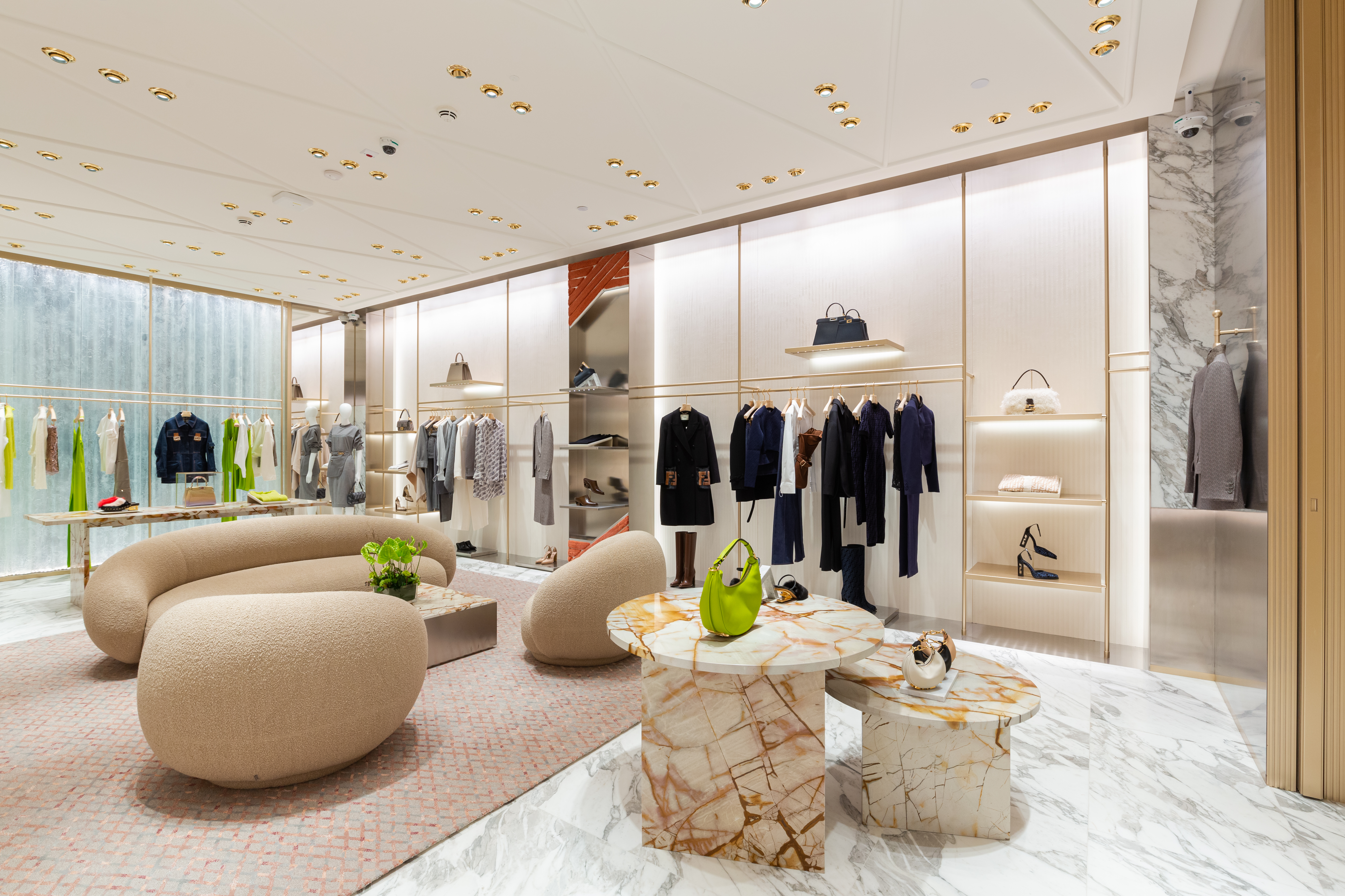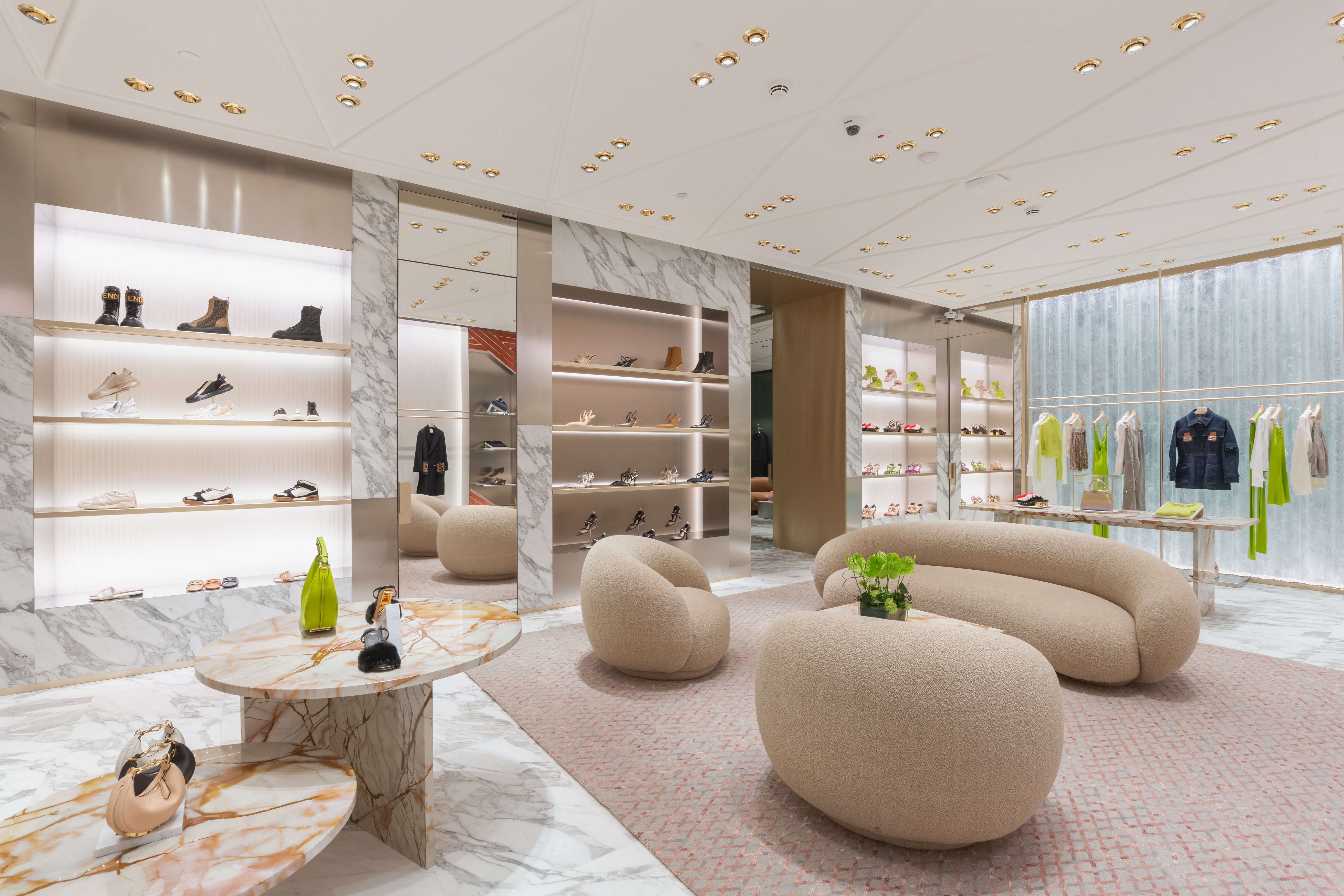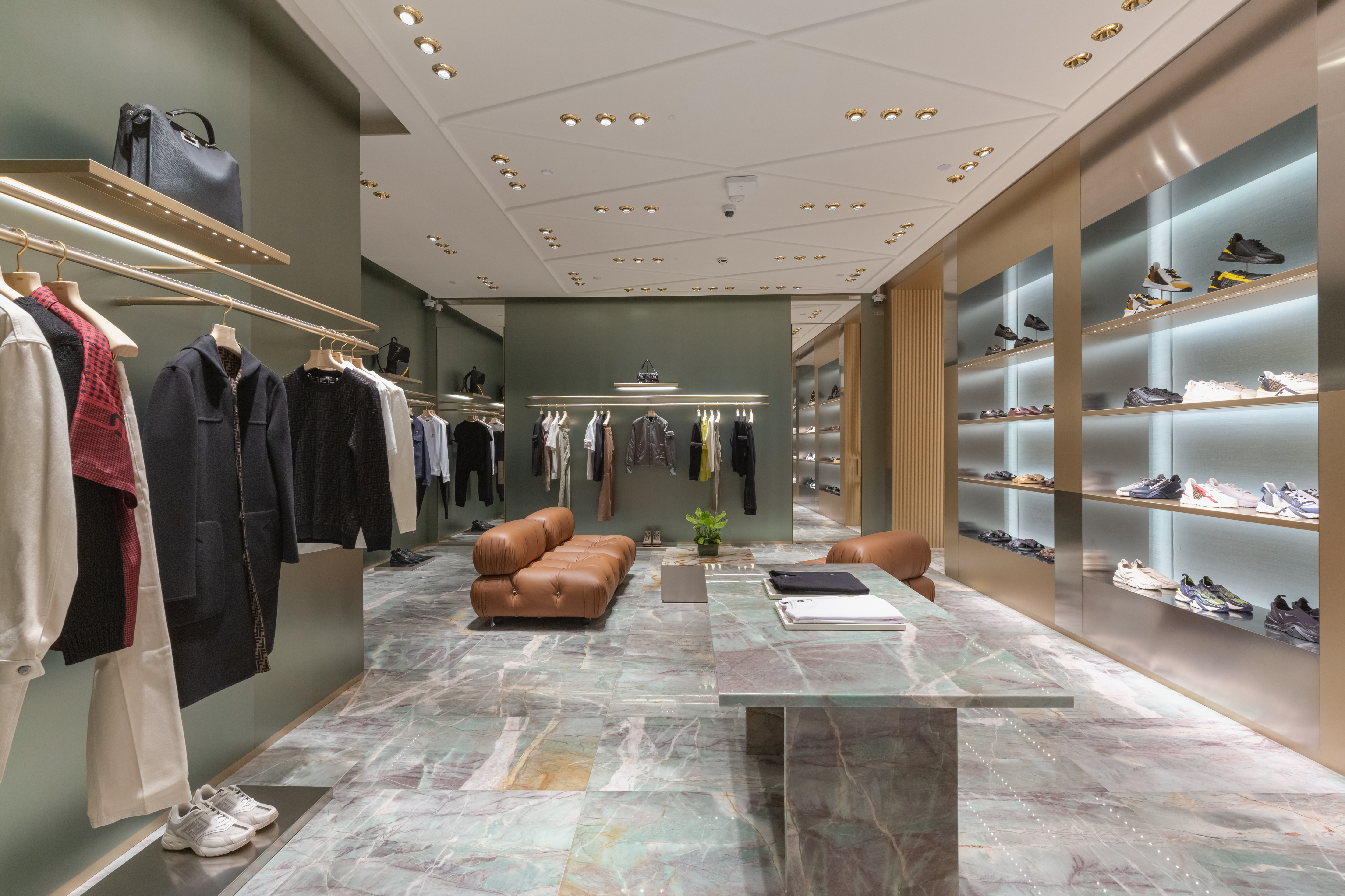 From this space, clients have access to the ready-to-wear and shoes sections. The woman’s ready-to-wear room is characterised by a palette of ivory and pink, accentuated by hues of warm champagne tones and featuring precious Quarzite Spiderman marble tables. A focus display with the diagonal motif of the iconic Astuccio fur coat adds a special touch.