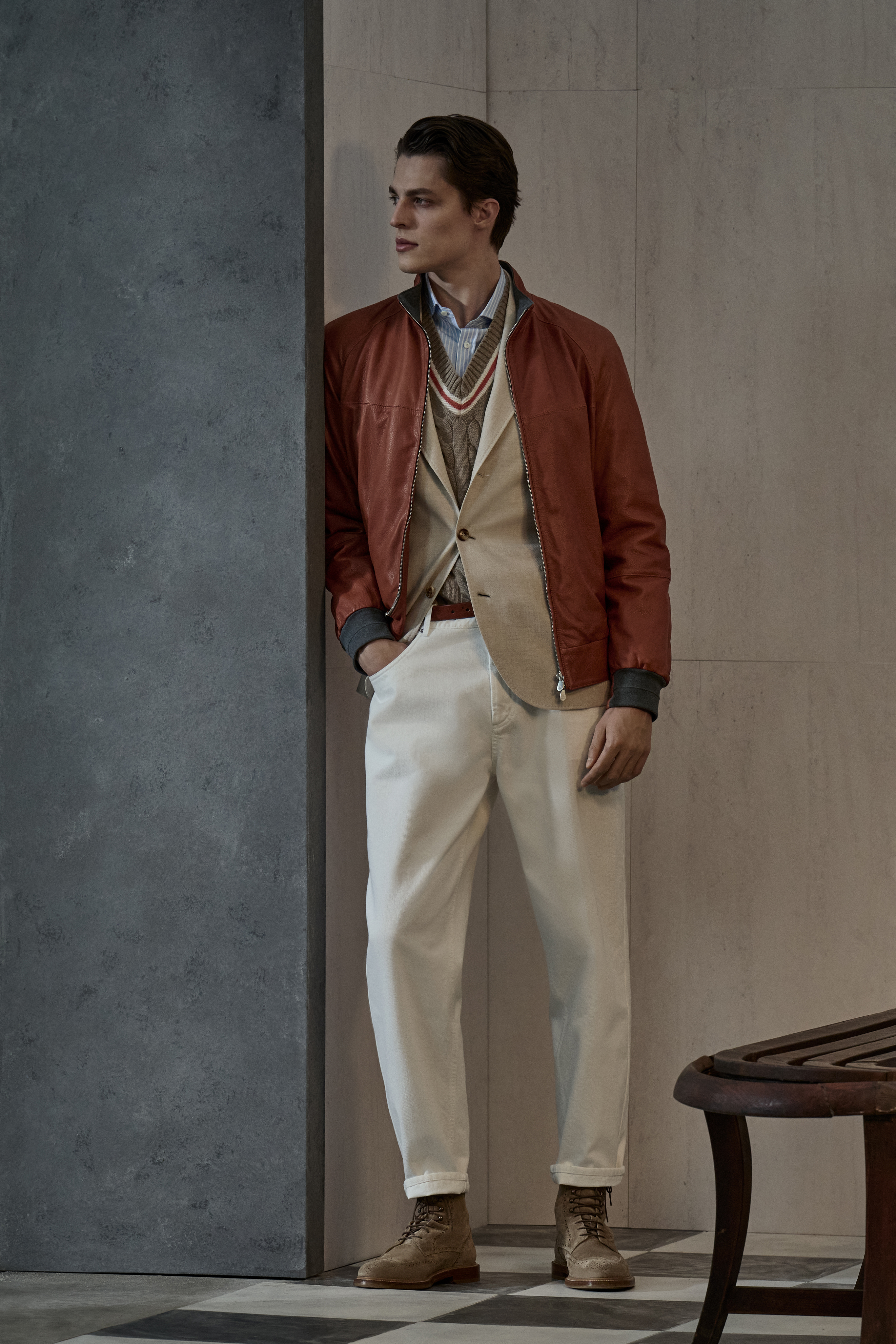 The excellence of Brunello Cucinelli materials enriches the iconic style of this grained leather bomber jacket, characterized by the leather’s slightly “rustic” feel. The classic details such as the rib knit cuffs, collar, and bottom complete the garment with a sporty touch.