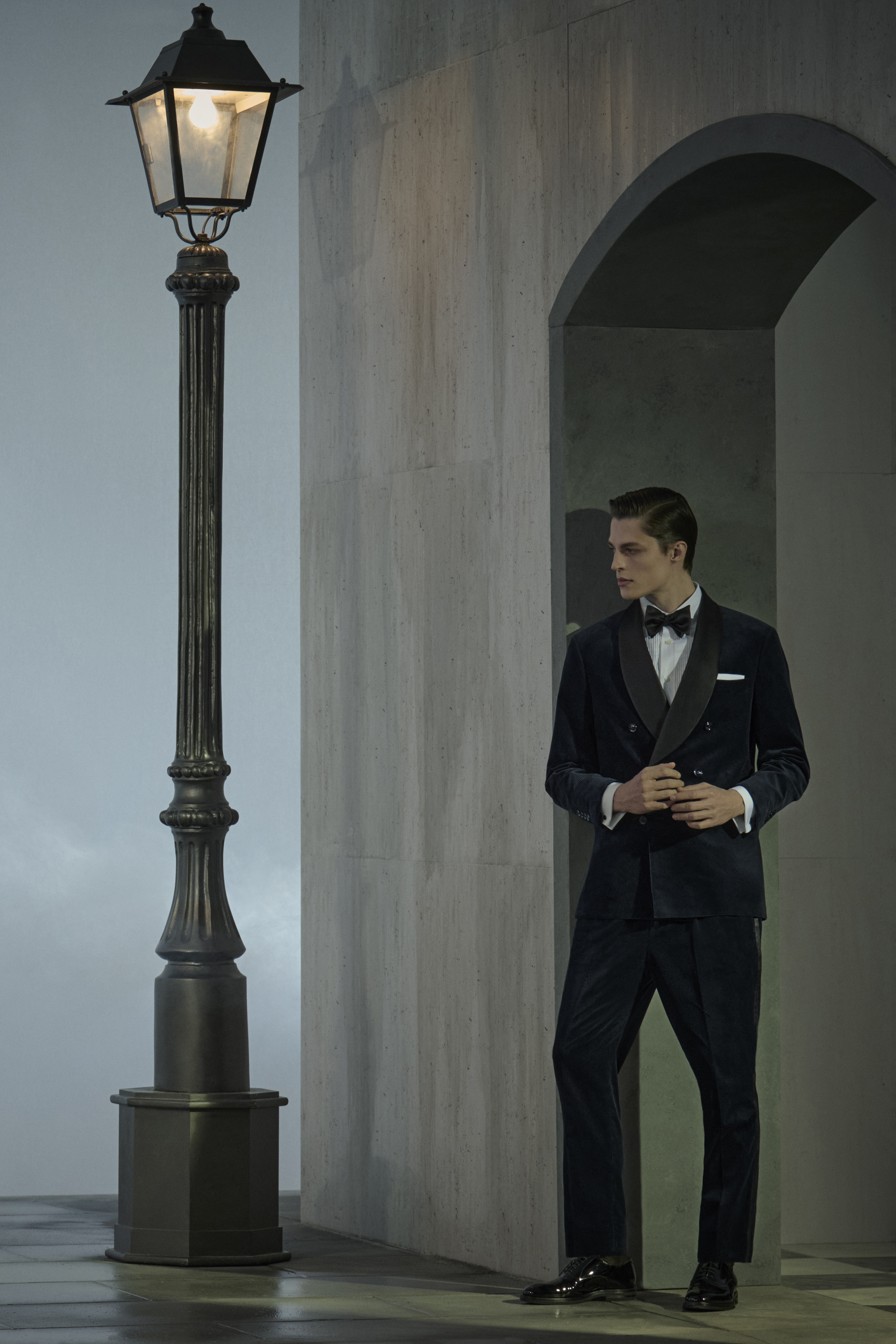 Refined cotton corduroy updates the timeless style of this tuxedo, balancing modern notes with elegant retro inspiration. The glossy silk satin shawl lapel is paired with a distinct one-and-a-half-breasted closure, while the fit is tapered through the chest with slightly pronounced shoulders to highlight the male physique. The double pleated trousers complete the tailored feel.