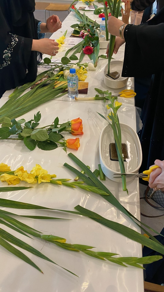 At the second part, participants learned Rising From, the first basic form all the Ikebana learners learn at the beginning of the path. Ms. Amani Alshehhi, is the first United Arab Emirates national to obtain the certification of Ikebana Instructor from the Ohara School Japan did the demonstration first, followed by the hands-on creation by the participants.