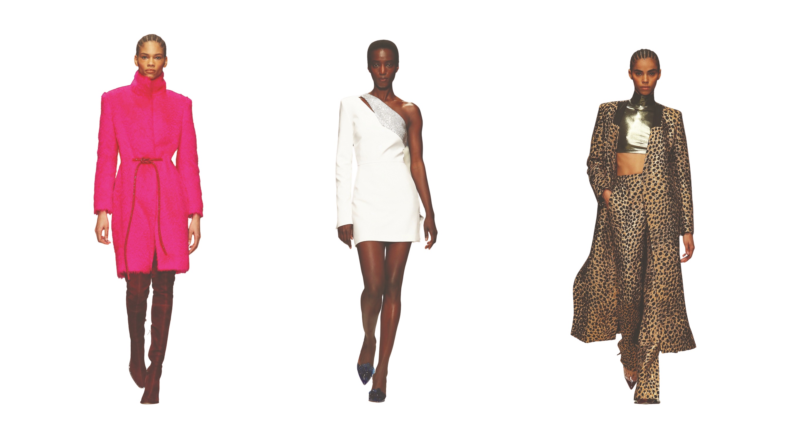 The collection includes pieces like wide bomber jackets, minidresses, and crop tops paired with wide-leg and flared trousers and skirts along with pieces that are inspired by masculine elements such as tuxedo jackets and coats. All in the range of vibrant fall colors.