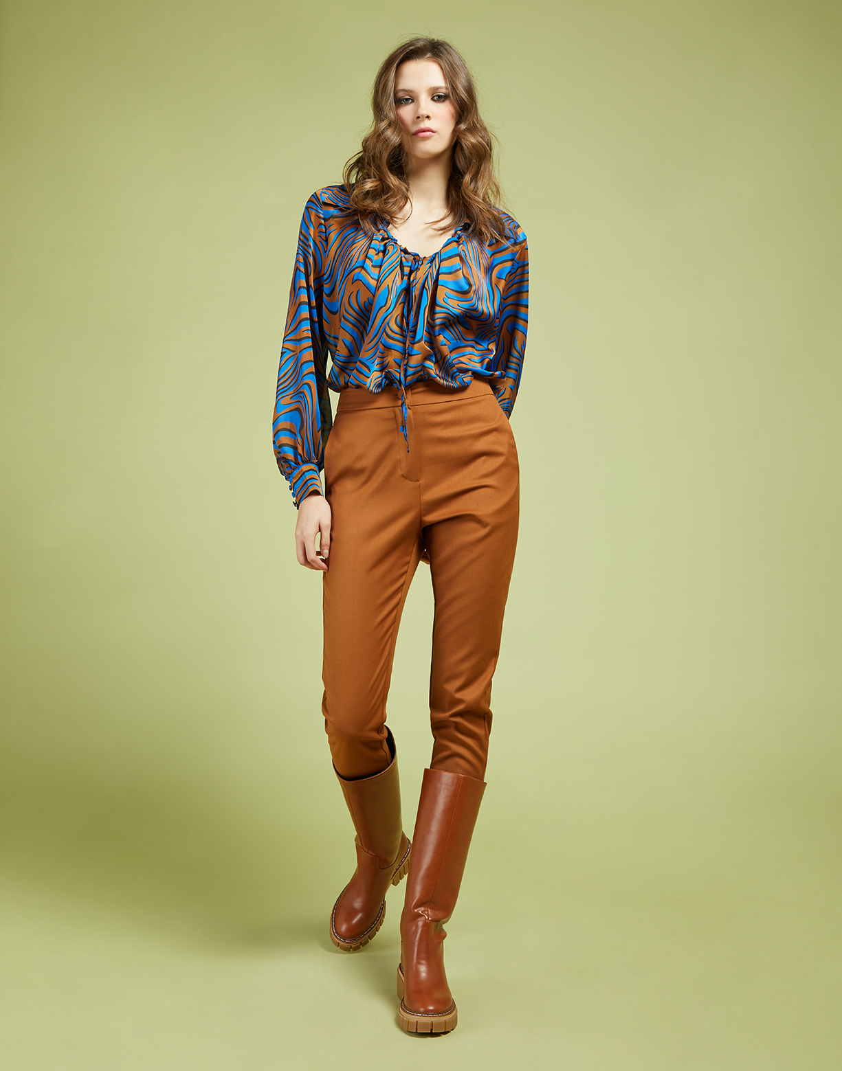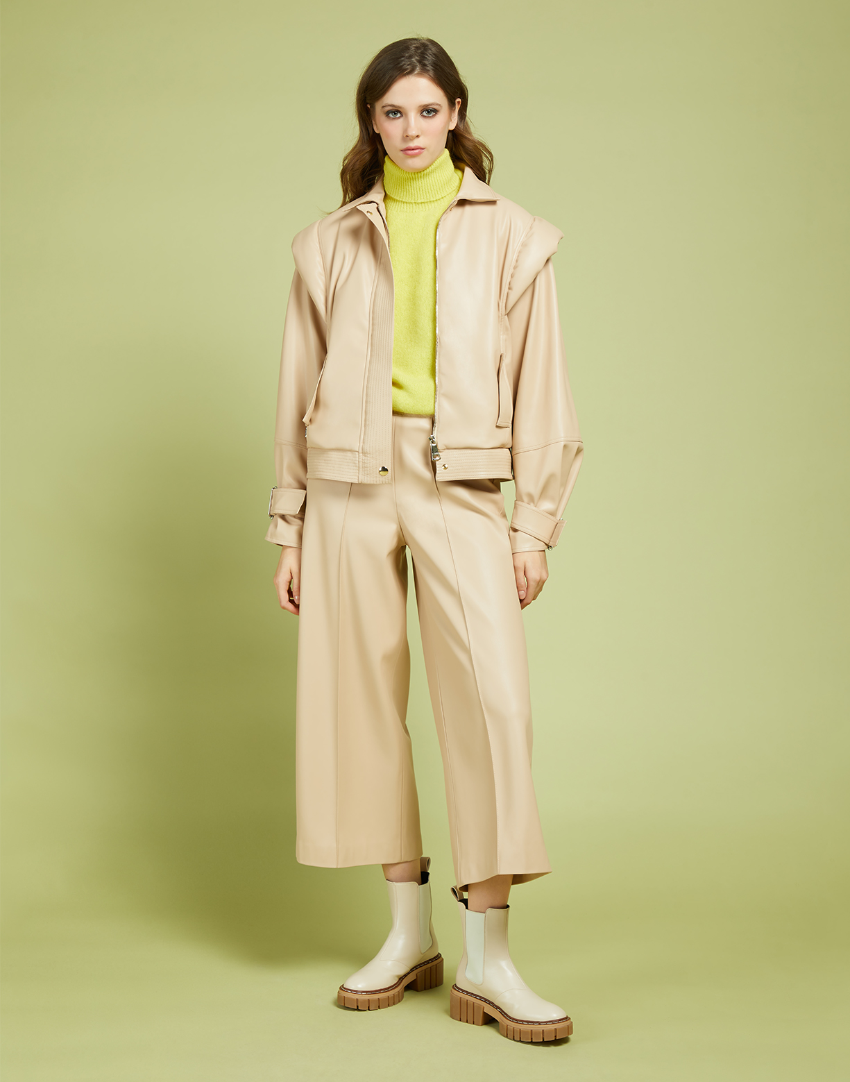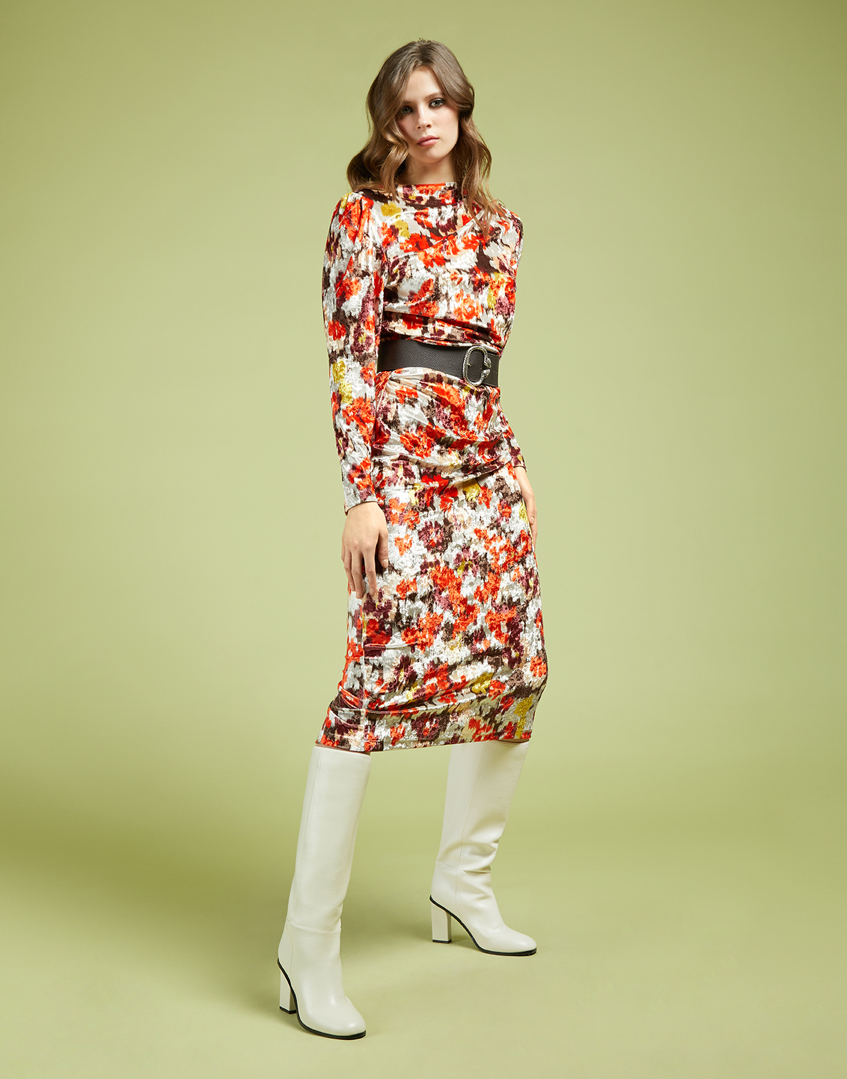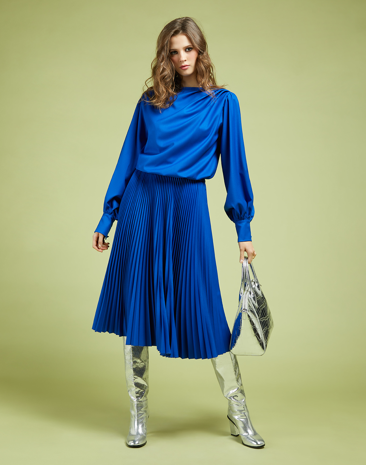The collection sees an interesting mix of exuberant and feminine pieces aligned with the image of a modern woman who desires to be elegant and can adapt to any occasion. A focus on fabric lives through the brand’s previous and current collections, demonstrated through maximum attention to detail and visible stand out pieces like eco-leather, cool wool, smooth and striped velvets, check wool and jacquard, soft chenille, poplin and silk acetate for shirts and under-jackets, including a wide range of denim and knitwear.
