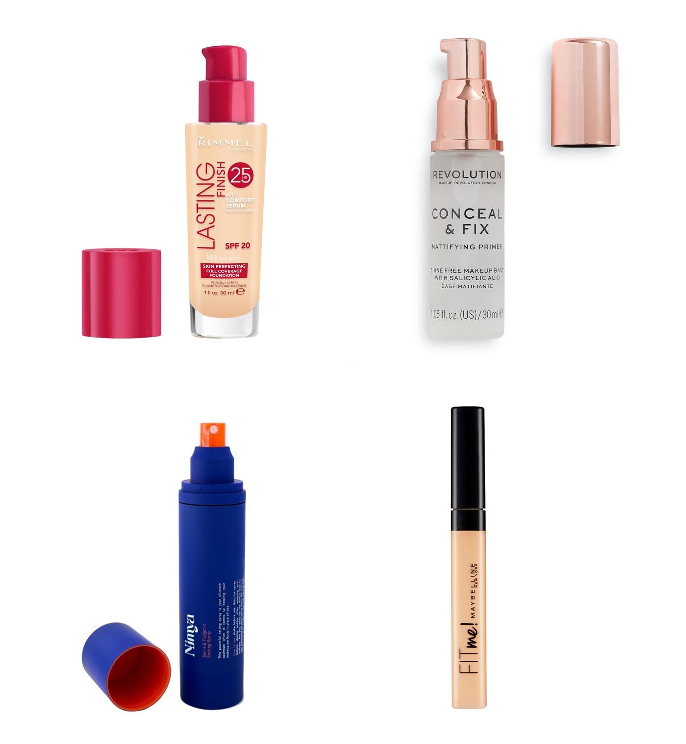 Image (Clockwise): Rimmell Lasting Foundation, Revolution London Primer Matte, Maybelline Fit Me Concealer, Nimya Setting Spray