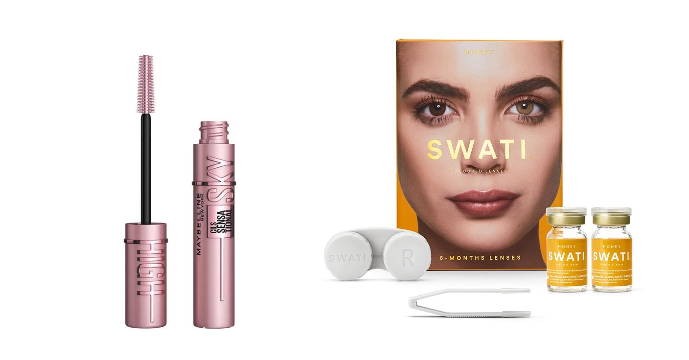 Image (from left): Maybelline Lash Sensational Sky High Mascara, Swati Honey Colored Lenses