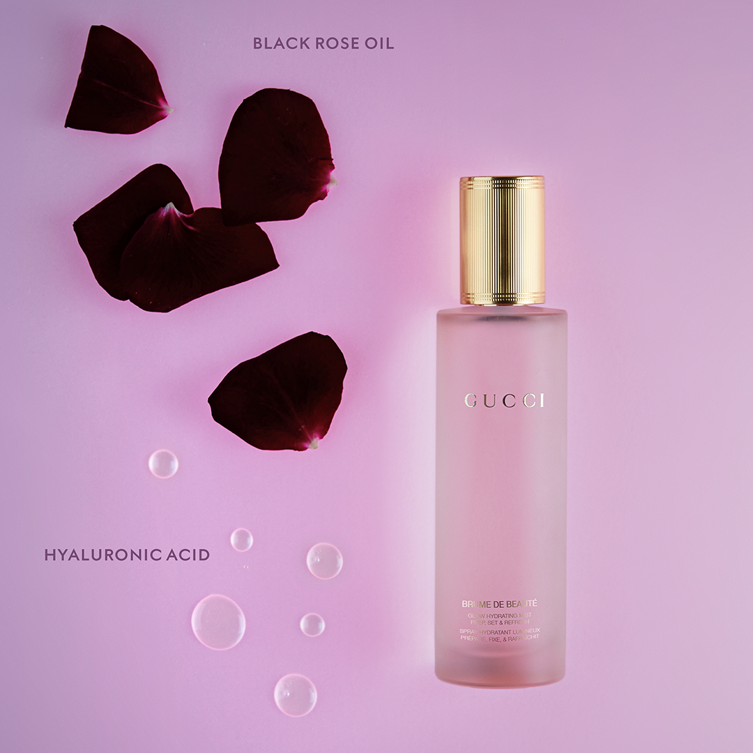 Gucci Beauty’s signature Black Rose Oil is the formula’s secret ingredient, creating the mist’s soothing and antioxidant properties. Infused with Hyaluronic Acid, the mist provides hydration and a healthy-looking glow skin while a blend of film former actives help set makeup. From preparing the skin to perfecting and maintaining a fresh face throughout the day, Brume De Beauté is a mist that does it all.