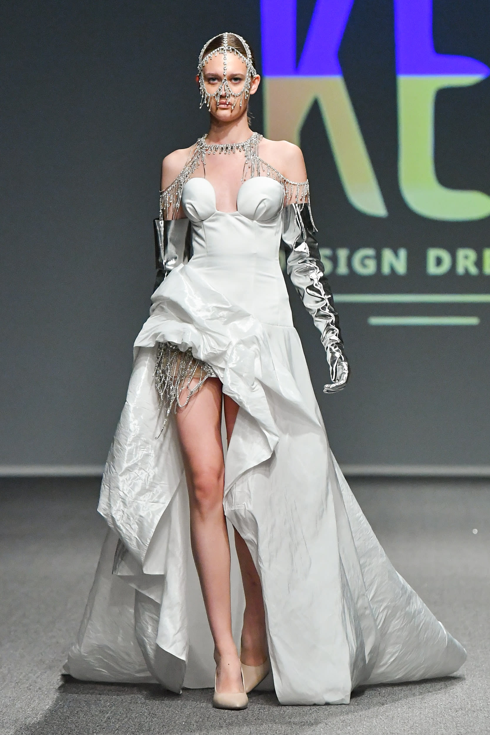 The Ukrainian brand that prides itself on having revolutionized wedding and evening fashion, comes to Arab Fashion Week in search of new retail markets due to the ongoing war. But the ongoing turmoil at home didn’t stop its designer Elena Kondratova from injecting d3 with a potent dose of sexy via side slits, plunging necklines and modern goth bride details. Made by Ukrainian seamstresses and tailors, the Kel made a splash at Arab Fashion Week with its intricate accessories – warrior princess face masks fashioned with chains, sequined crowns and veils that conjured the mystery of a bygone era and history’s fabled female icons.