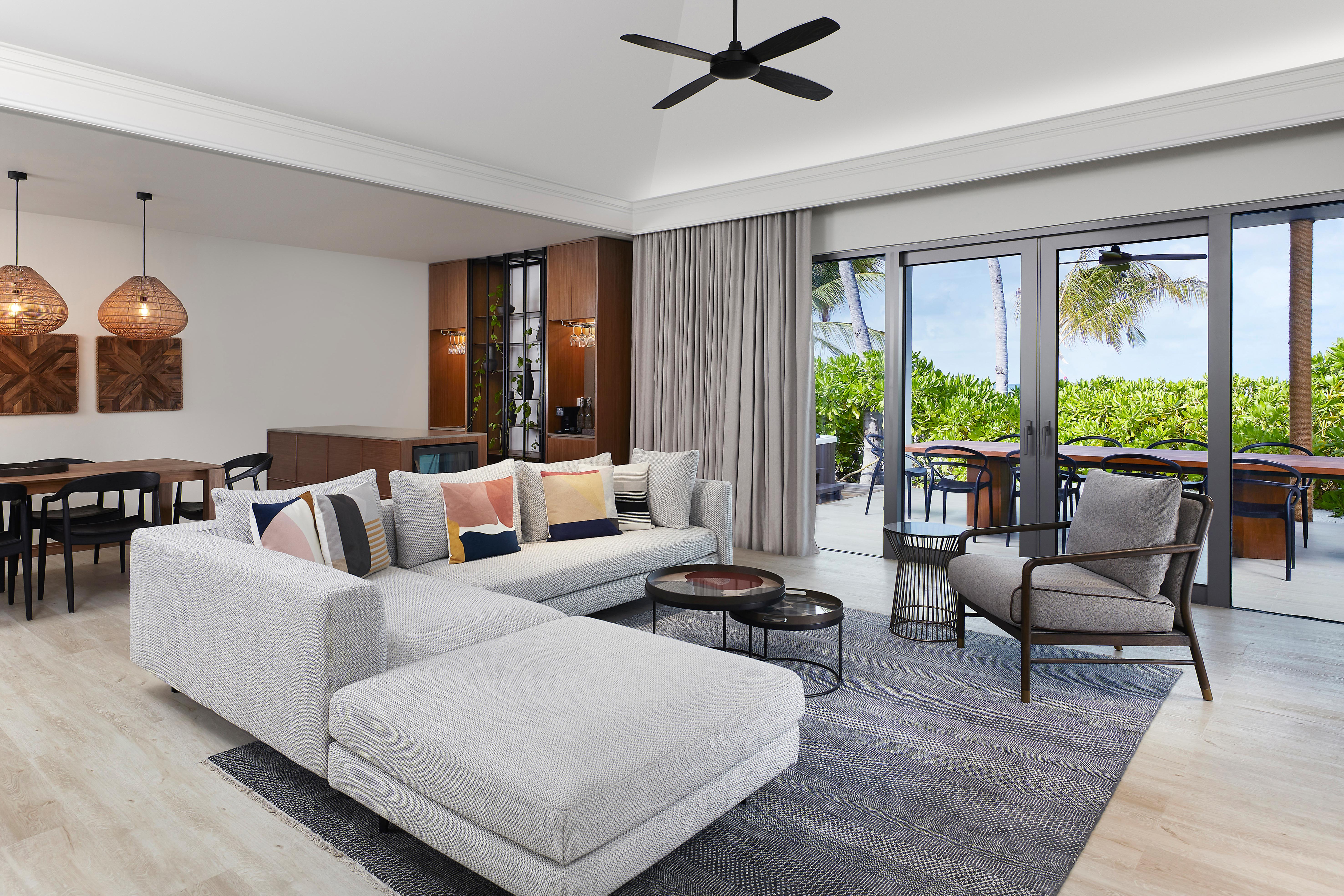 Nestled within a discreet island alcove, Thilamaafushi Villa is ideally suited for families and groups in search of a secluded hideaway. Swaying palm trees provide privacy around the villa, whilst fresh ocean breezes flow through the villa's three bedrooms, three bathrooms, expansive living spaces, and alfresco living spaces.