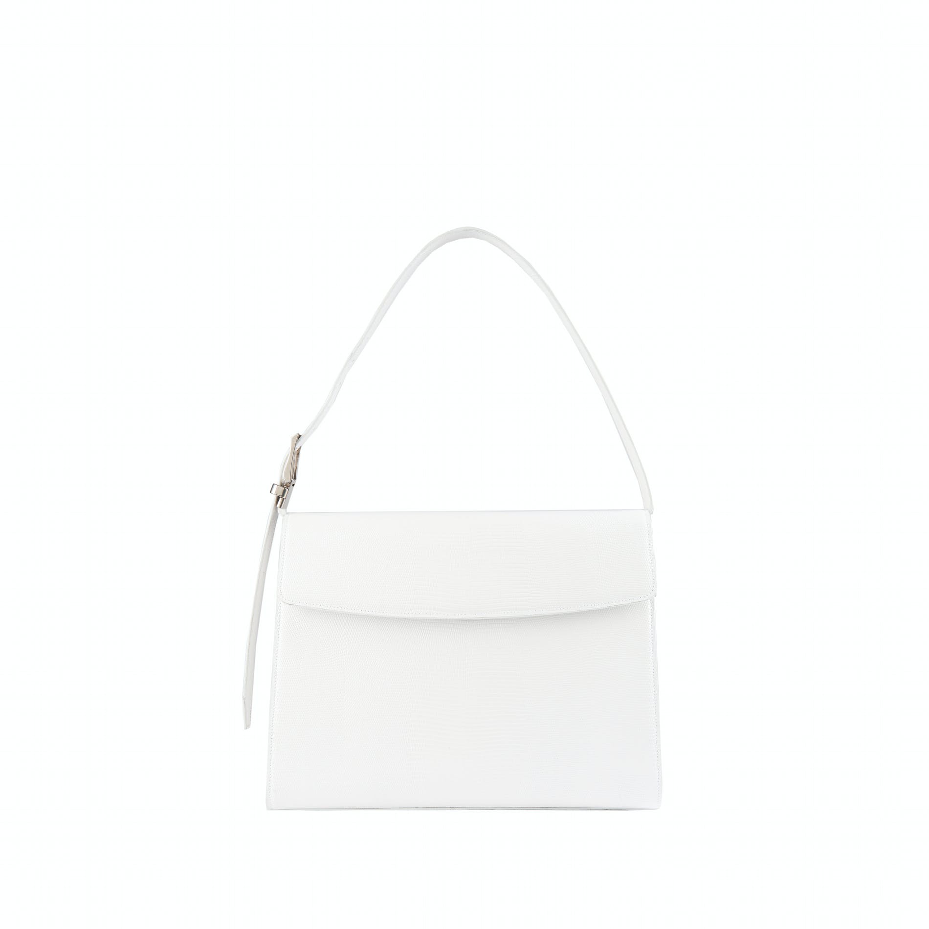 An embossed logo is barely detectable on the bag’s front, and another is hidden, on an invisible clasp beneath a flap with a slightly curved edge.