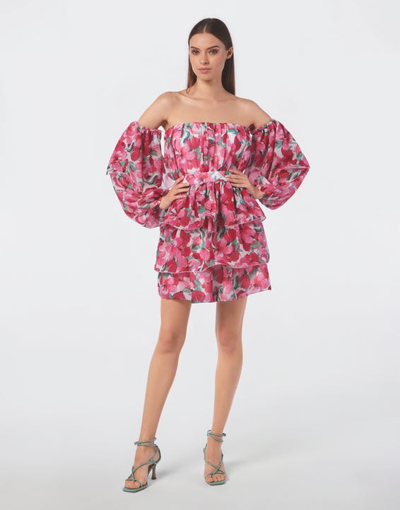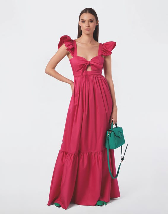 The pastel colours, white, pink, sky, fuchsia and emerald combined with Vichy, poplin tell images of skirts with important volumes, sweatshirts and T-shirts enriched by necklines with single-coloured stones or dresses with flounces and ruffles, with puffed sleeves or foulard shirt dress tightened at the waist by belts.