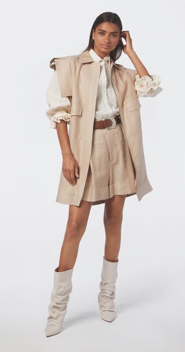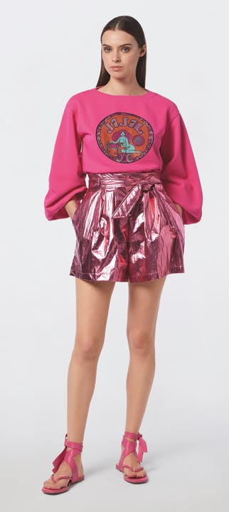 A suede blazer is combined with palazzo trousers for an ultra chic effect, the miniskirt or the short steal retro emotions with sweatshirts and embroidered shirts, while the dresses have sequin details and new volumes.
