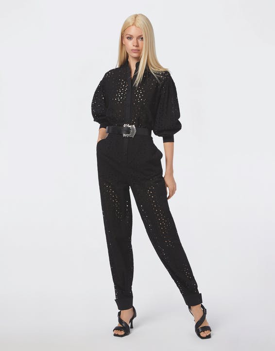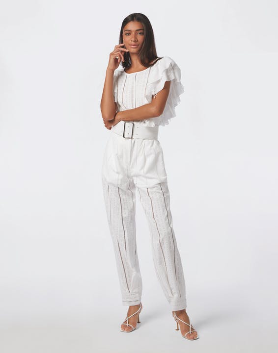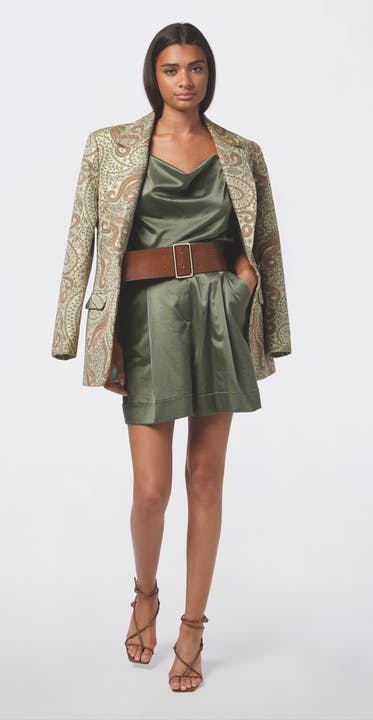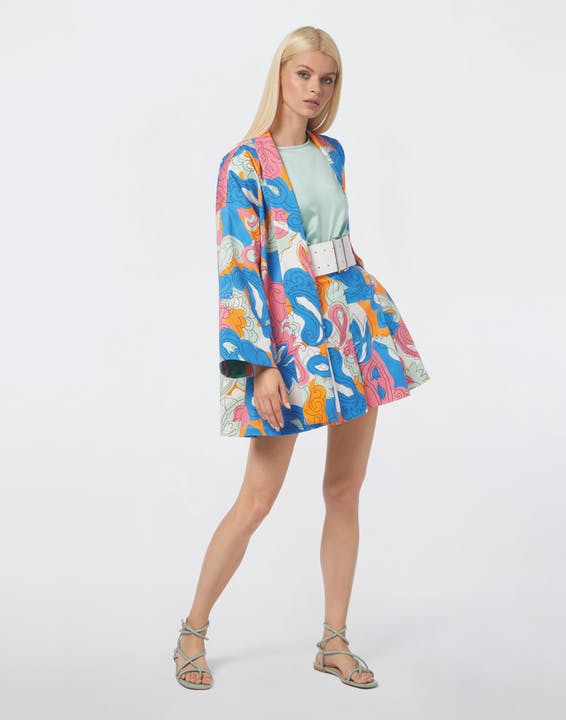 The audacity of the paisley design is declined in new chromatic variations, developing new textures, which are articulated on blouses and dresses in natural fabrics enriched with trimmings, jumpsuits and afternoon outfits, in poplin with laser-cut edges and broderie anglaise lace.