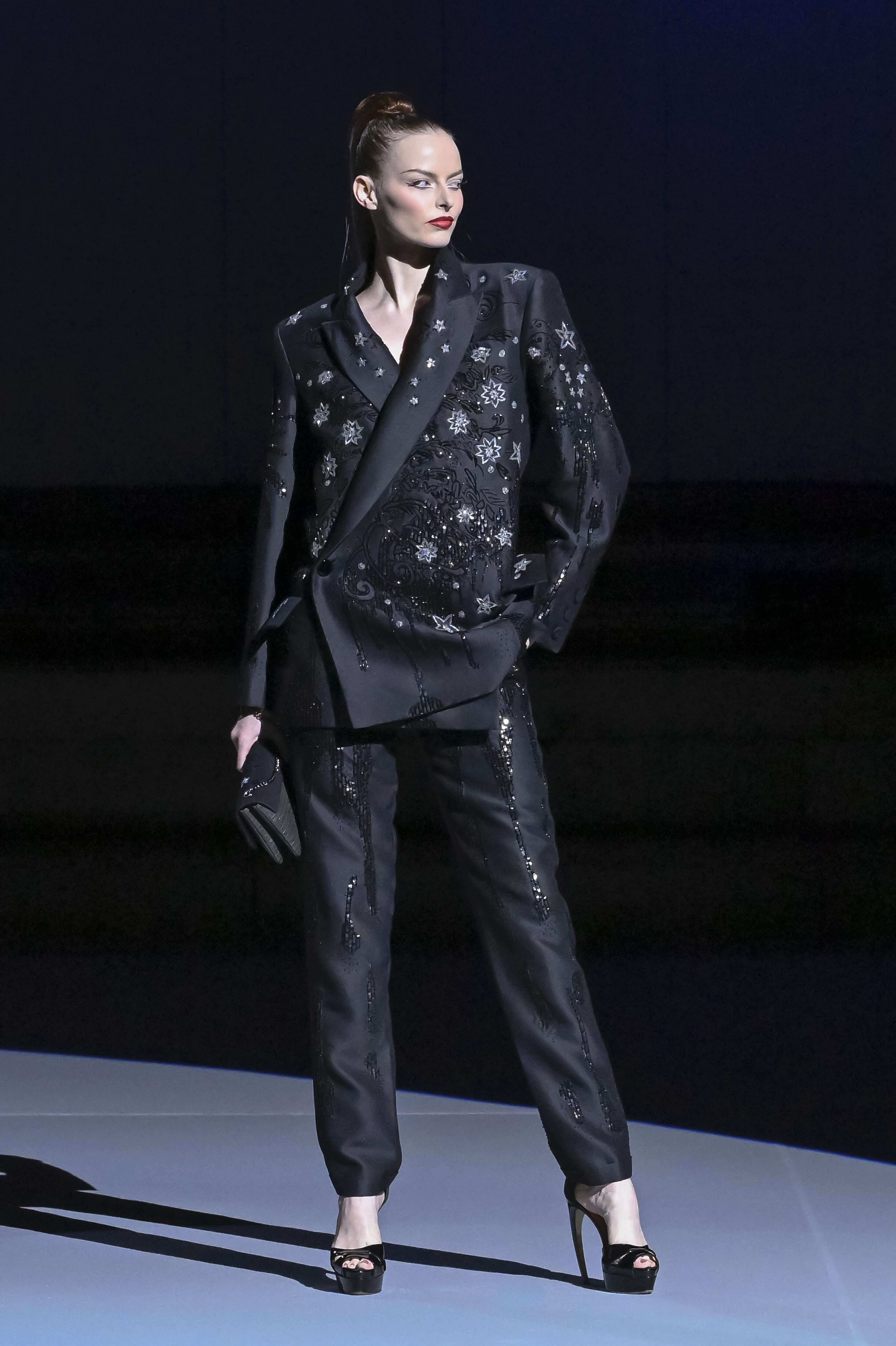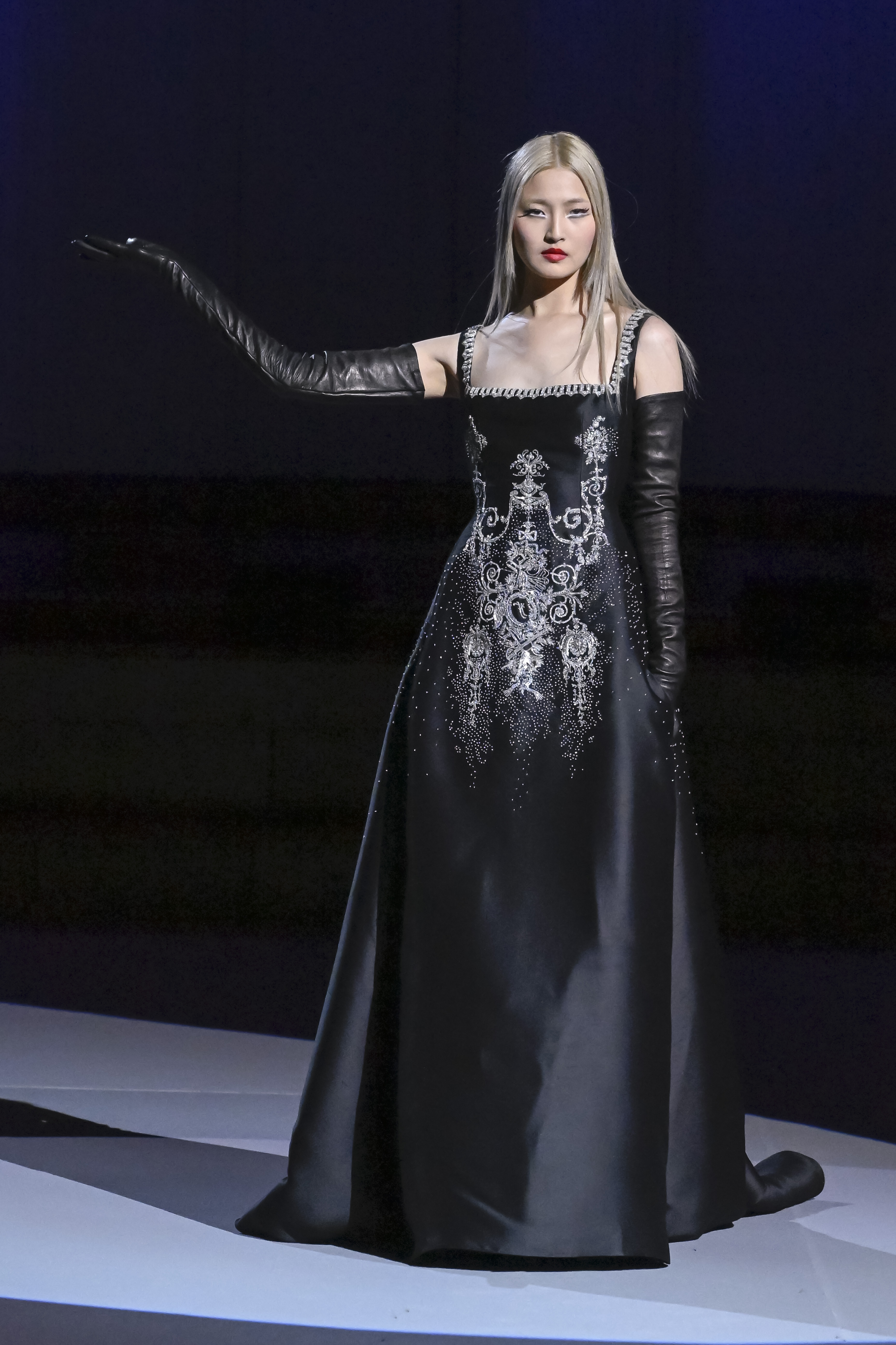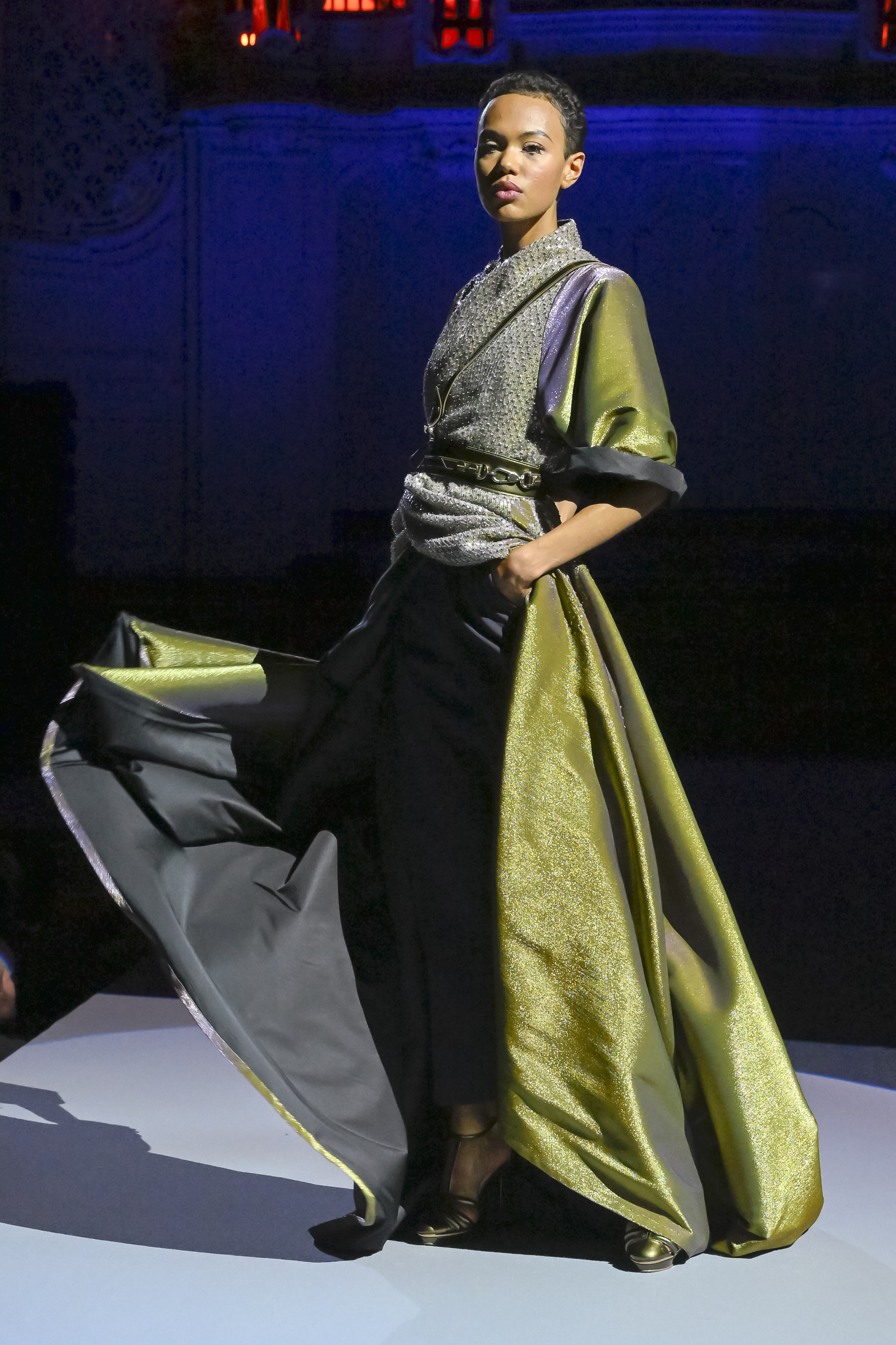 A battle of glitter takes place between the elaborate weaving of silk and lurex devoured by embroidery. Elsewhere, “cannetille”, a metal thread, adorns the collar of “oversize” jackets in silk dupioni, velvet or satin.