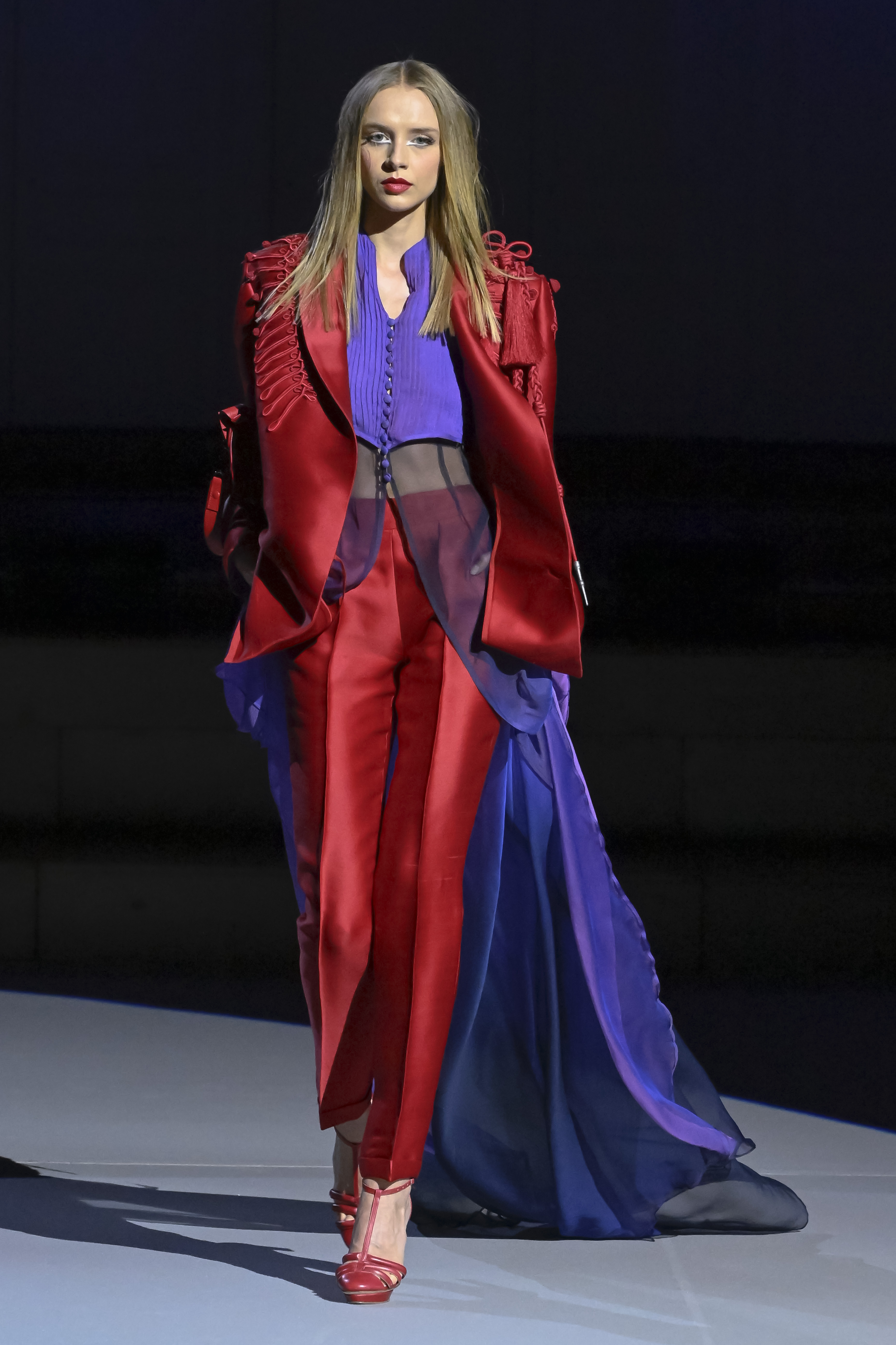 The French couturier achieves this by diverting the medals, trimmings and other ornaments from military pageantry on his outfits in a festive spirit. The officers’ braid silk trimmings and shoulder pads are displaying new colors, tassels are replacing medals, the stars in the generals' caps are invading the dresses for the the human race’s true defenders.