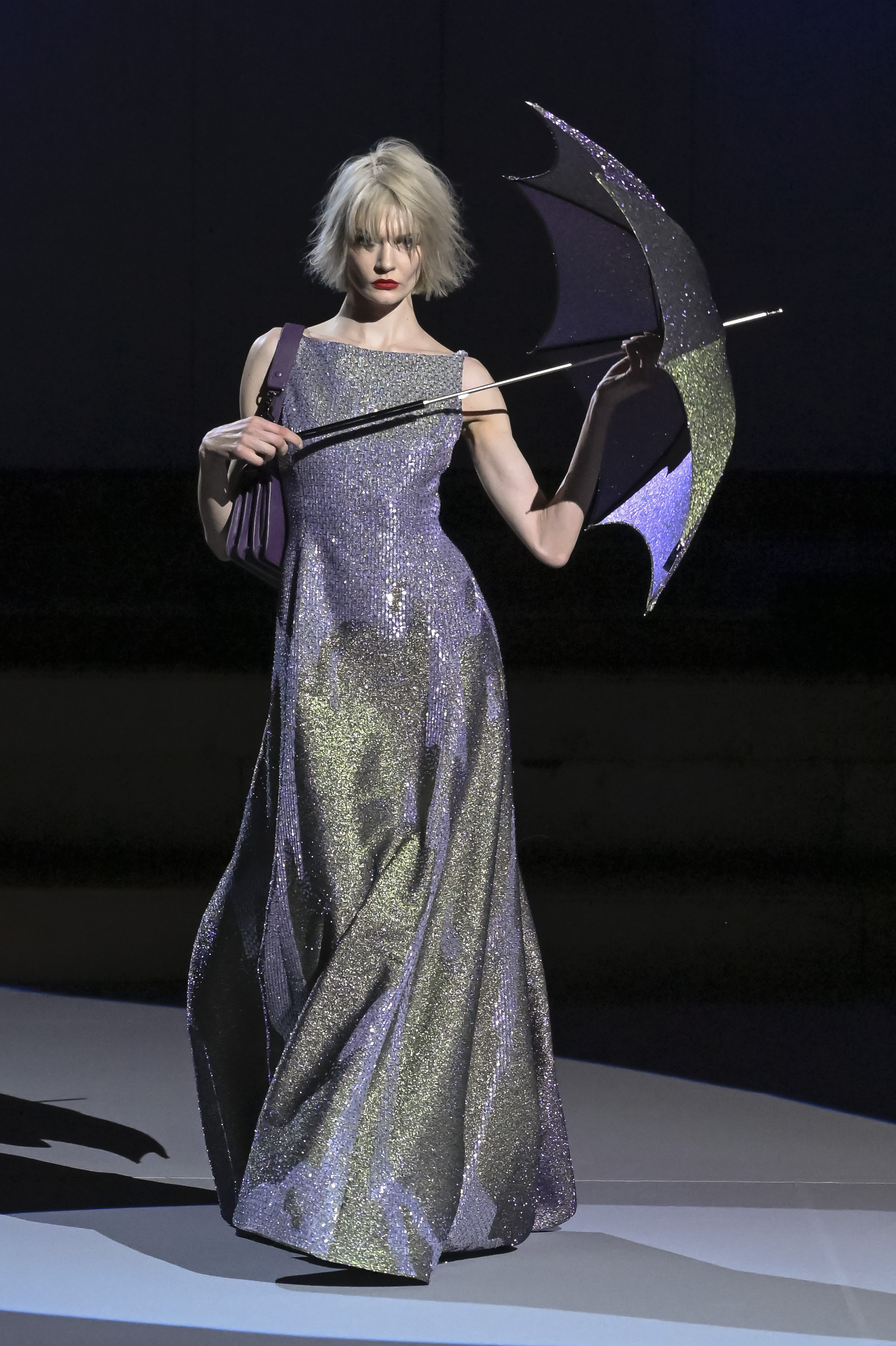 Khaki, lagoon blue, pink gold, purple, red make up the color palette of the season without forgetting black. Some shades are treated by Julien Fournié in a gradient, others in the almost disco glitter of lurex, further accentuated by shiny matching umbrellas.