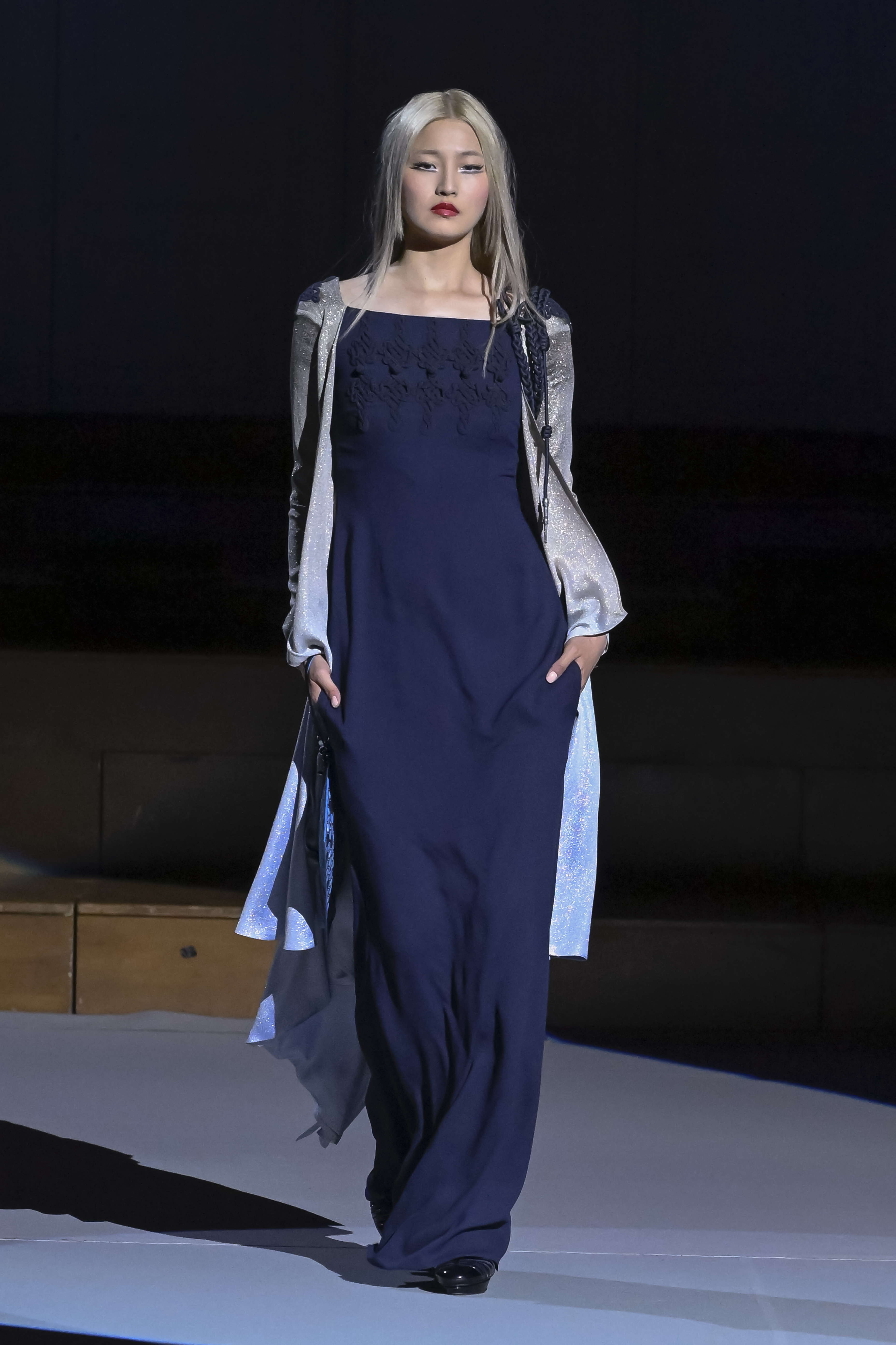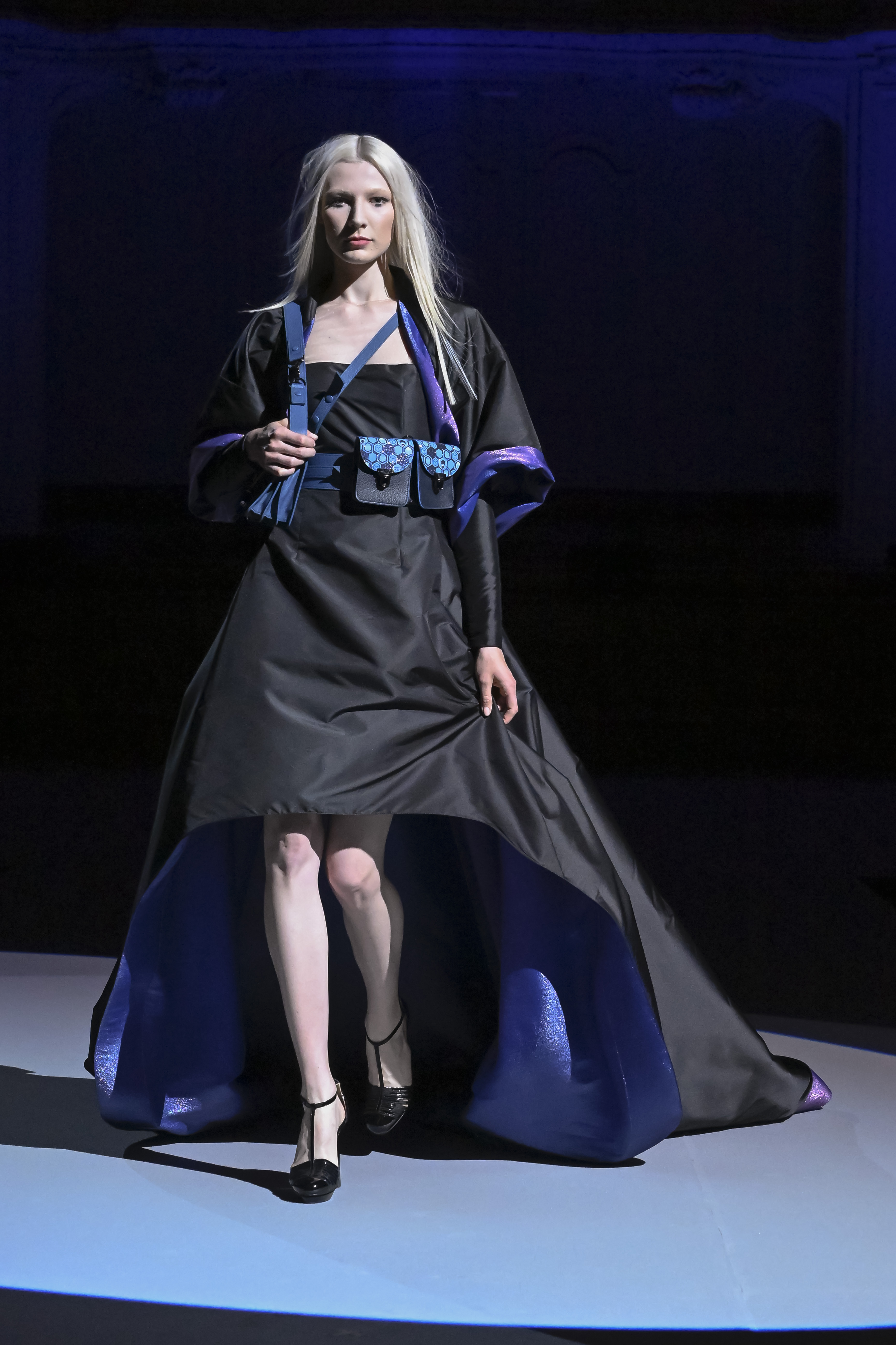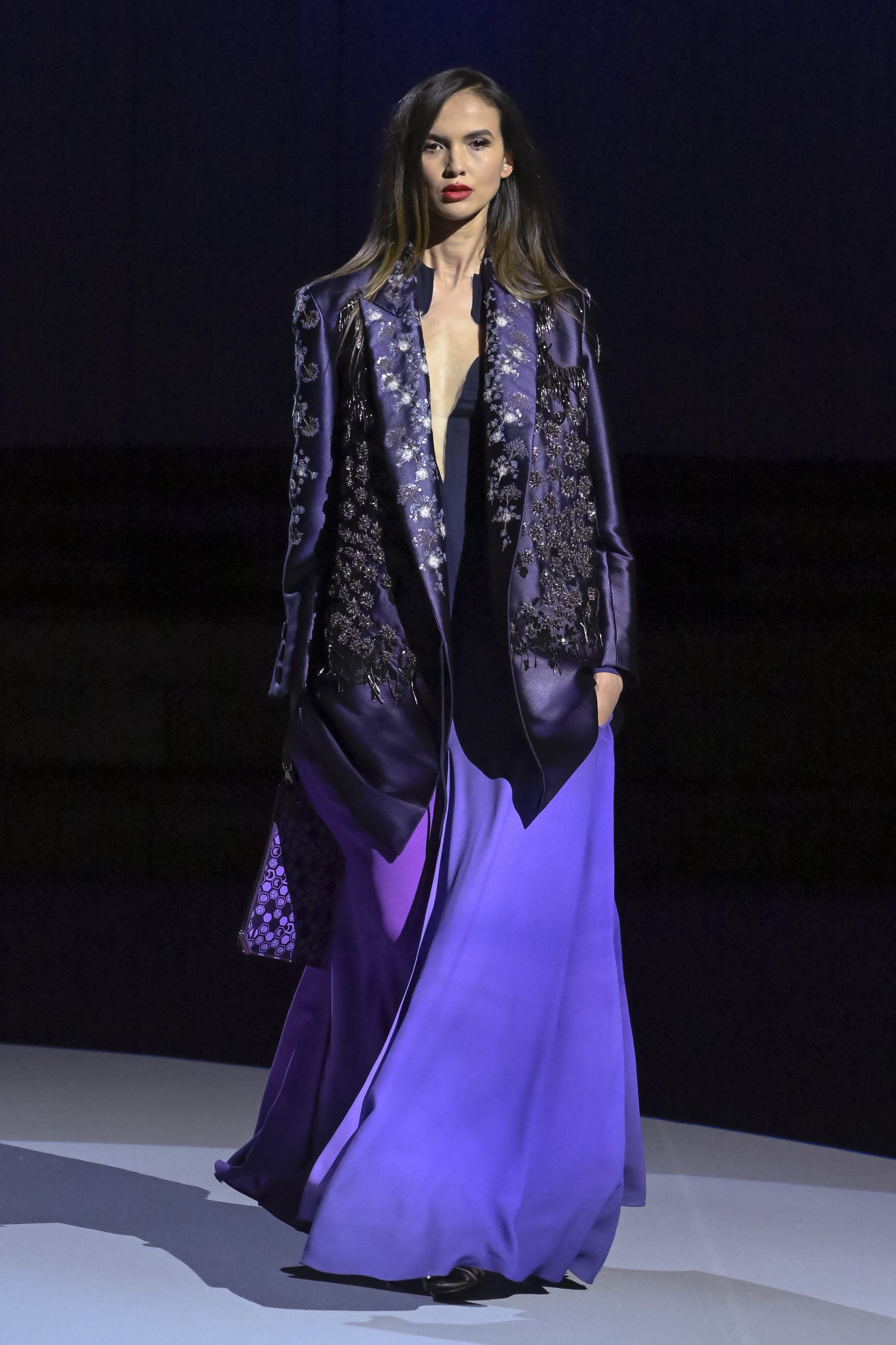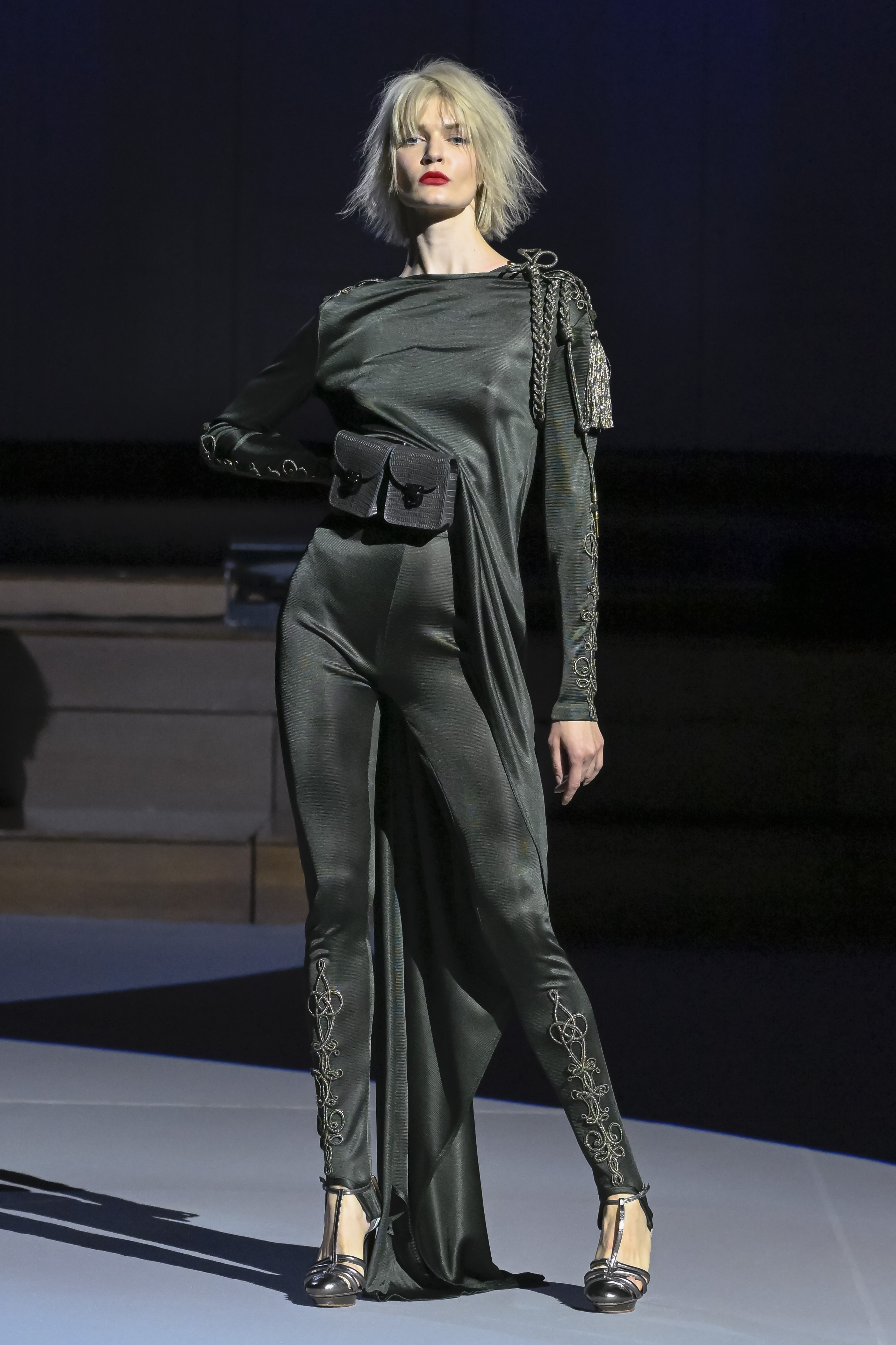 Loose coats stand out for their volume. Some are reminiscent of kimonos. The "flash" liners reveal the light they hide inside. Julien Fournié does not deny himself any inspiration, neither geographical nor historical. He has fun with chain mail (for certain embroidery) as well as with the 19th century frog fastenings of uniforms, with Samurai gear and 20th century wars soldiers’ outfits, with men's riding-coats and crinolines.