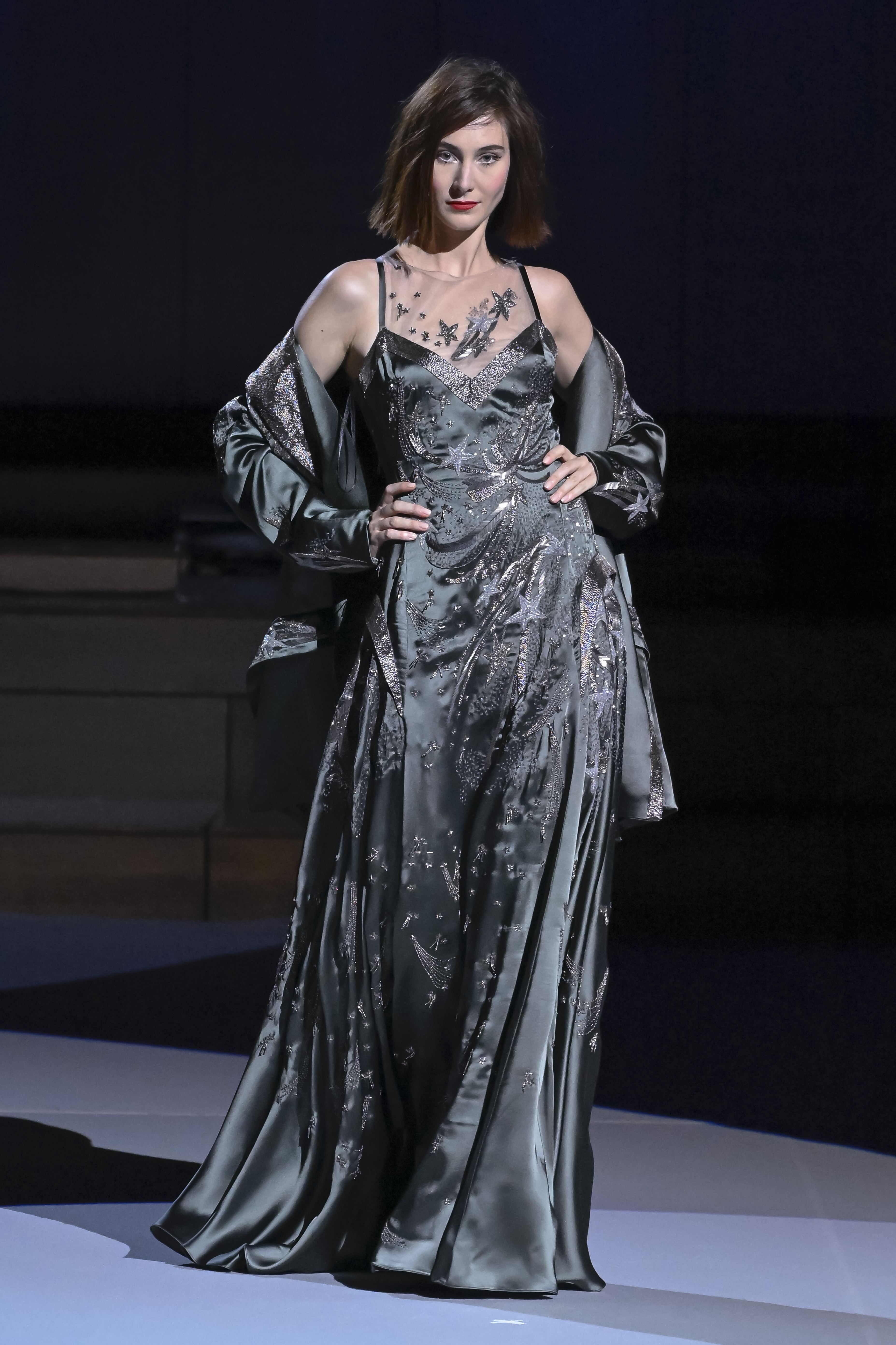 A dress with a cut inspired by the 1930s allows a casual behavior thanks to hidden pockets and a matching "boyish" jacket. The rich pewter-colored ensemble is entirely embroidered with crystal pearls and gunmetal thread.