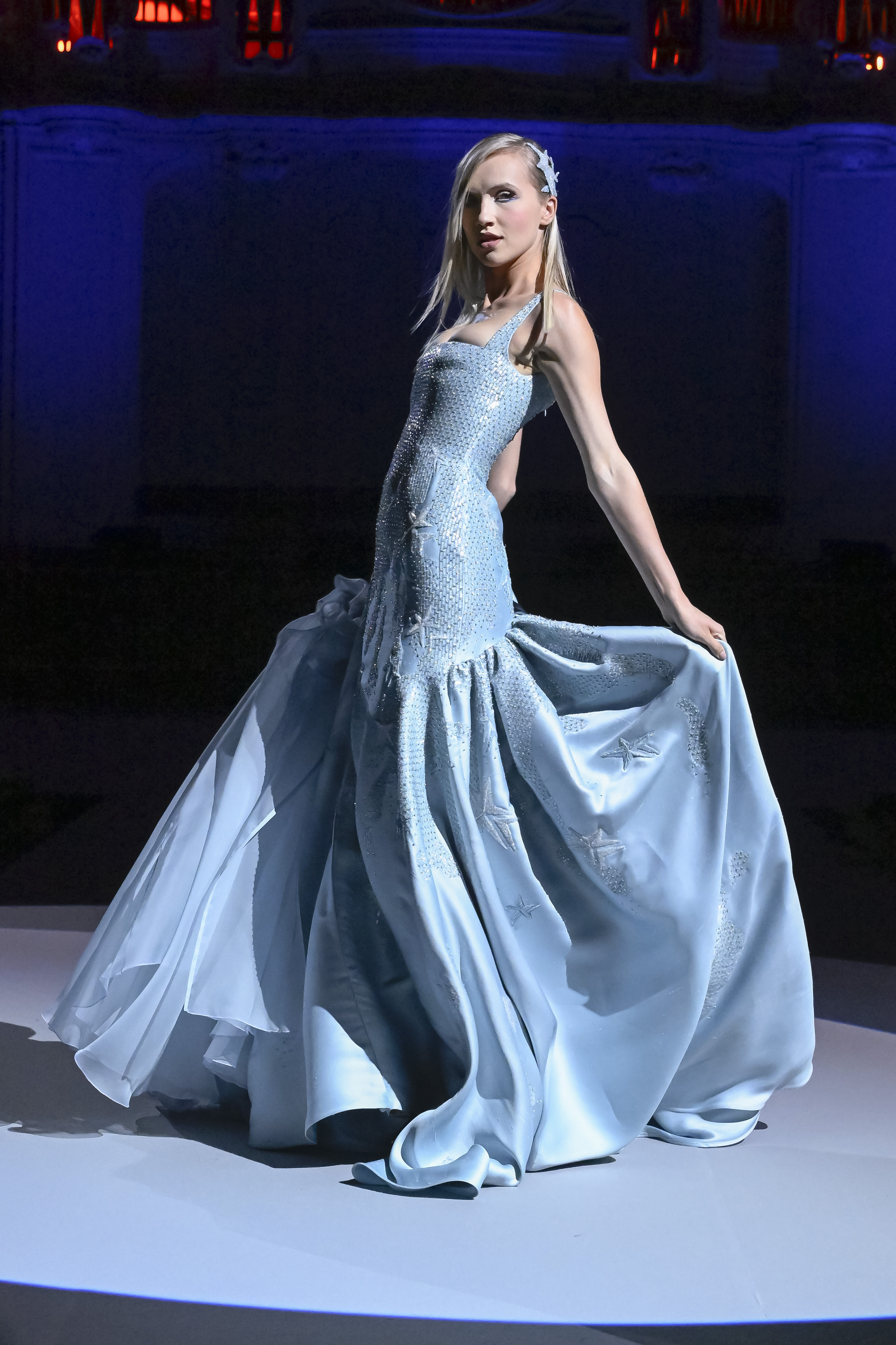 The bride, an archangel of sweetness, appears in her immaculate white silk coat, and reveals a dress adorned with dazzling silver stars. Sure, with her crystal crown, she is coming from another galaxy to transcend all the conflicts of the universe and remind mankind that we are only made of stardust.