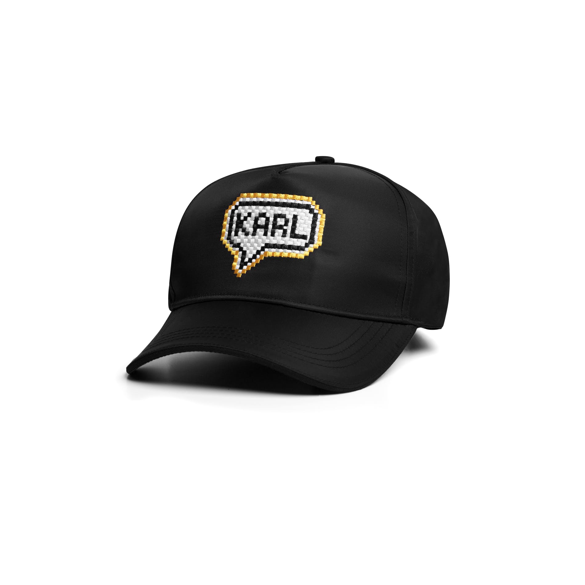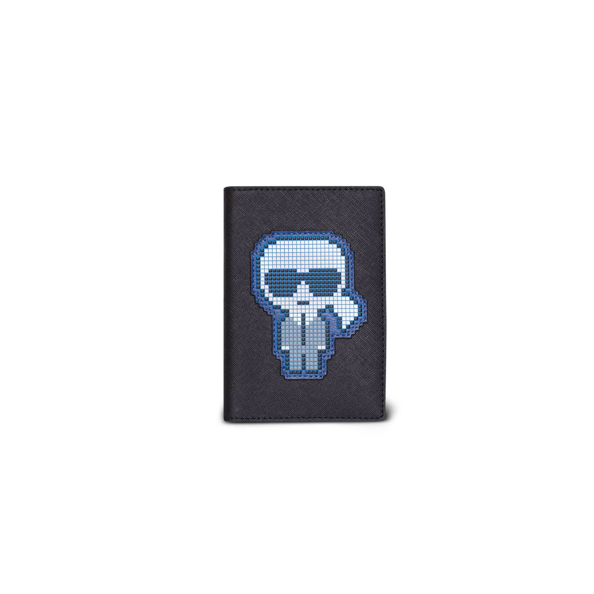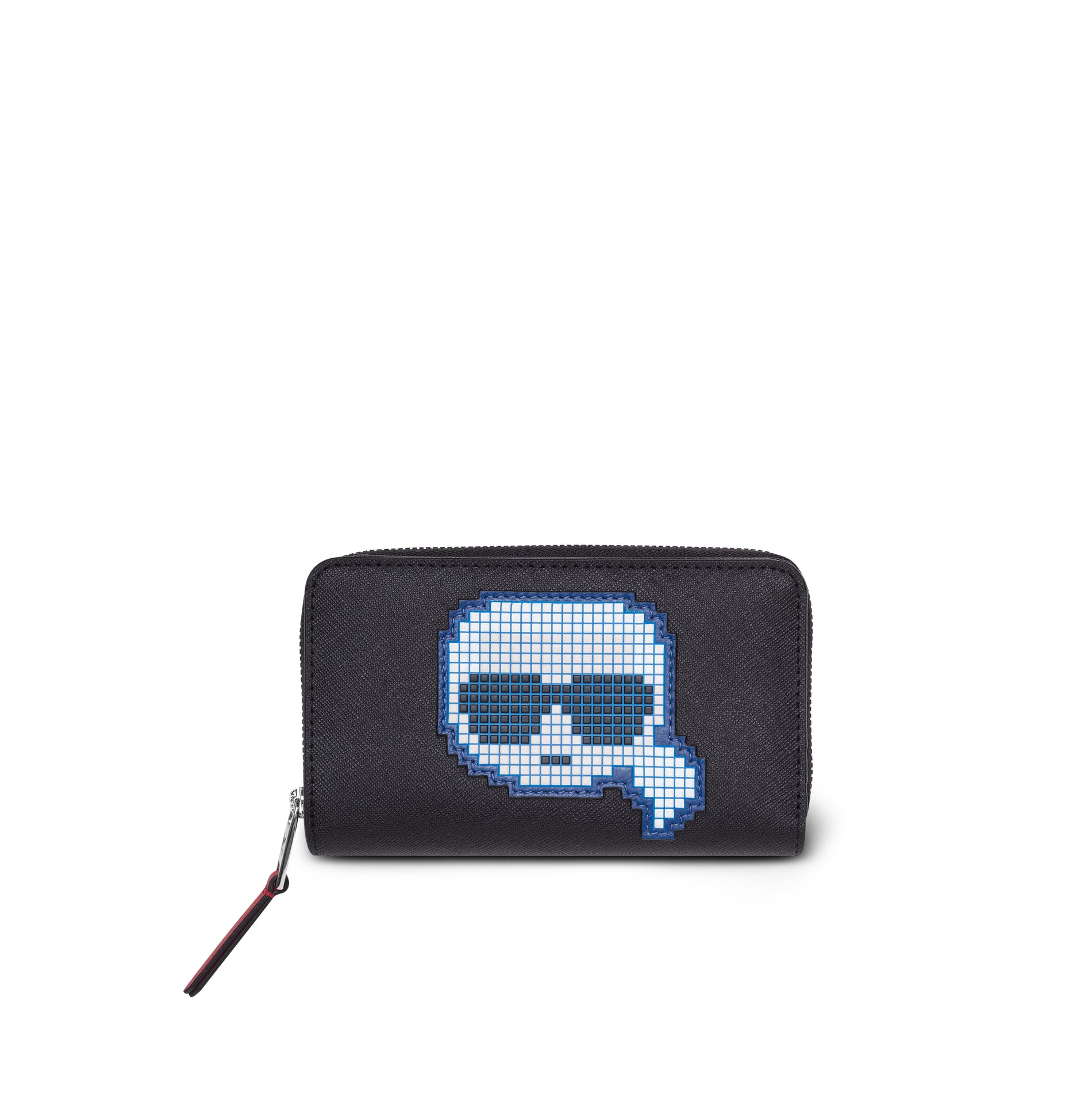 The accessories offering includes a range of playful styles. In textured leather, there’s a tote bag, small and medium top handle bags with removable shoulder straps, and a large textured leather pouch — all with pixelated artworks of Karl. Crafted from versatile nylon, there’s a backpack, a bumbag, and a tote with a functional QR code which links to KARL.COM when scanned with a mobile device. The collection further includes a passport holder, a zip wallet, a cap, a two-pack of socks and a keychain.