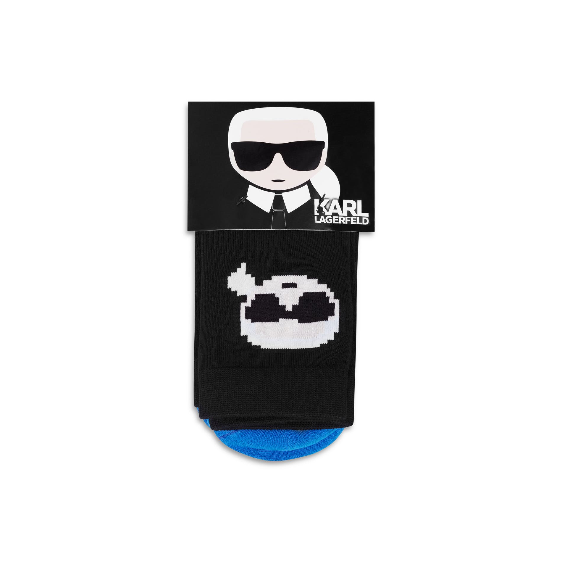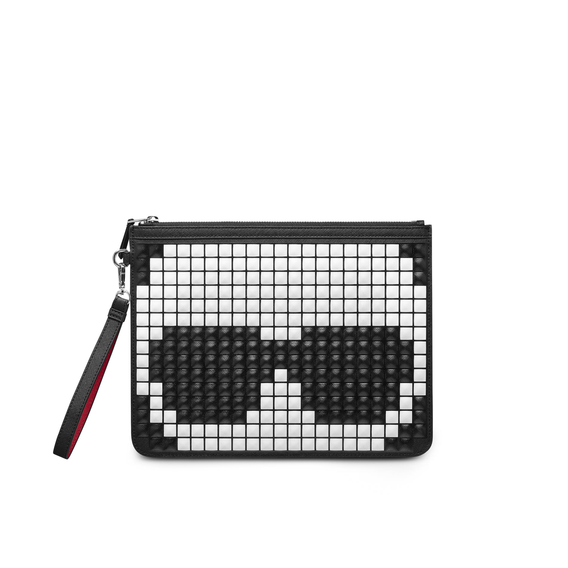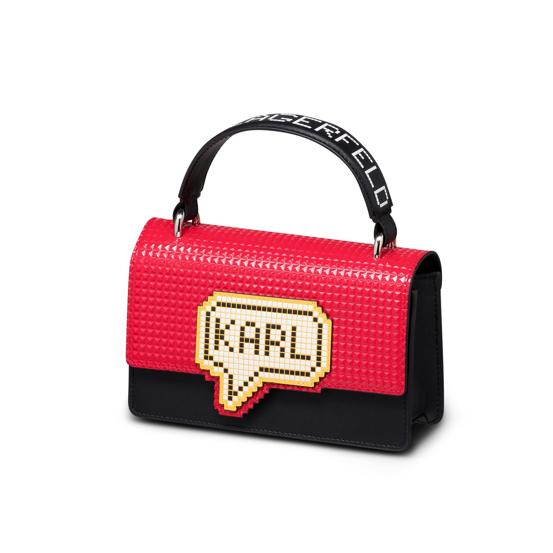 The accessories offering includes a range of playful styles. In textured leather, there’s a tote bag, small and medium top handle bags with removable shoulder straps, and a large textured leather pouch — all with pixelated artworks of Karl. Crafted from versatile nylon, there’s a backpack, a bumbag, and a tote with a functional QR code which links to KARL.COM when scanned with a mobile device. The collection further includes a passport holder, a zip wallet, a cap, a two-pack of socks and a keychain.