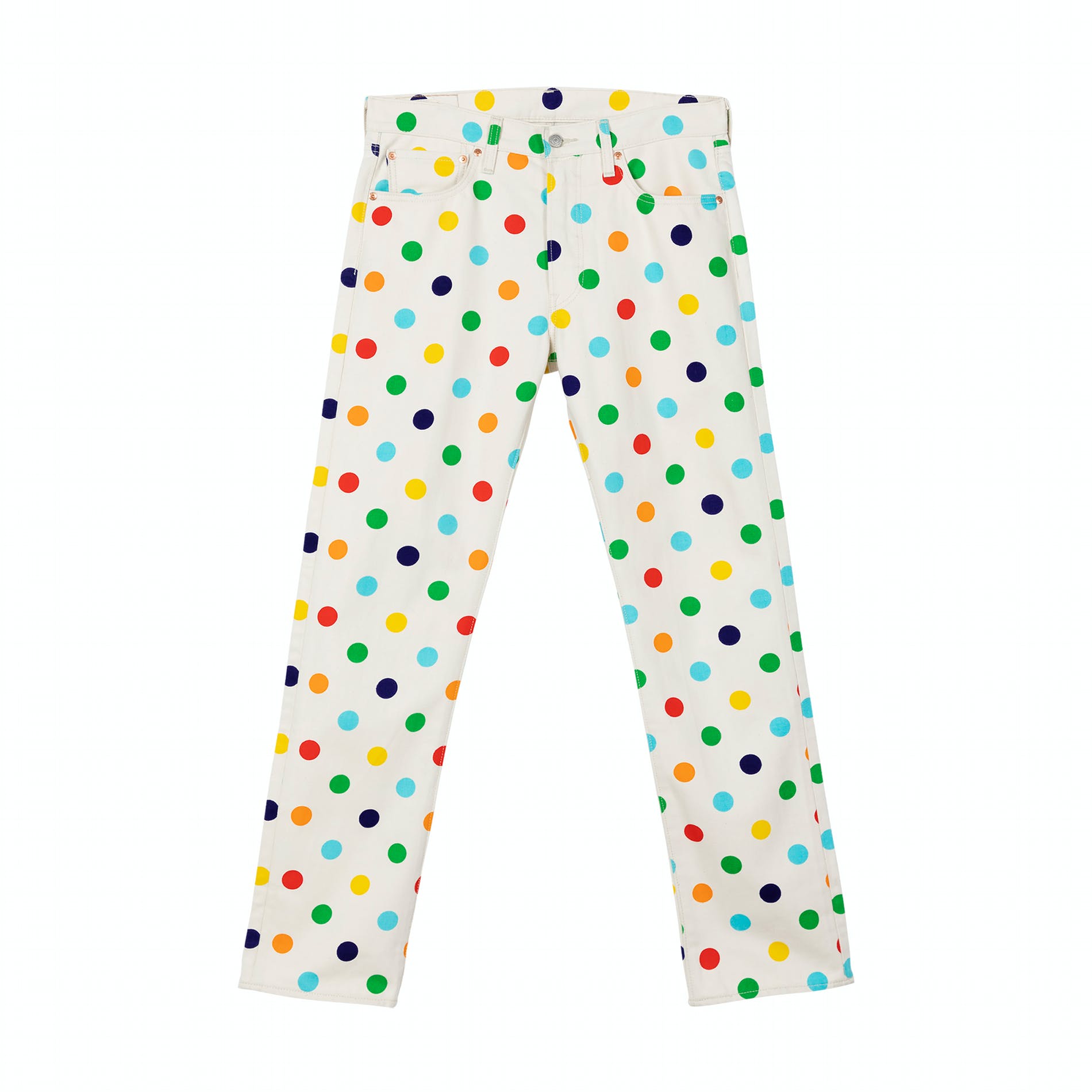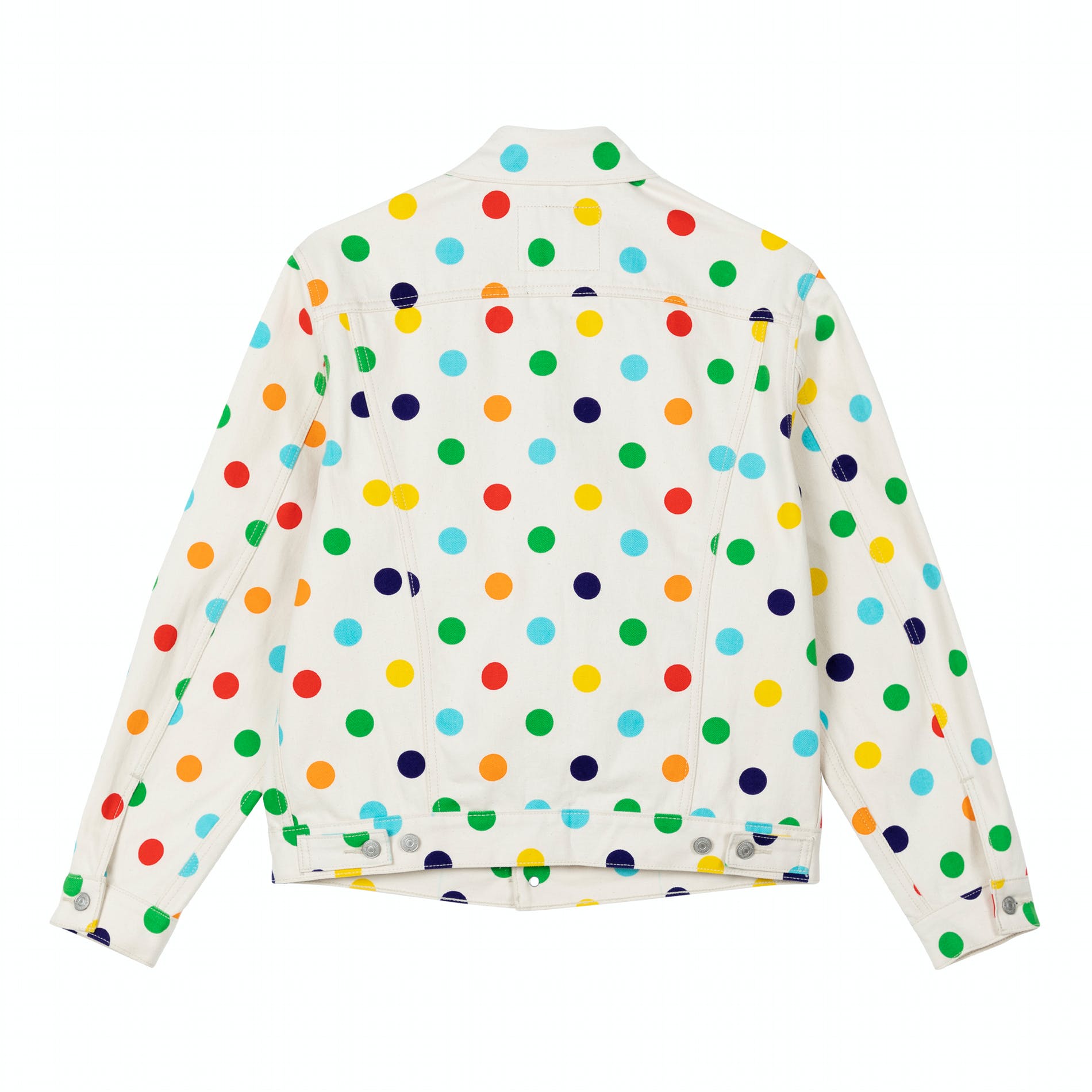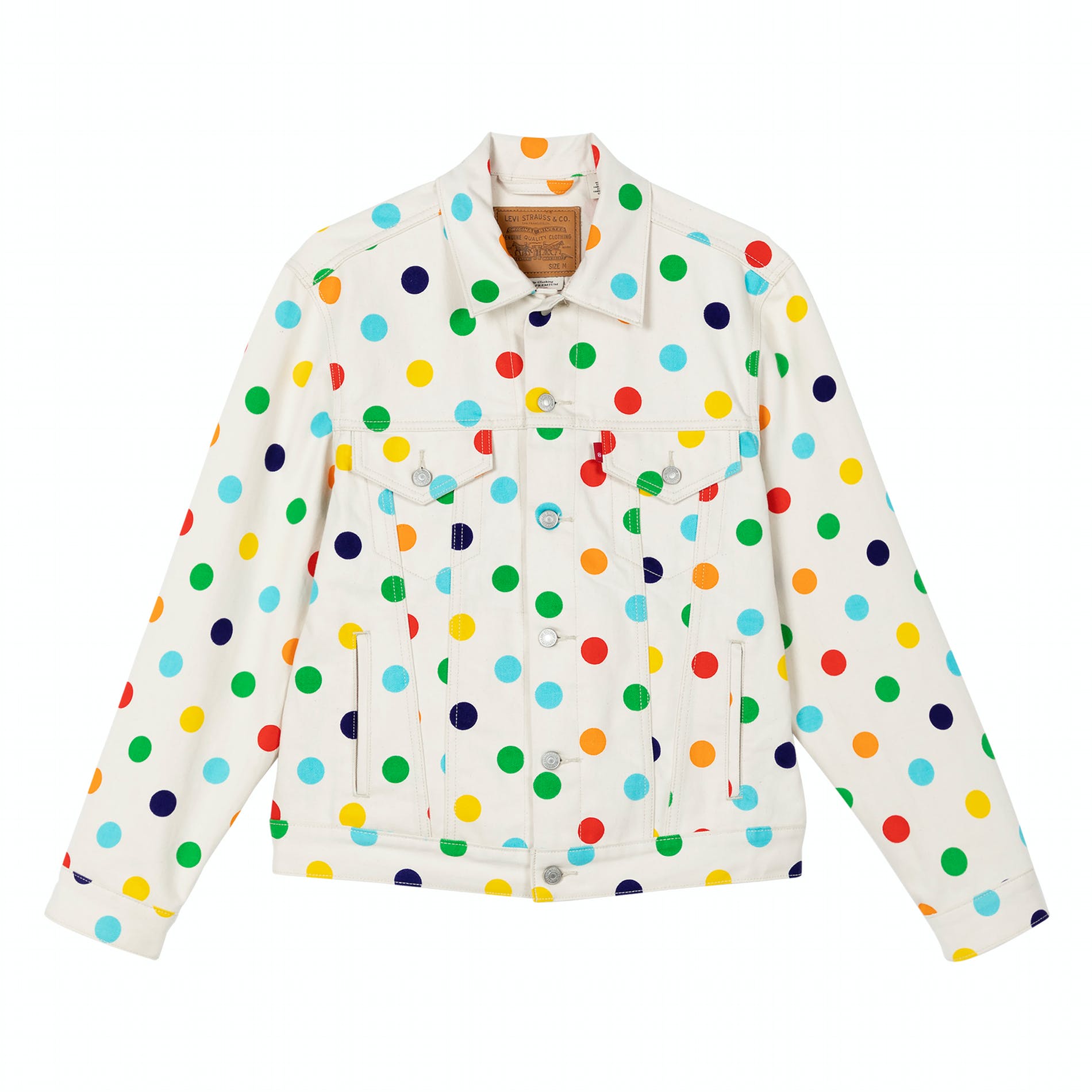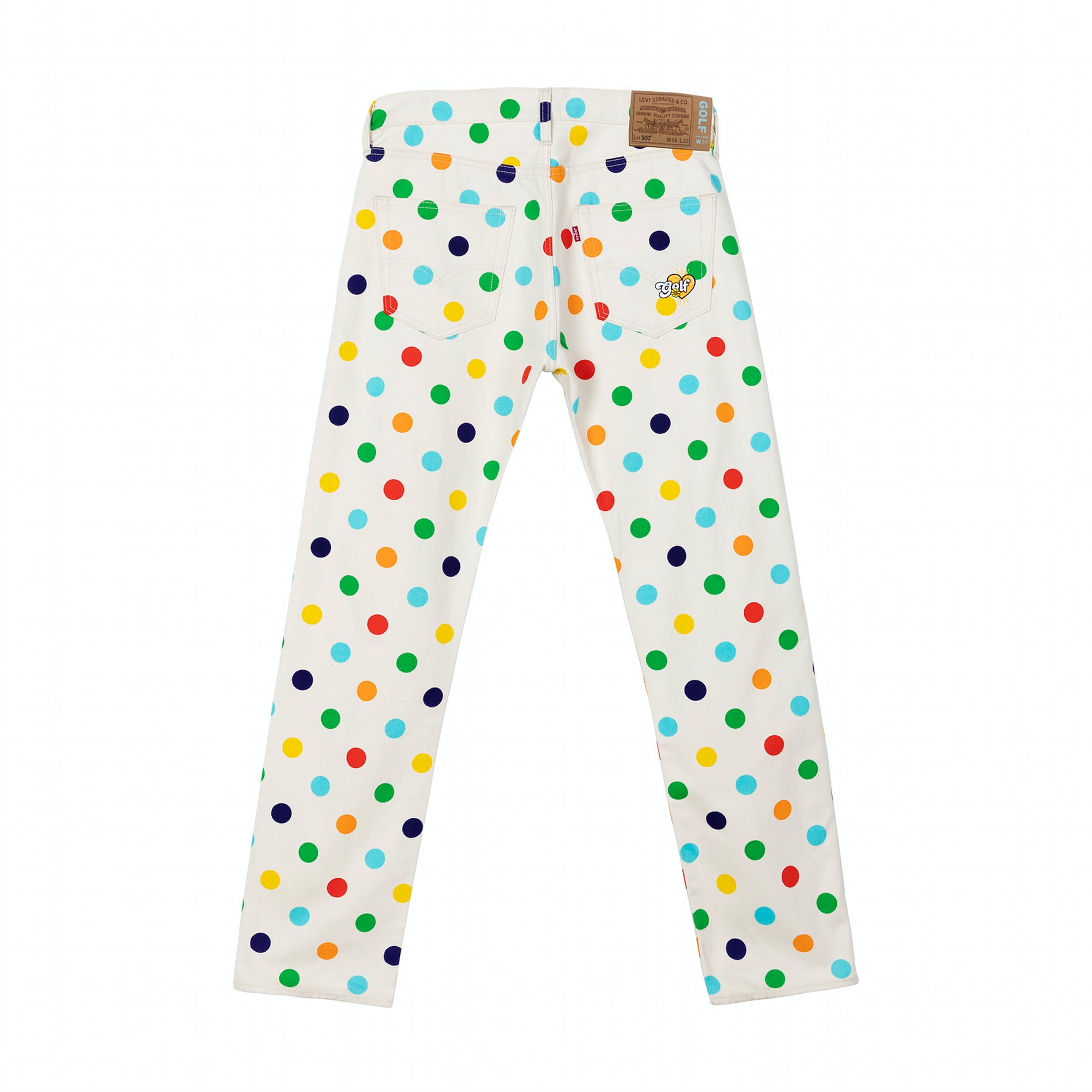 Releasing in celebration of Levi’s® 501® Day 2020, the Levi’s® x GOLF collection features a colorful take on the classic Levi’s® 501® jean and Trucker Jacket hookup. Inspired by a rainbow polka-dot jean that was first created for the 2016 GOLF WANG runway show, this collection includes a 501® ‘93 jean and vintage fit Trucker in ecru denim, both of which come covered in a rainbow print polka dot pattern. It’s a mix of classic Levi’s® and the distinct aesthetic of GOLF WANG. With a boxier, higher waist fit on the 501® 93’ jean, the straight leg vintage-inspired silhouette perfectly suits a baggier style. Also featured on both the 501® ’93 and the Trucker Jacket is a special edition co-branded back patch. To reflect the concept of sizing up for a slouchier 501®, the 501® ‘93 jean features both Levi’s® sizing and GOLF sizing (in blue) on the back patch — creating a custom fit that Levi’s® and GOLF WANG agree best embodied their vision for the 501®.