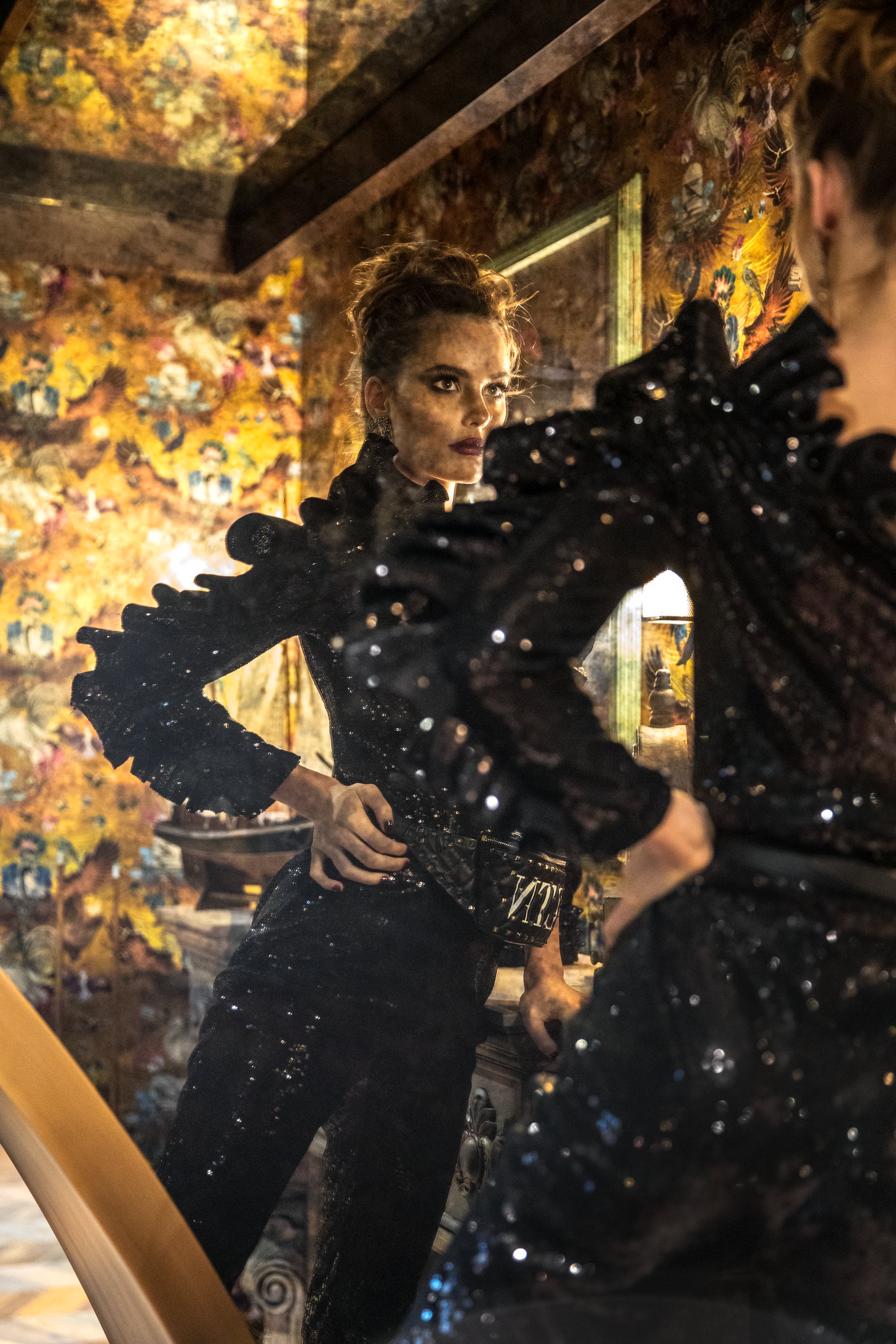 Sequin jumpsuit: SemSem.com, Crystal earrings: Jennifer Behr @ Boom & Mellow.com, Leather belt bag: Valentino, Suede boots: Valentino.