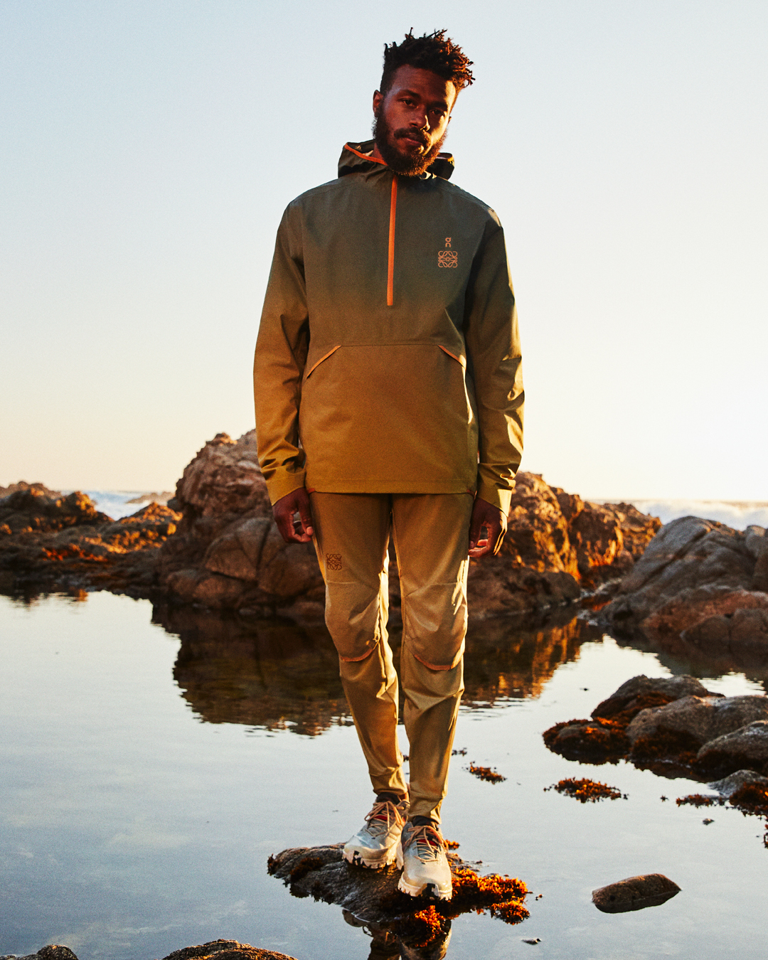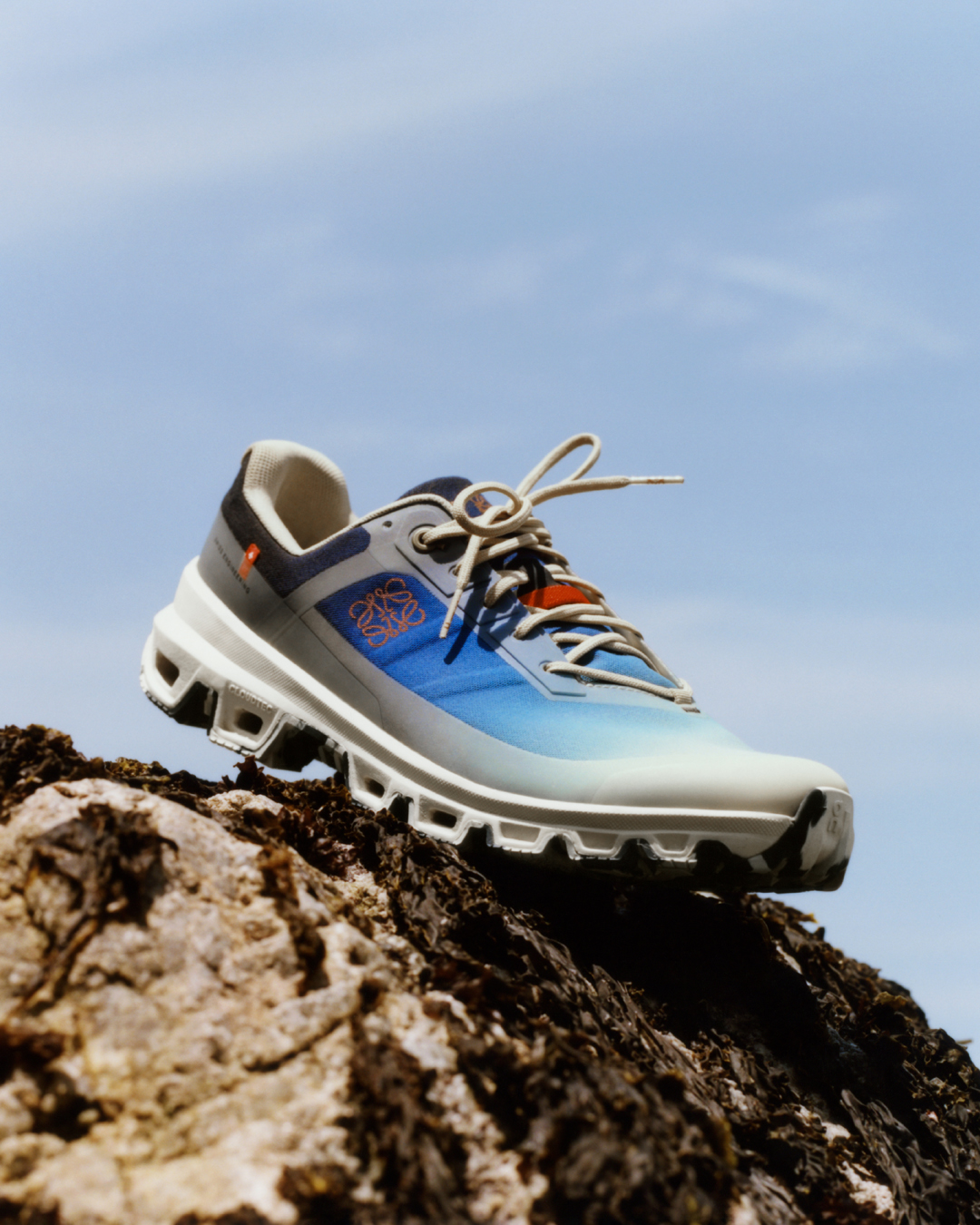 Crafted for city life the great outdoors, the collection features LOEWE editions of On’s iconic Cloudventure and Cloudrock performance shoes for both men and women. Available in five colourways —Gradient Khaki, Gradient Grey, Gradient Blue, Gradient Orange and Space Blue— the shoes feature both On’s trademark technologies, the Missiongrip™ rubber outsole and the Speedboard™ mid-sole hidden plate, as well as a recycled polyester upper, hand-pressed marbled outsoles, brass eyelets and a matte or iridescent mudguard. Outdoor footwear is paired with six ready-to-wear pieces for women and seven for men, each built with a unique blend of performance properties and key On features— weatheradaptable Running Pants, a moisture-wicking Waterproof Anorak, temperature regulating Performance-T t-shirts and a unisex customizable insulation three-layer Parka.