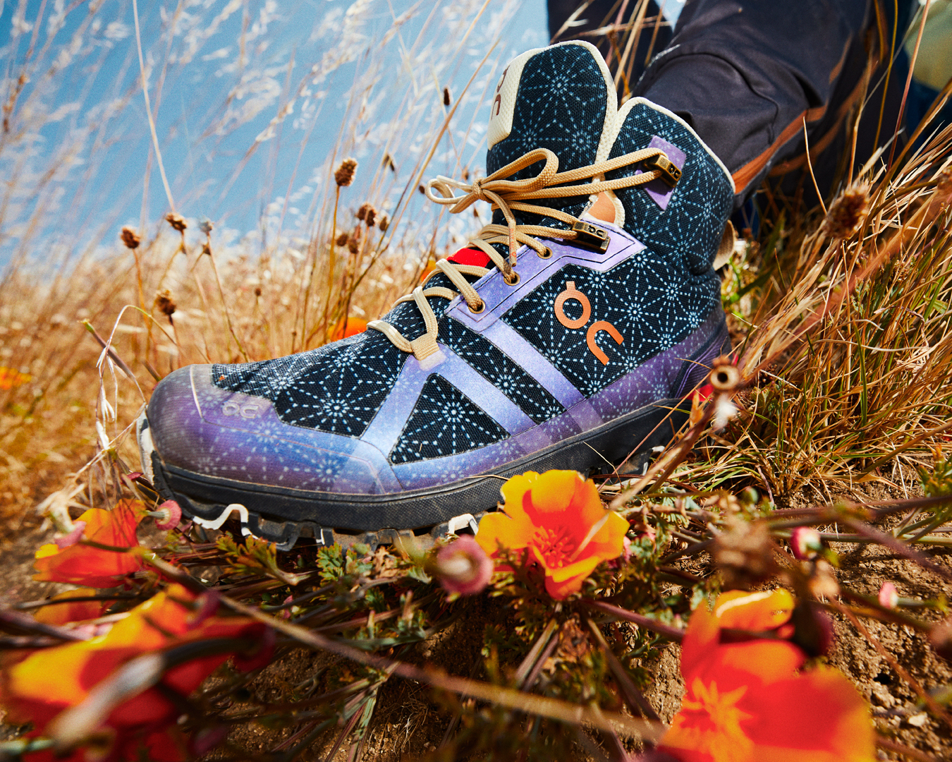 Each of the ready-to-wear pieces are available in two colourways for each gender: an organic palette of khaki, blue and orange that takes inspiration from nature, applied in gradient effects that suggest prolonged exposure to the elements en plein air. These effects, as well as the Japanese sashiko-inspired needlework print that resembles a starry night, are the result of a meticulous technical process to craft the perfect colour and pattern. To ensure that the printed gradients match across all components of each item, the finishing process is carried out by hand, just as the marble effect soles are processed individually and manually, making each shoe unique. The use of recycled polyester is extensive in order for production to be responsible, and even the packaging is recycled.