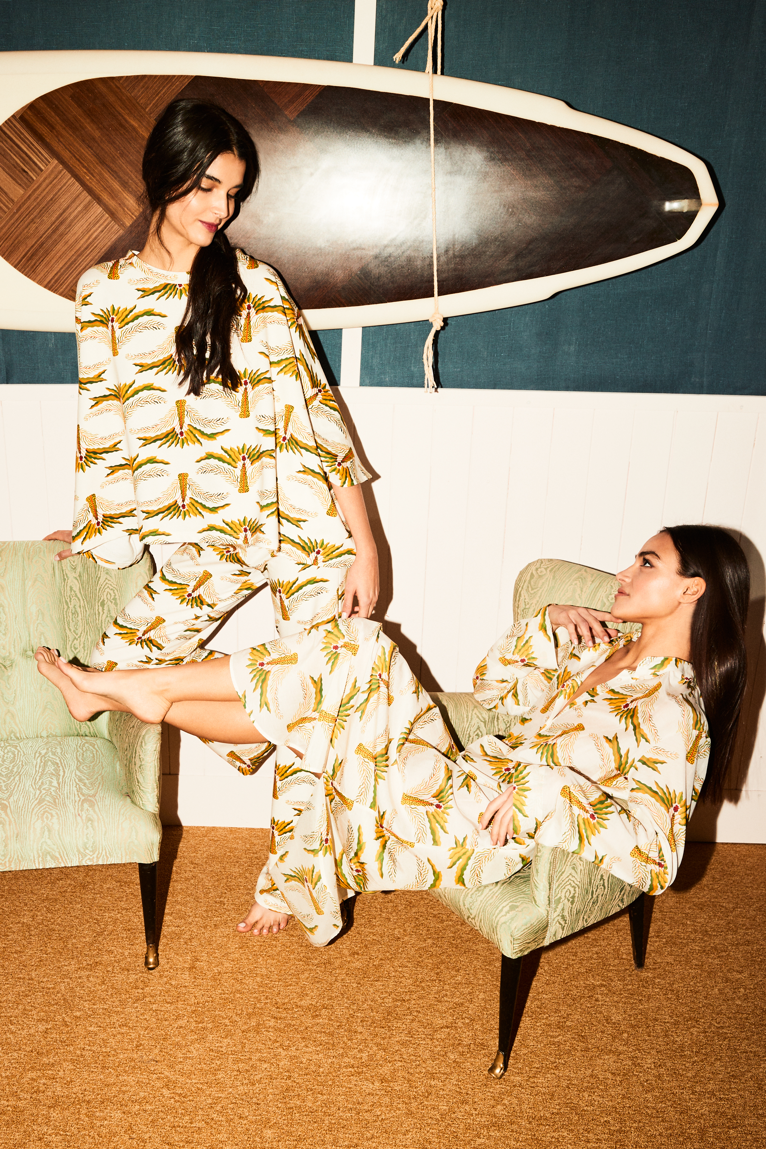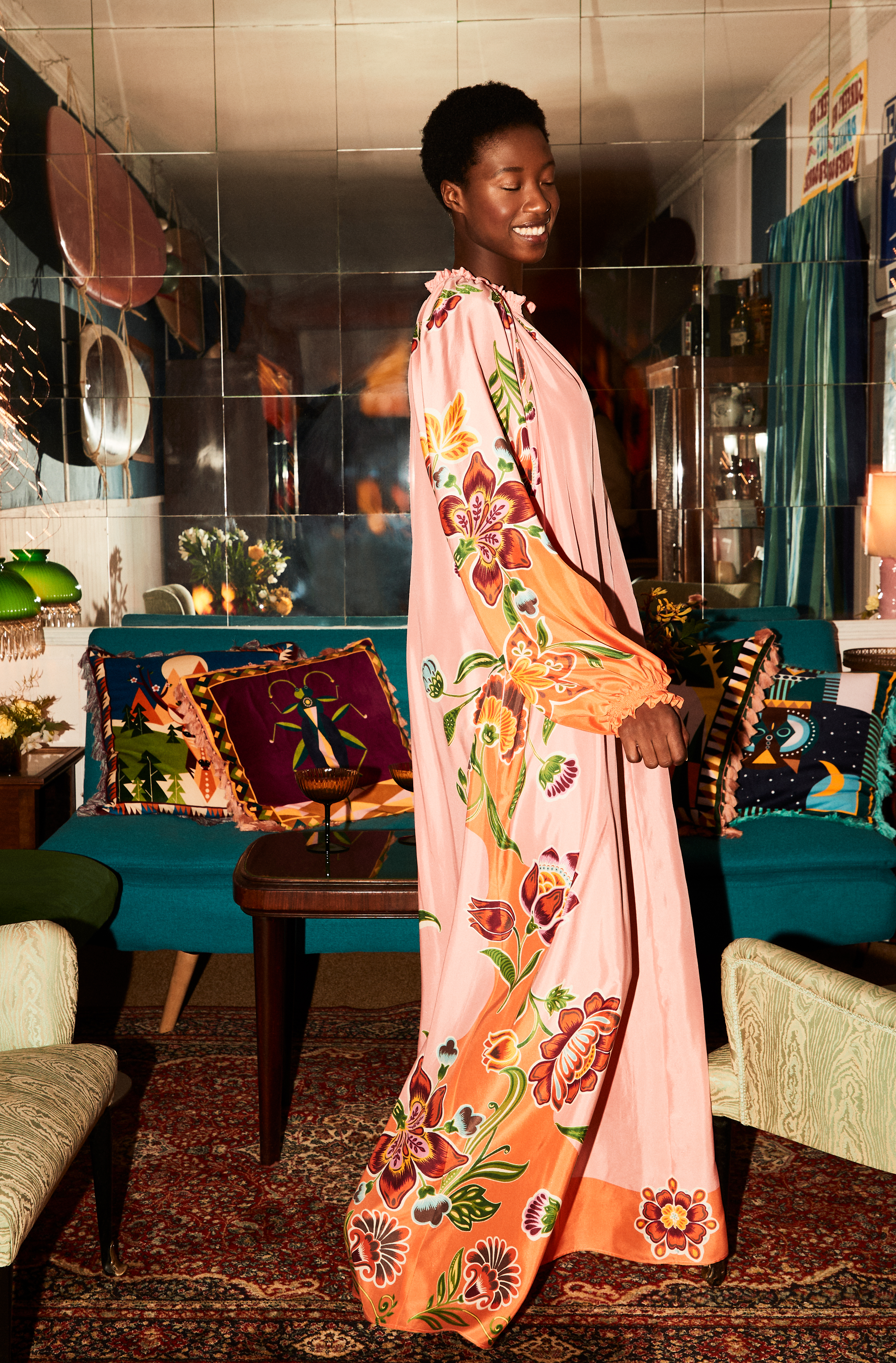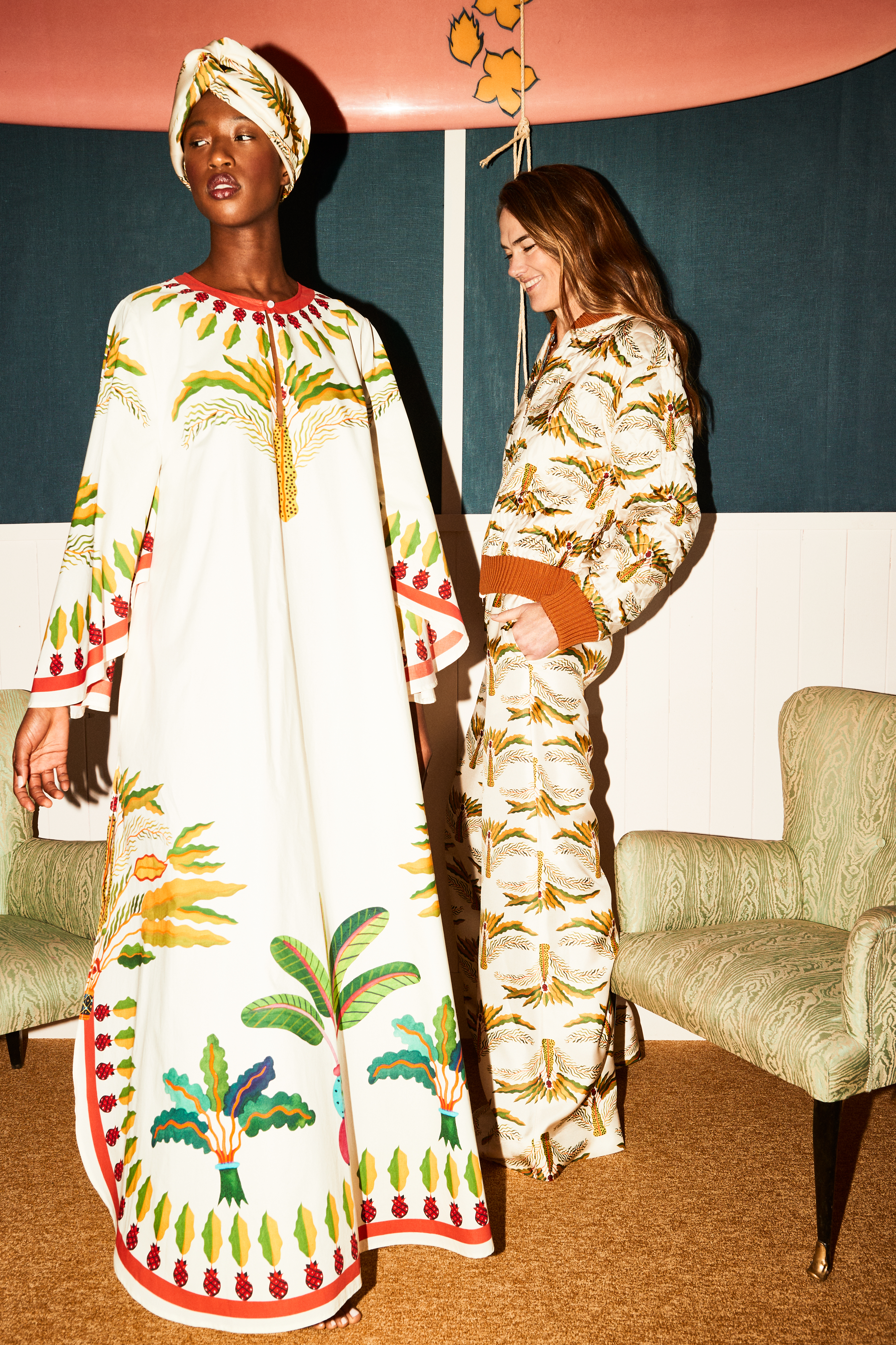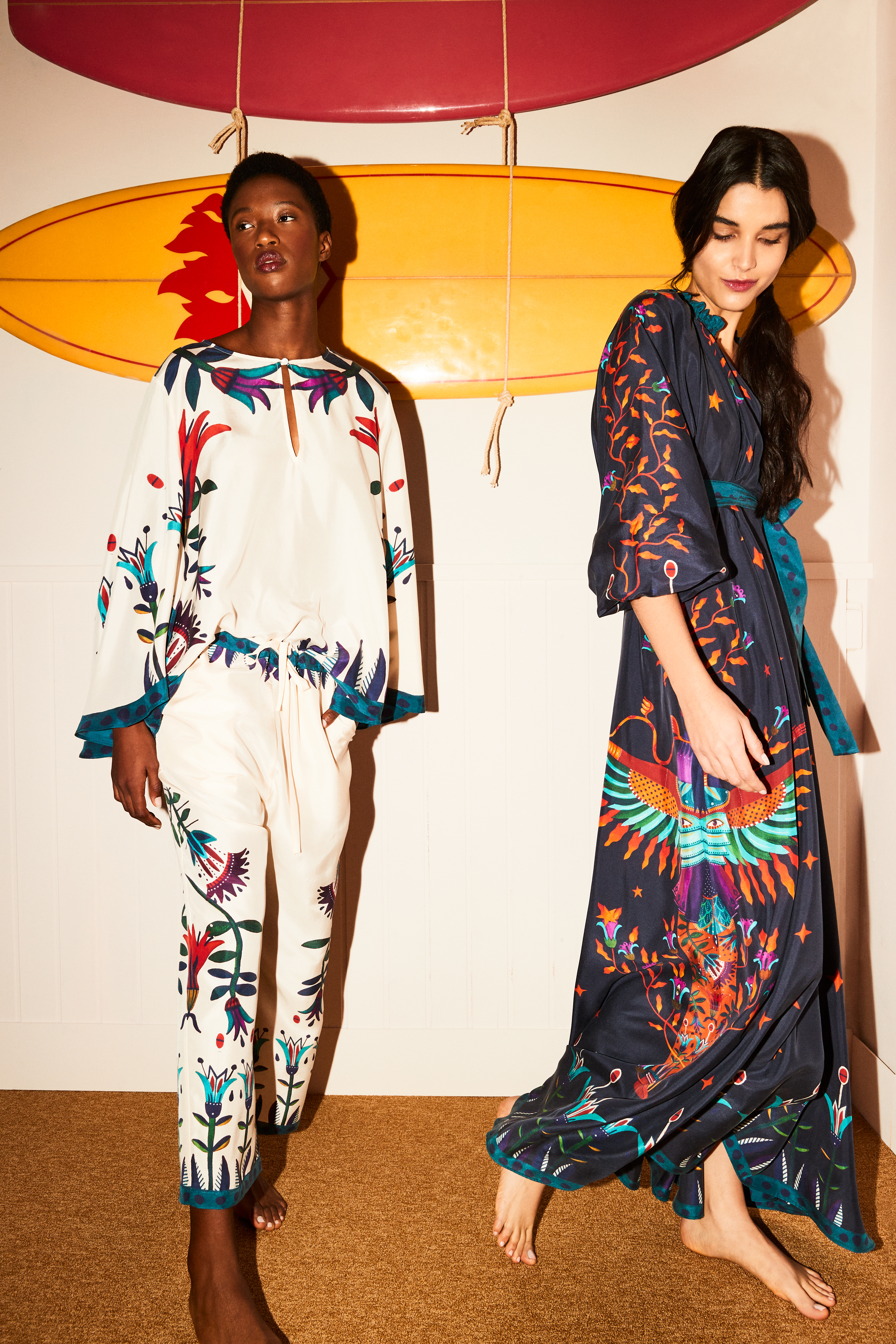 Blending bohemian romanticism with La DoubleJ’s bold prints, this season’s standout ceremony pieces arrive in a host of highly precious fabrications. Petite party-goers will enjoy the thigh-skimming Gatsby Dress, a show-stopper in feathers and our new sequined Faille, while the dramatists can make their entrance in the corseted Gypsy Dress, which arrives in sheer velvet Devore, our most decadent fabrication to date. Versatility is the vibe for many of our statement pieces, such as the creamy-textured silk voile Cerere Dress, and the silky Square Kaftan, which can both be belted for a cinched silhouette, or left open at the whim of the wearer. The theme of retro radiance continues at the after-party, where the sequined Faille Disco Trousers and My Dress pull focus on the dancefloor, and onlookers channel old-school cool in the Drawstring Silk Pants and matching Silky Sweatshirt.
